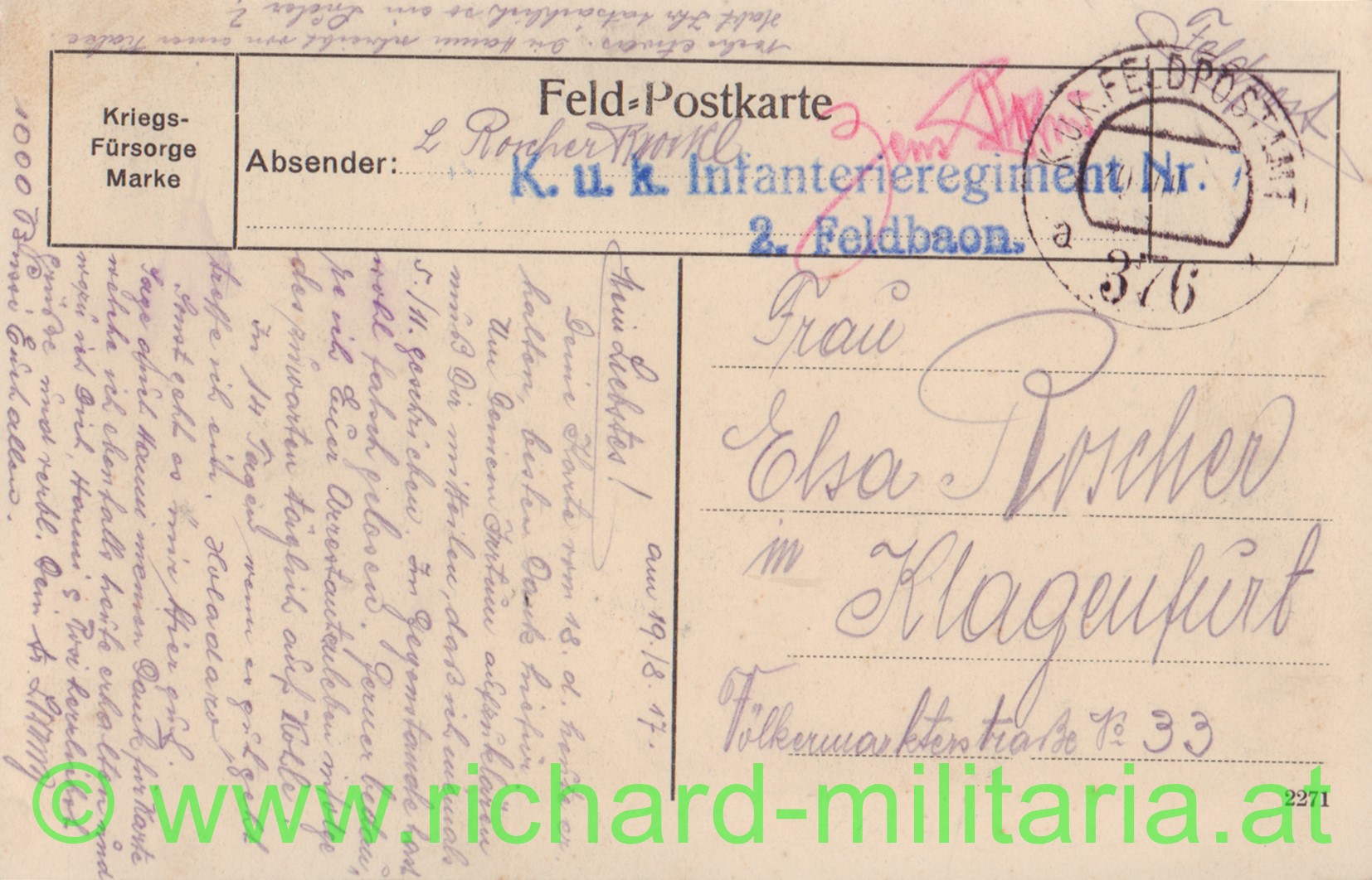 k.u.k. PK - IR 7 / 2. Feldbaon - Khevenhüller Wacht - Kärnten, Postkartenformat, gelaufen, Klagenfurt, sehr guter Zustand