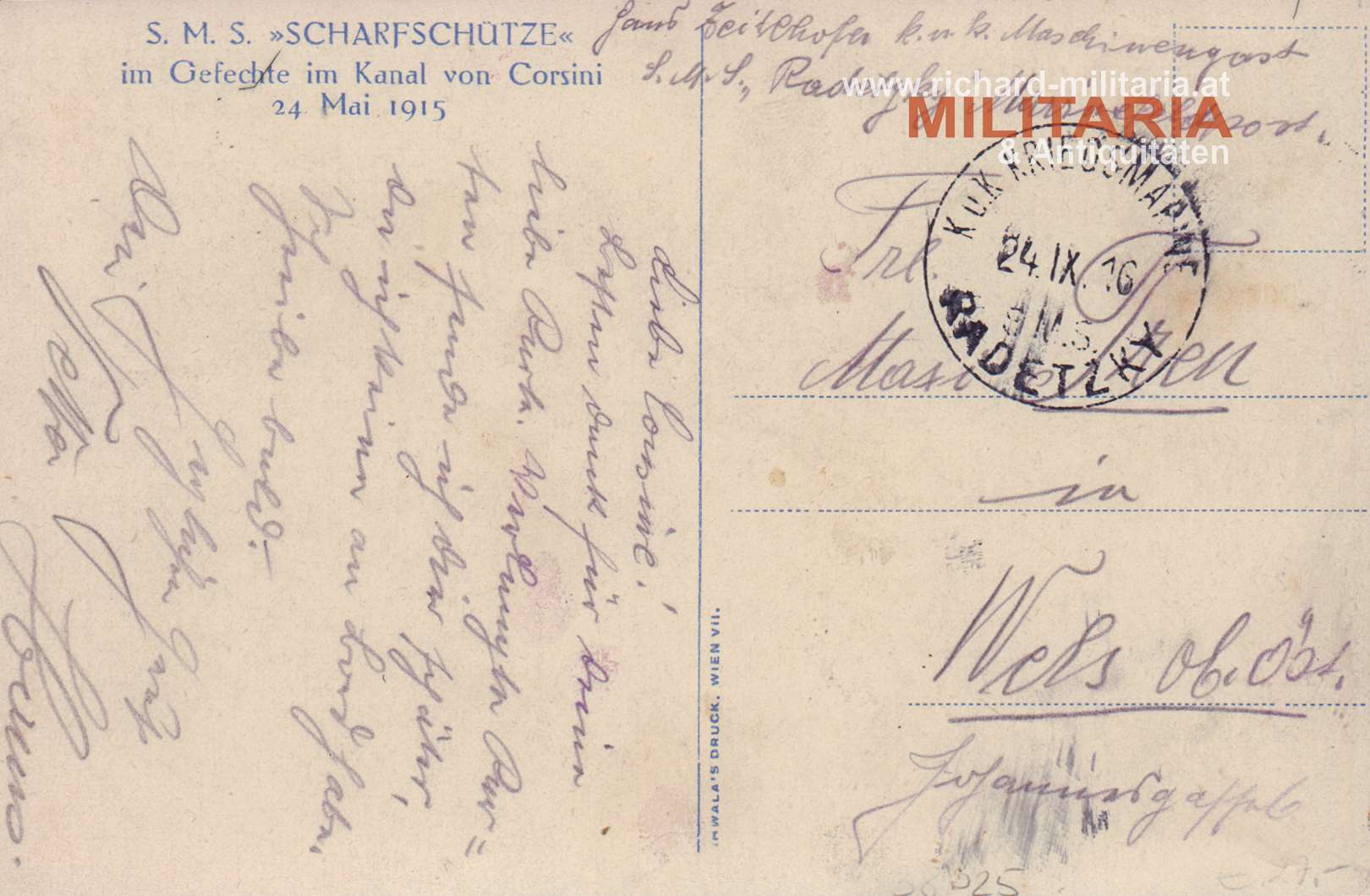 k.u.k. PK - S.M.S. Scharfschütze im Gefecht im Kanal von Corsini am 24. Mai 1915; mit Bordstempel der SMS RADETZKY;