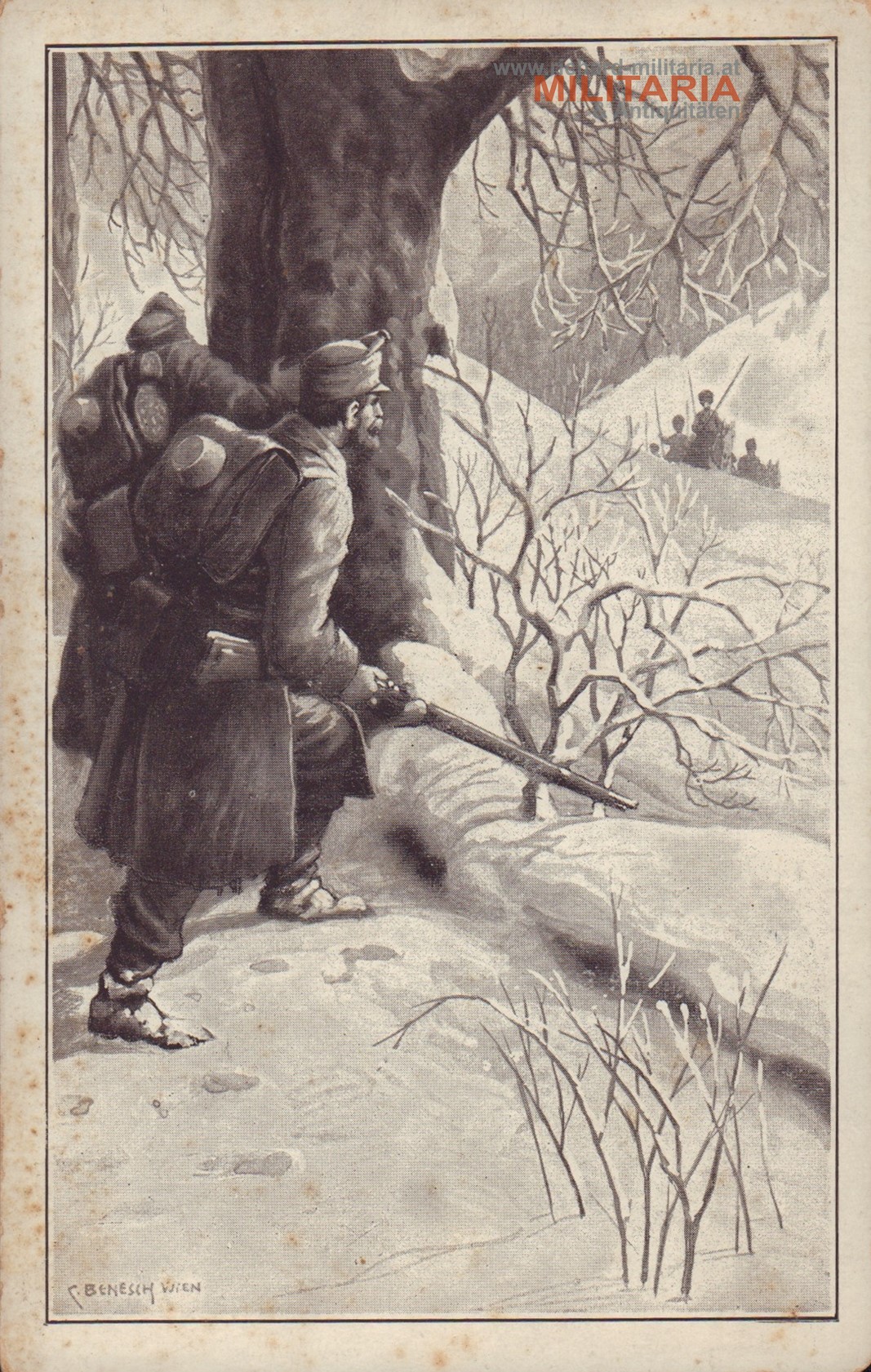 k.u.k. PK Soldaten im Winter, Illustration von C. Benesch aus Wien, Druck Koch und Werner aus Wien