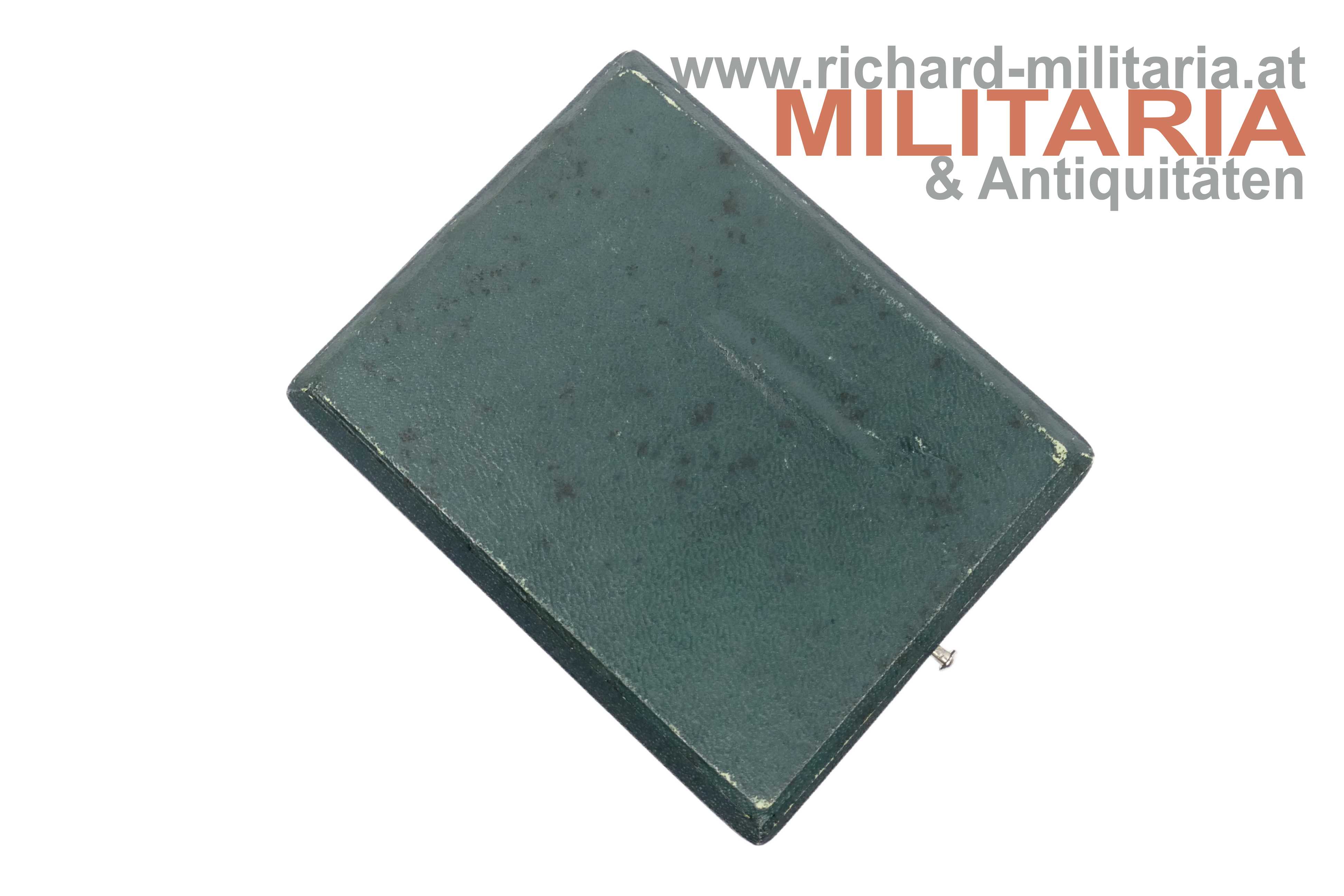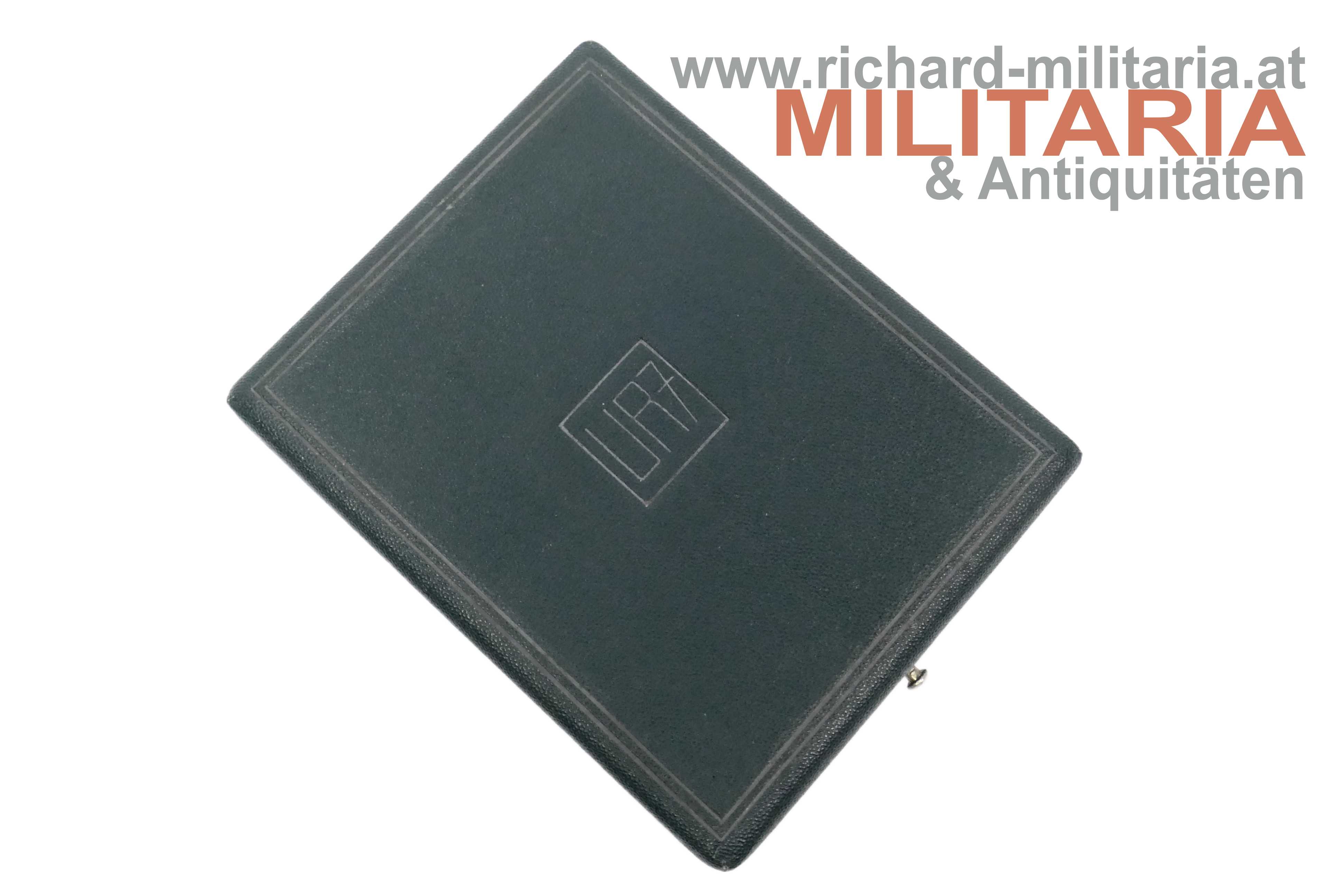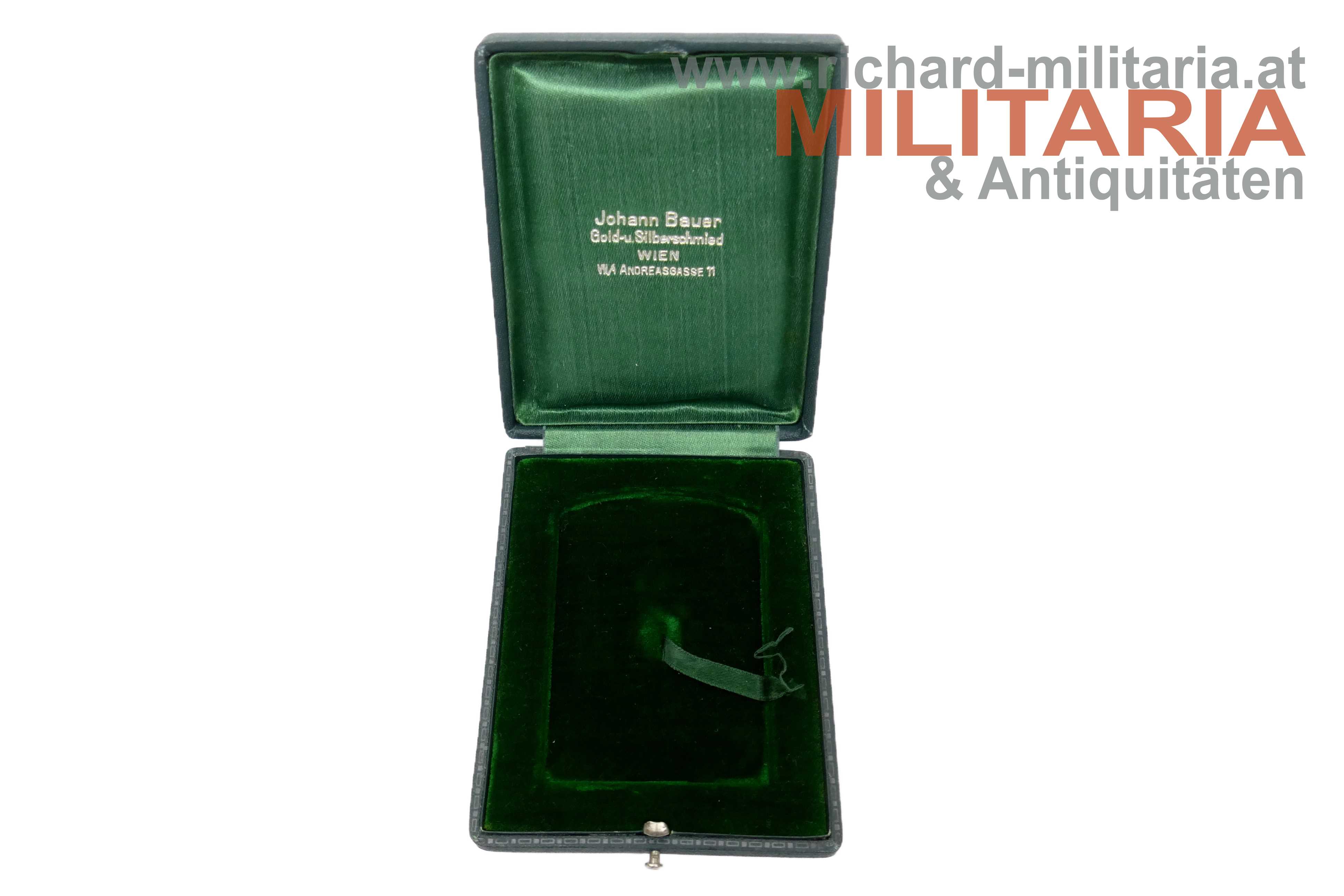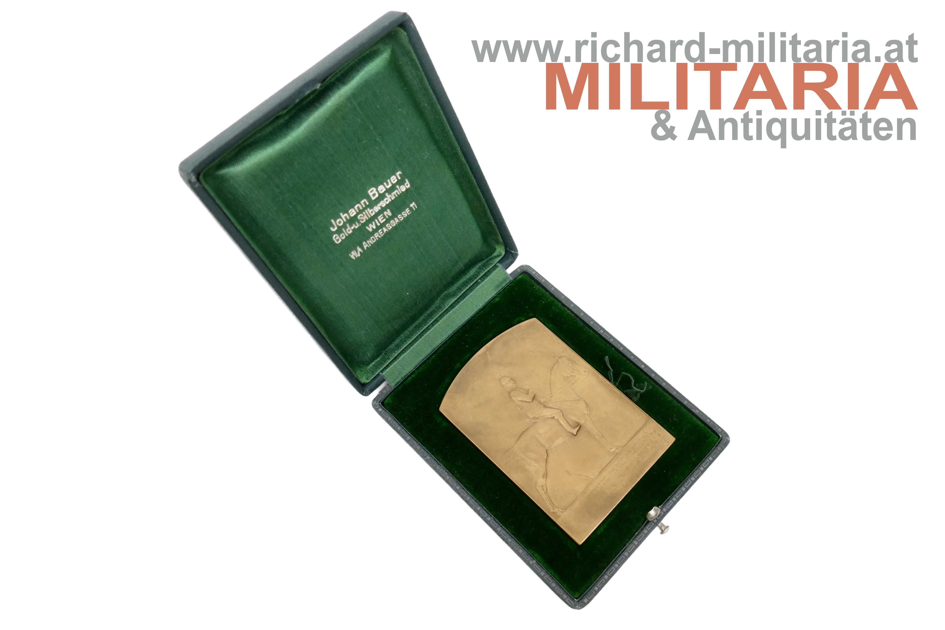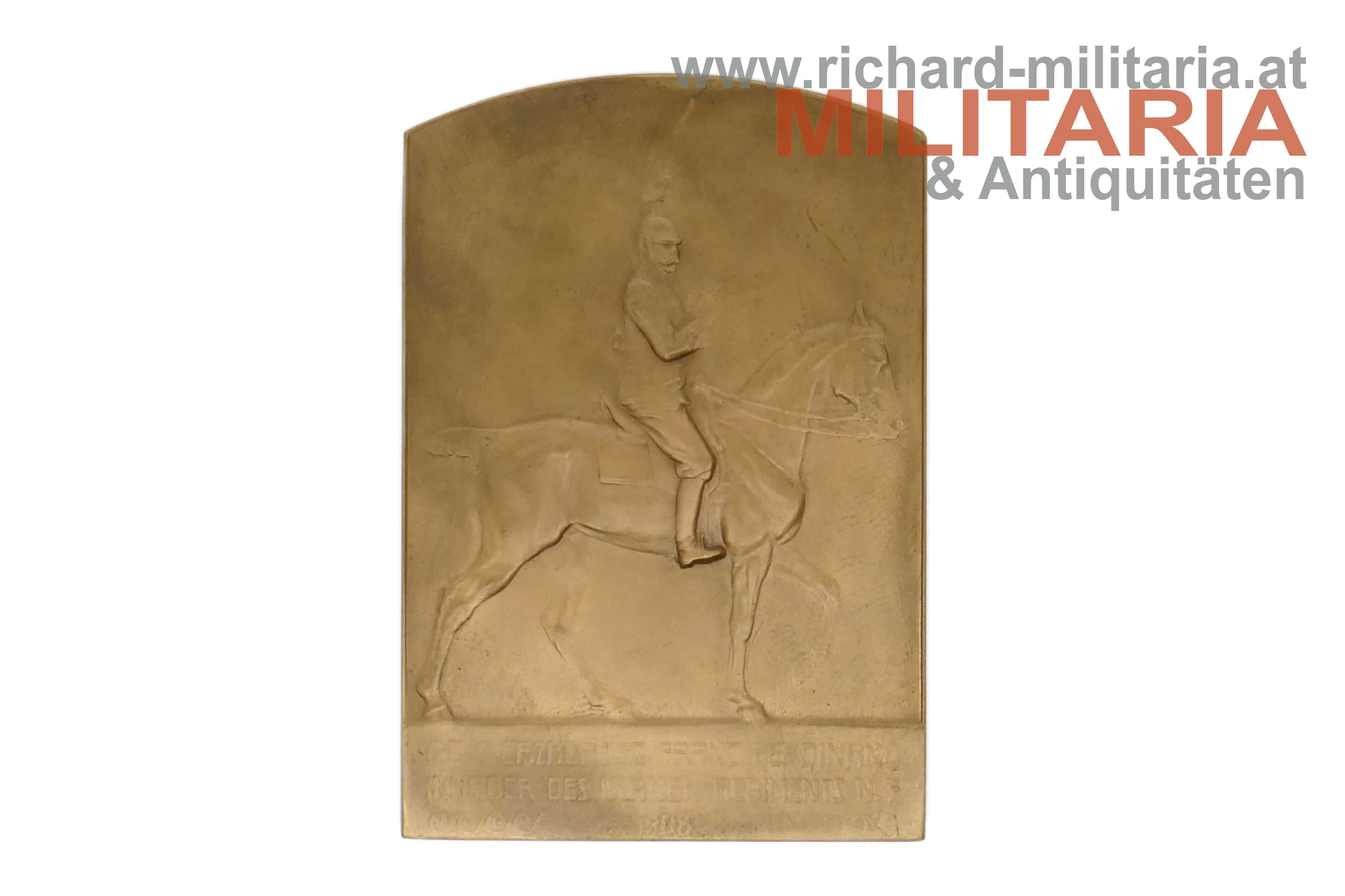 k.u.k. Plakette - Ulanen-Regiment Nr. 7 mit Etui; Bronze vergoldet; avers: Abbildung von Erzherzog Franz Ferdinand Inhaber des Ulanen-Regiment 7 zu Pferde; revers: General der Kavallerie Christian Philipp Fürst zu Löwenstein-Wertheim zu Pferde, den Errichter des Ulanen-Regiments 7; zugehöriges grünes Etui in Lederoptik; mit Deckelprägung "UR7"; innen am Deckel der Goldschmied Johann Bauer in silberner Schrift;