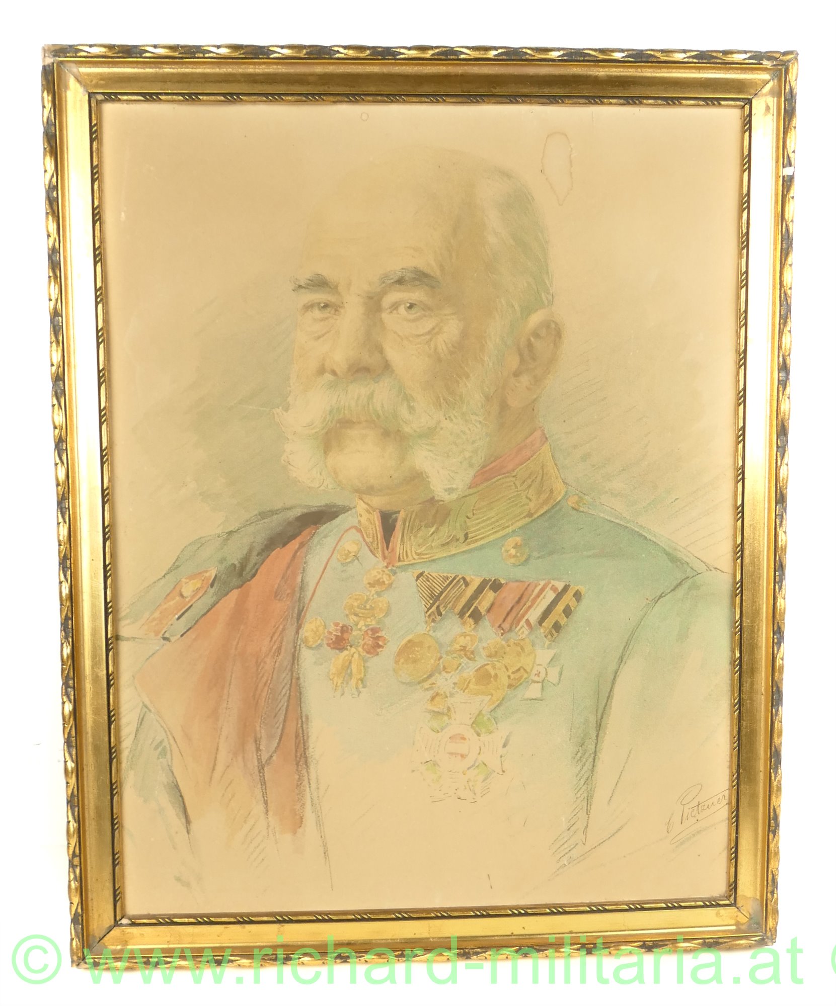 k.u.k. Portrait Kaiser Franz Josef, Farbdruck mit - Faksimile Unterschrift des Künstlers: "C. Pietzner"; im vergoldeten verzierten Rahmen; auf der Rückseite mit Aufhängevorrichtung, Altersspuren;
