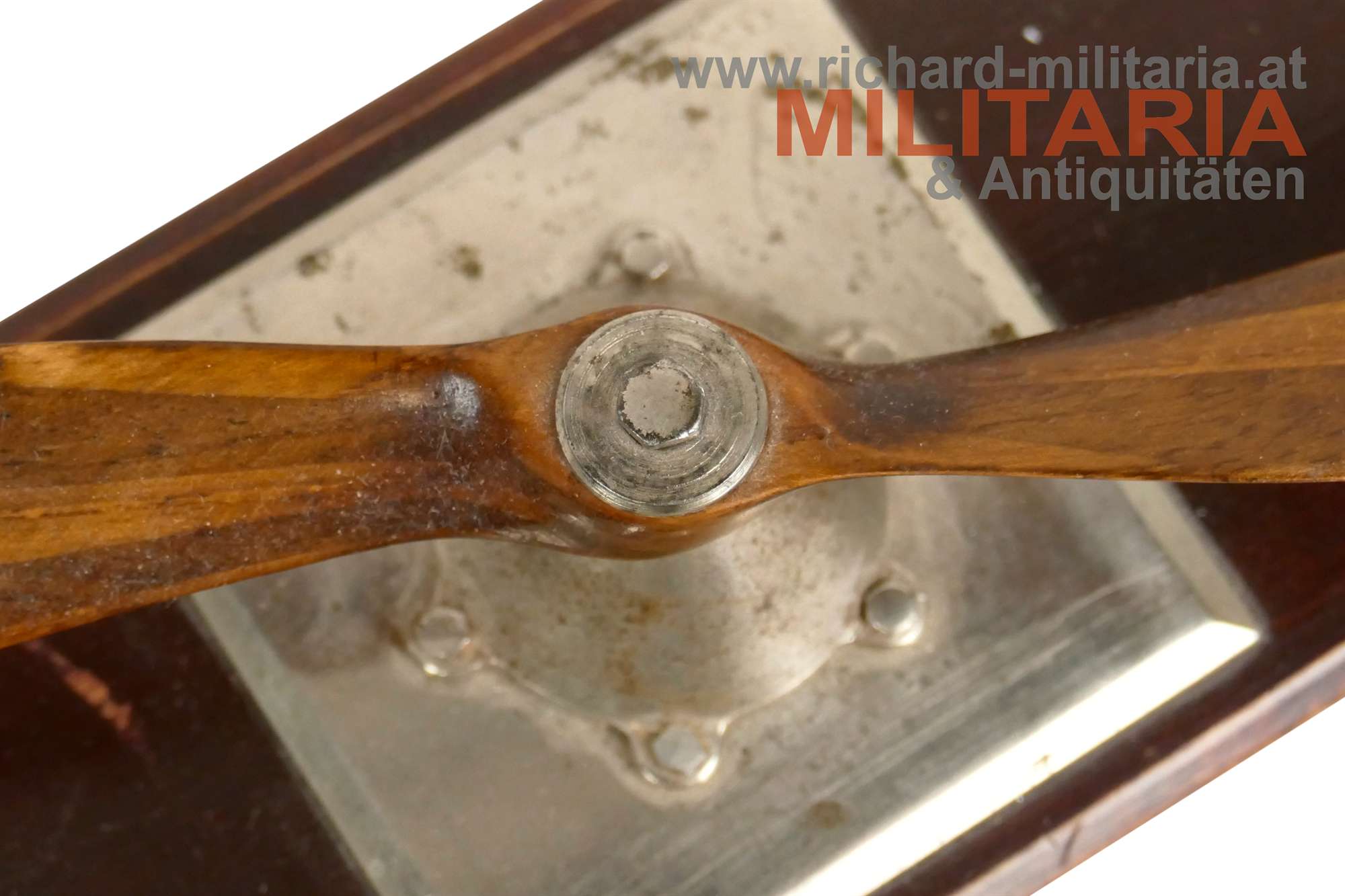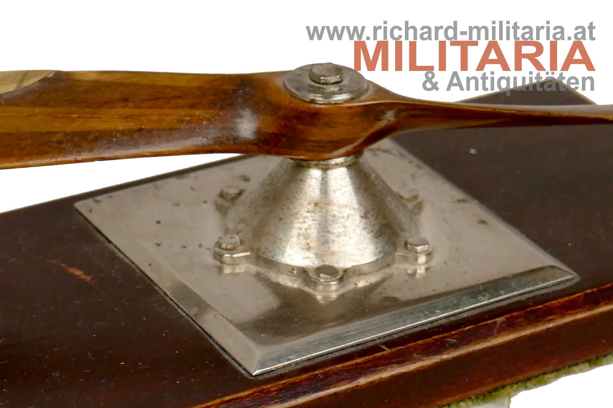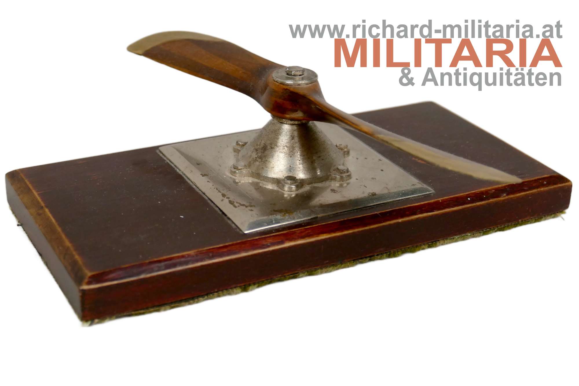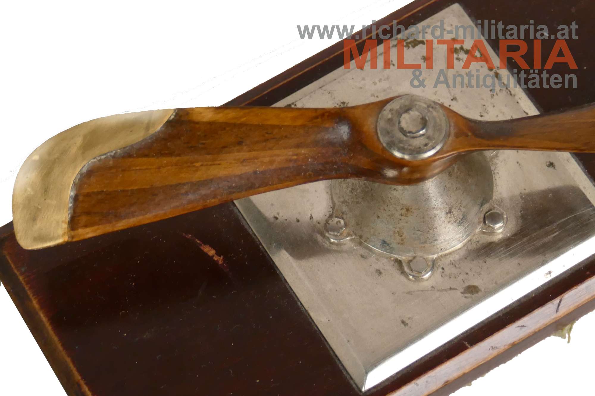 k.u.k. Propeller - Tischdekoration - Fliegerei, aus verschiedenen Holzarten original getreu zusammengebauter Propeller mit Messingblechabschlüssen, Metallsockel aus Tombak versilbert - Holzsockel mit Filzauflage; Propeller ist beweglich (!);