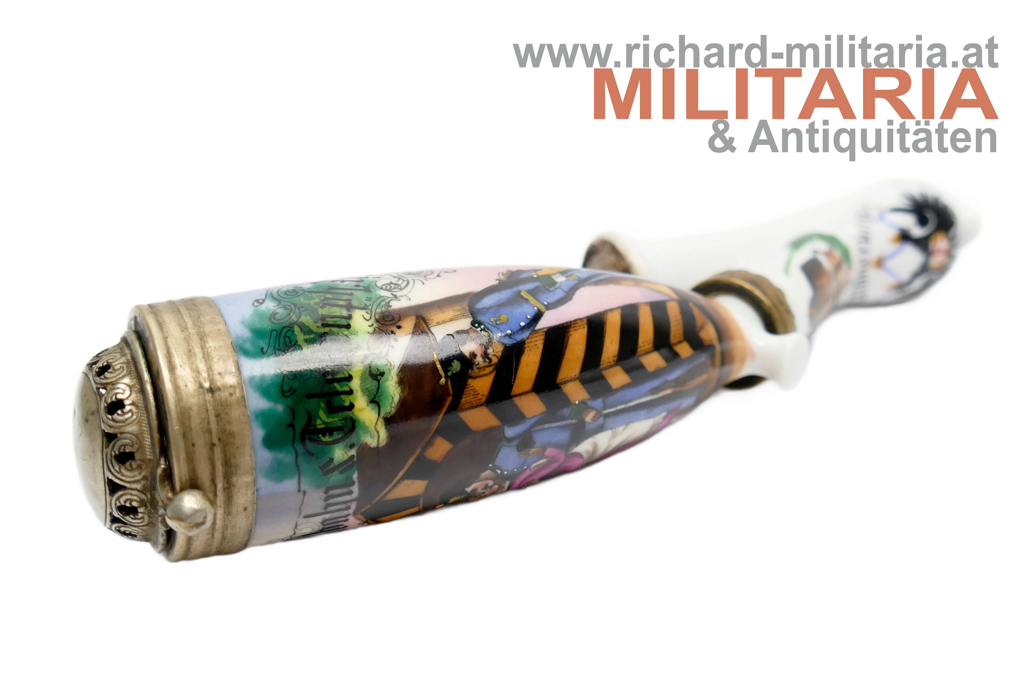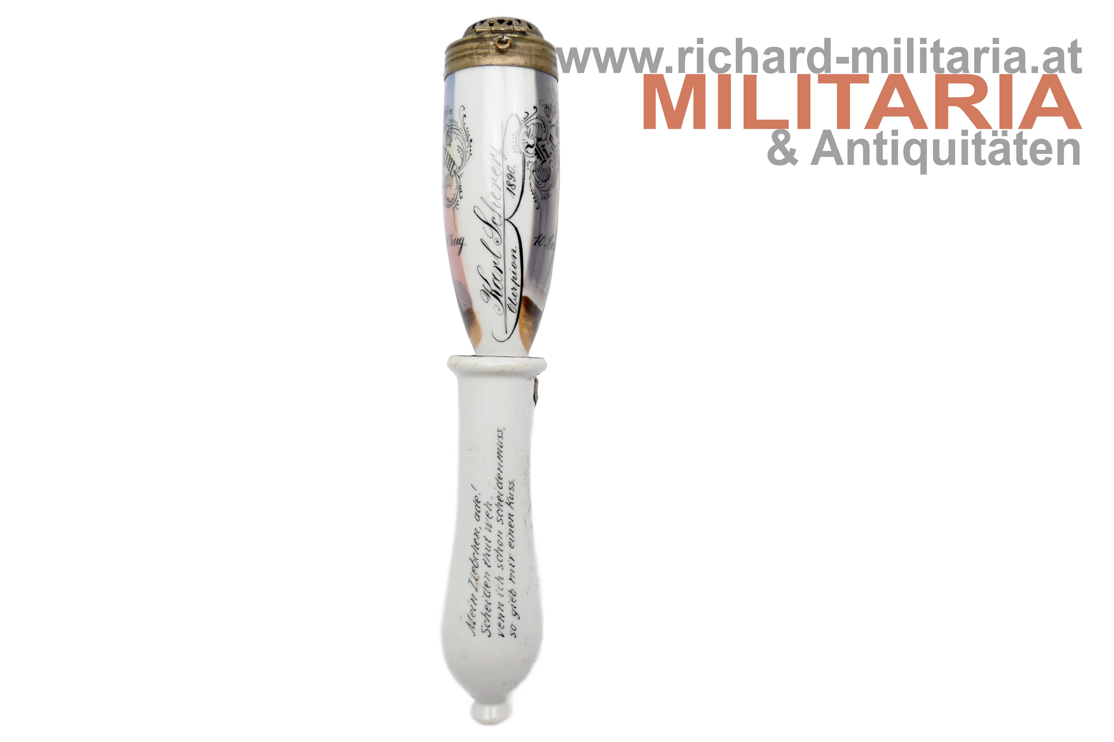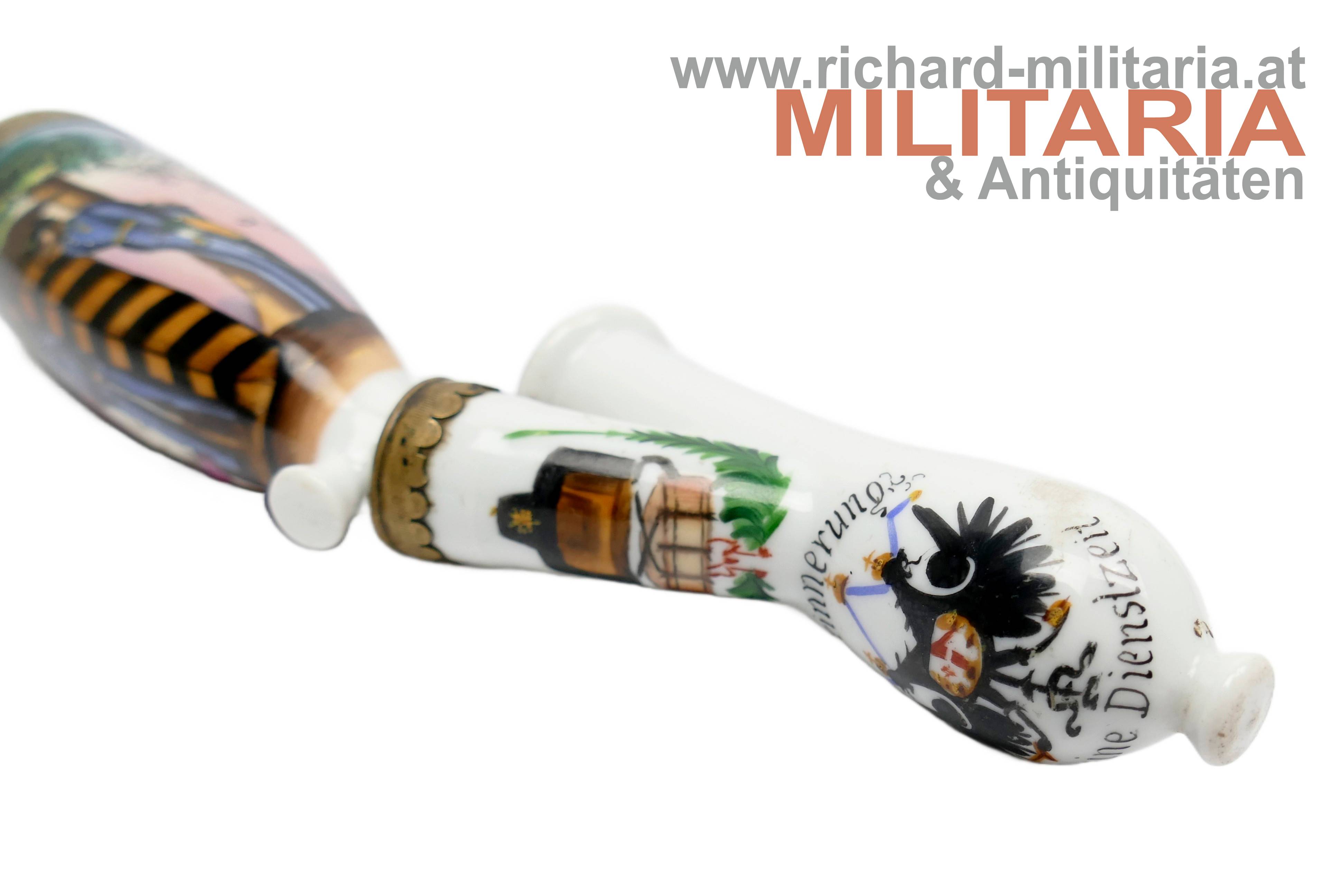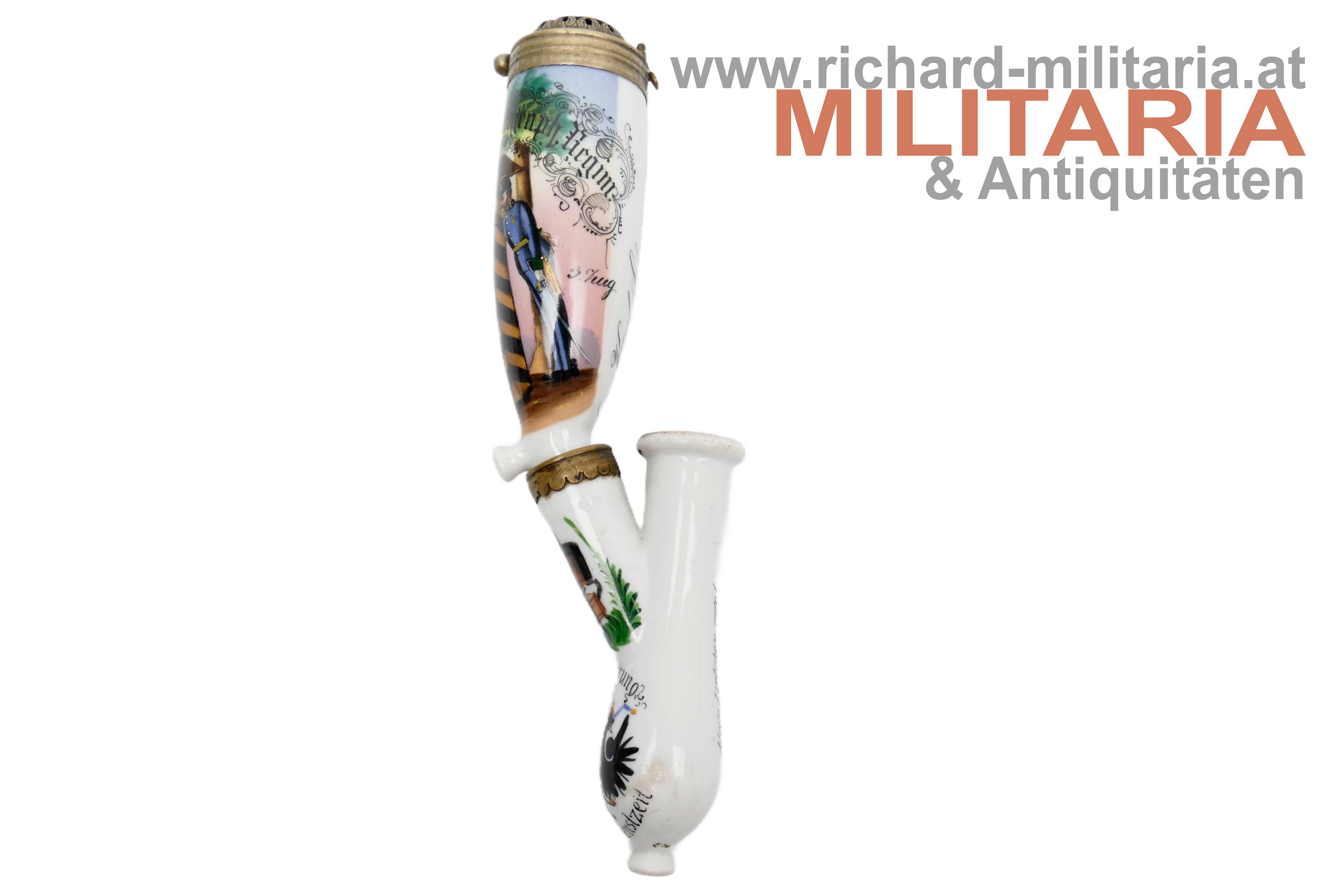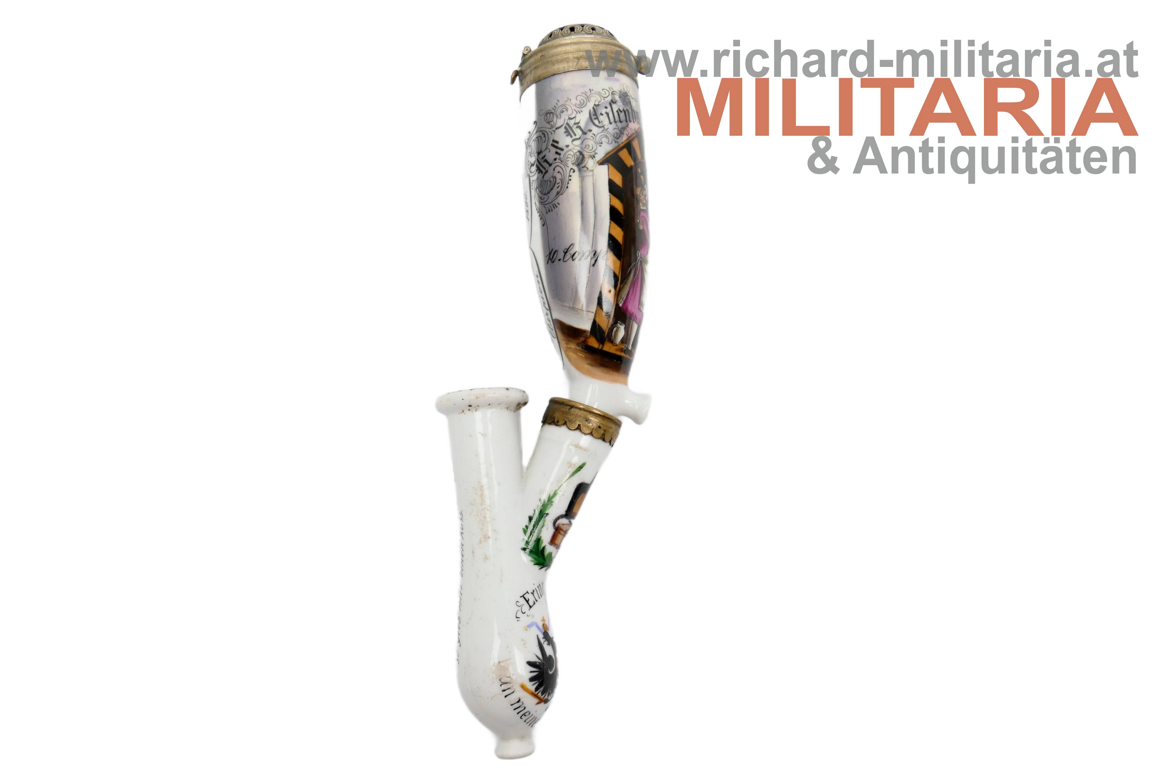 k.u.k. Reservistenpfeife des Oberpionier Karl Scherer im Eisenbahn- & Telegraphen-Regiment 10. Kompagnie 3. Zug; frühe Pfeife datiert auf 1890 (!); Vorderseite mit Bildnis eines Soldaten mit seiner Geliebten in einer Wachhütte sowie einem weiteren Soldaten der sie dort beobachtet/erwischt; Wassersack mit kaiserlichem Doppeladler und dem Text "Erinnerung an meine Dienstzeit"; Tornister mit Kappe; revers am Wassersack ein Gedicht; unbeschädigt; Korkhalterung fehlt; ohne Holzstiel;