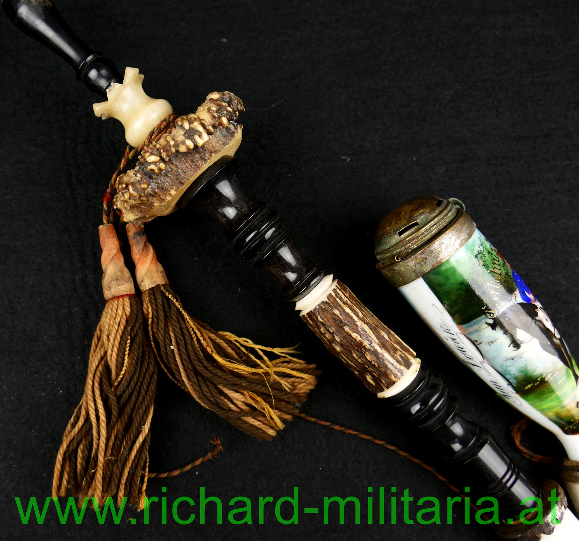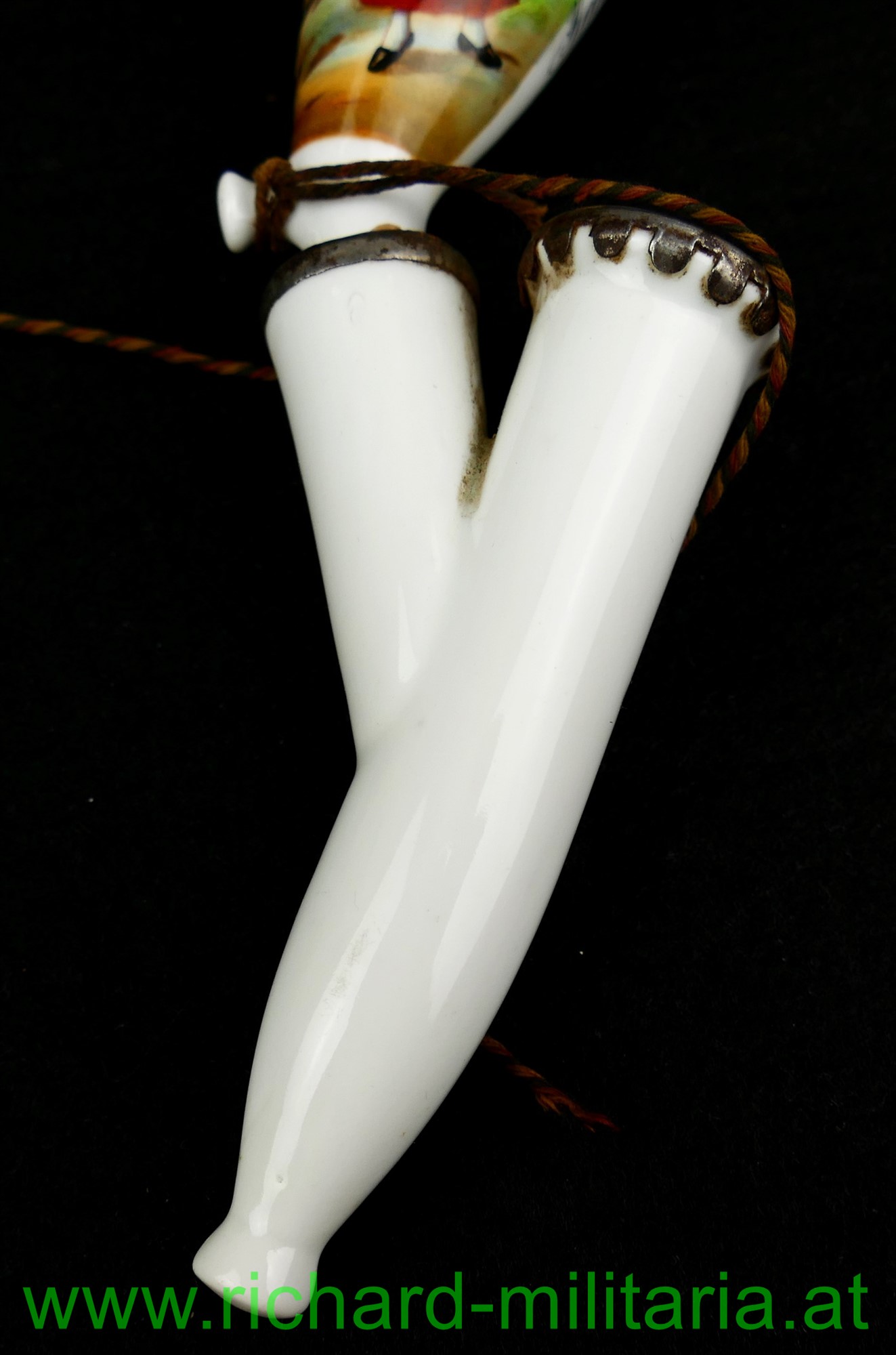 Reservistenpfeife des k.u.k. Ulanen-Regimentes Alexander II. Kaiser von Russland Nr. 11, tschechisch beschrieben "k.u.k. bnl. plub Alex II.càr Rusky e`: 11", handbemalt mit passendem Wassersack, außergewöhnlich gefertigter Pfeifenstiel, unbeschädigt in sehr guter Erhaltung, Höhe der Pfeife mit Wassersack ca. 21 cm, dazu der passende Holzstiel mit einer Länge von 52 cm