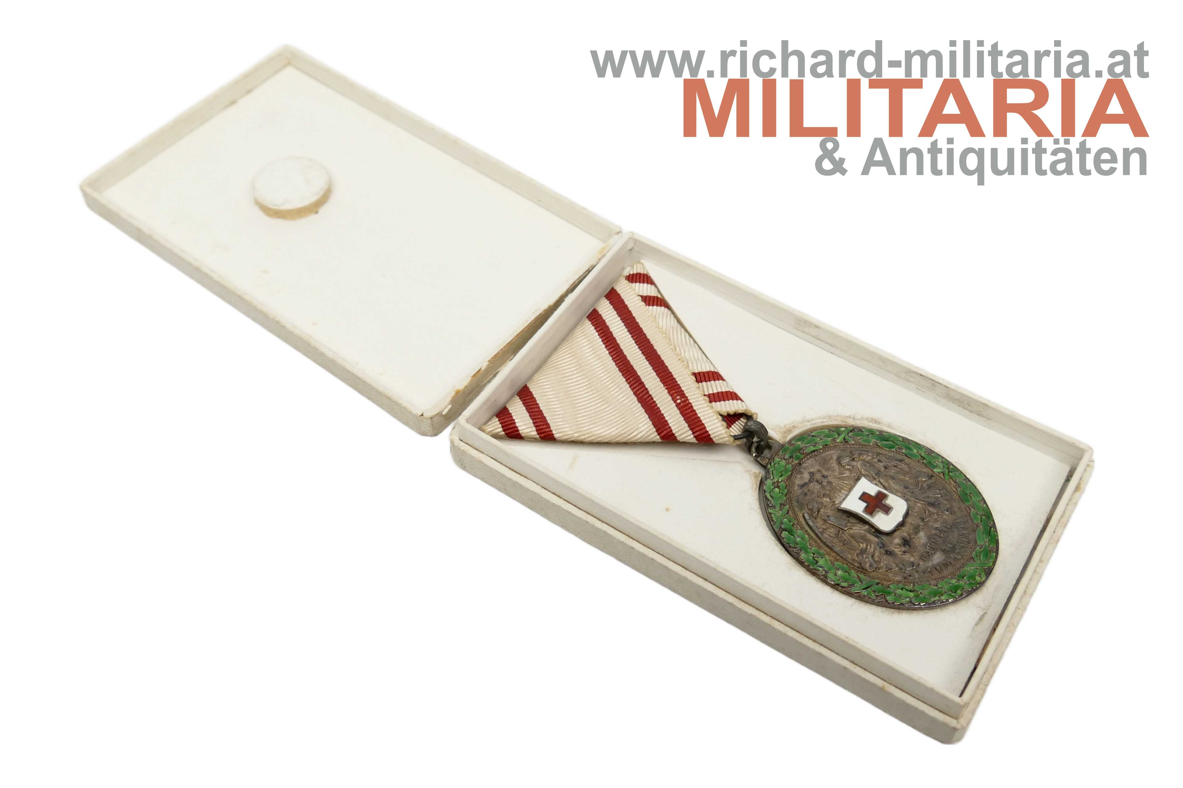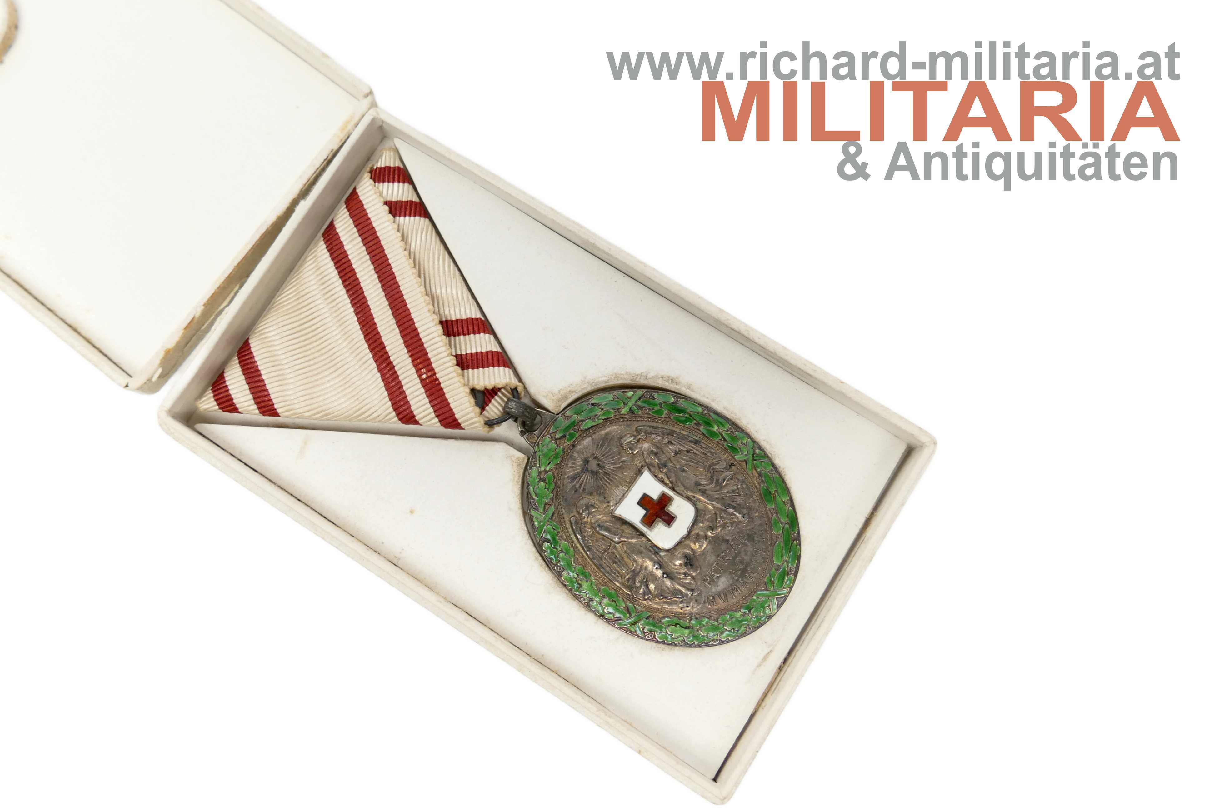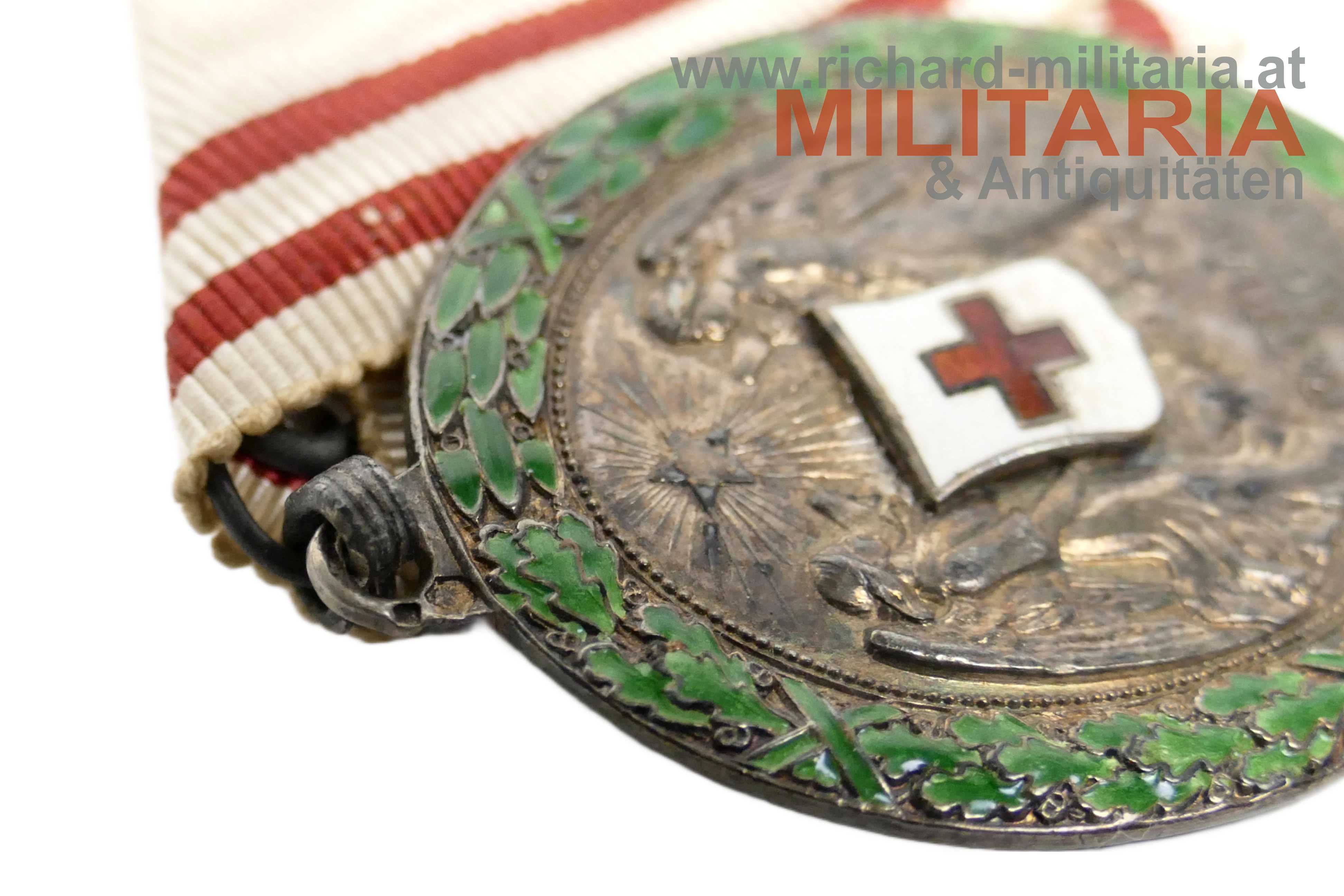 k.u.k. Rotes Kreuz - Silberne Ehrenmedaille mit Kriegsdekoration und Etui; Dianakopfpunzierung und undeutliche Herstellerpunzierung an der Öse; Emaillierung der Kriegsdekoration in guter Erhaltung; weißes Wappenschild mit Spannungsrissen; am originalen Band; im zugehörigen Etui mit silberner Deckelprägung; Deckel komplett abnehmbar und fleckig; Etuiboden mit dem Hersteller "C. F. Rothe & Neffe";
