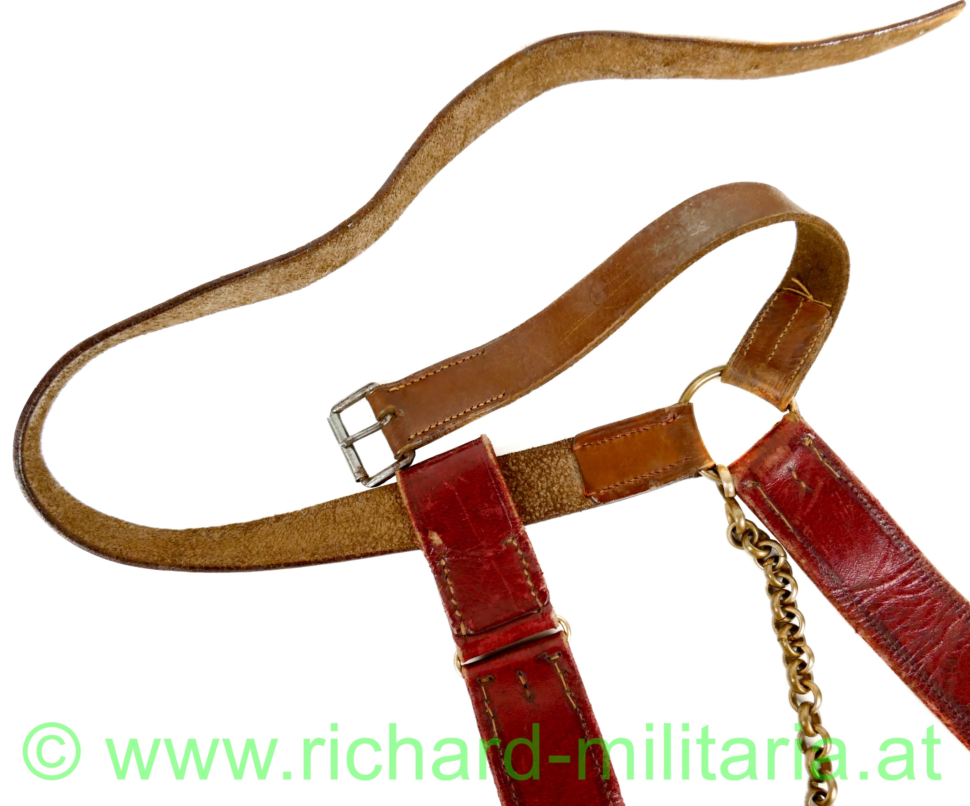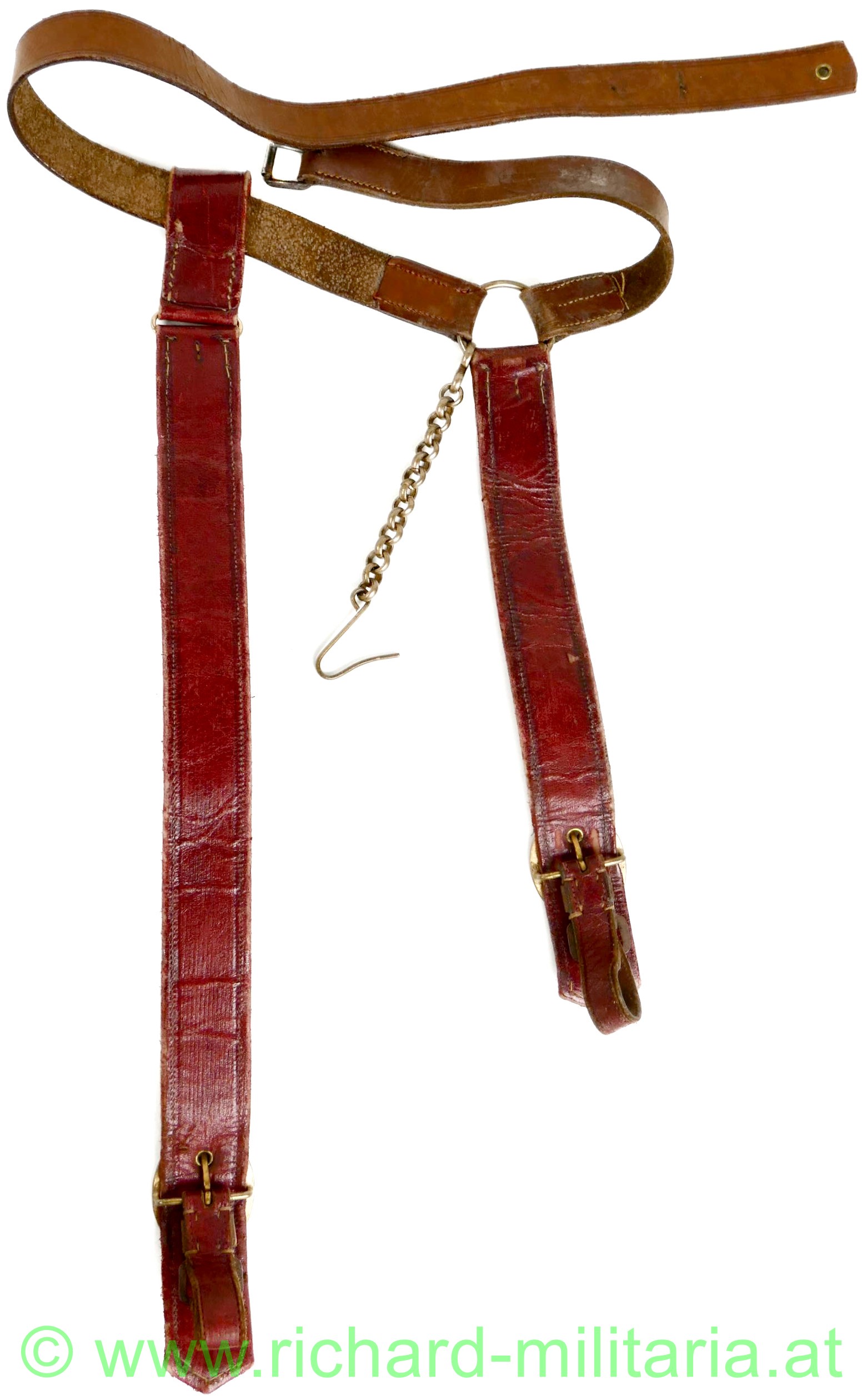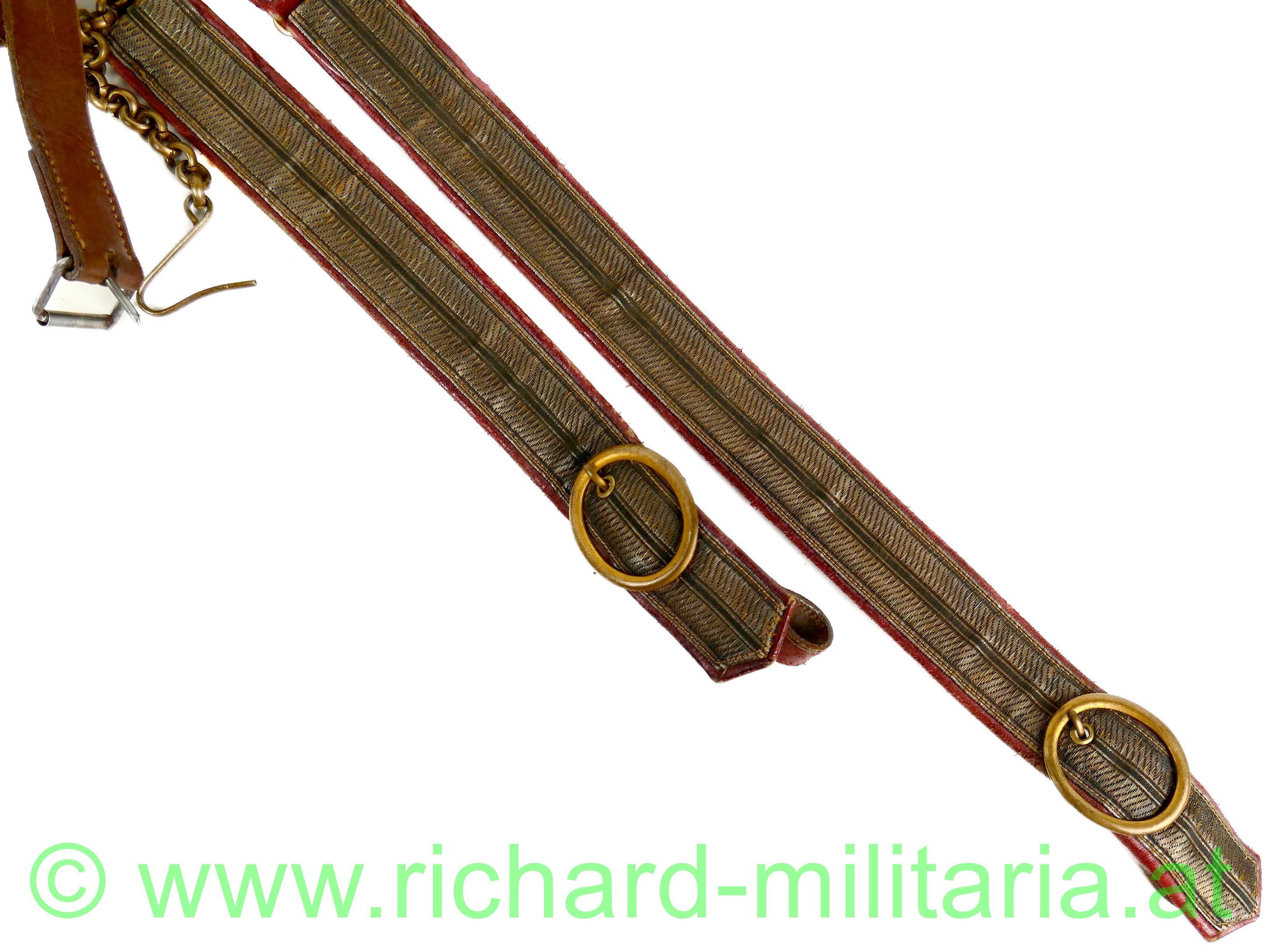 k.u.k. Säbelgehänge für Offiziere; Leibriemen aus braunem Leder; gekürzt mit nur einem originalen Einhängeloch sowie zwei händisch gestochenen Löchern; Stulpen aus rotem Saffianleder mit gedunkelter Goldborte für Offiziere; Messingbeschläge sowie eine Kurzhängekette für den Säbel;