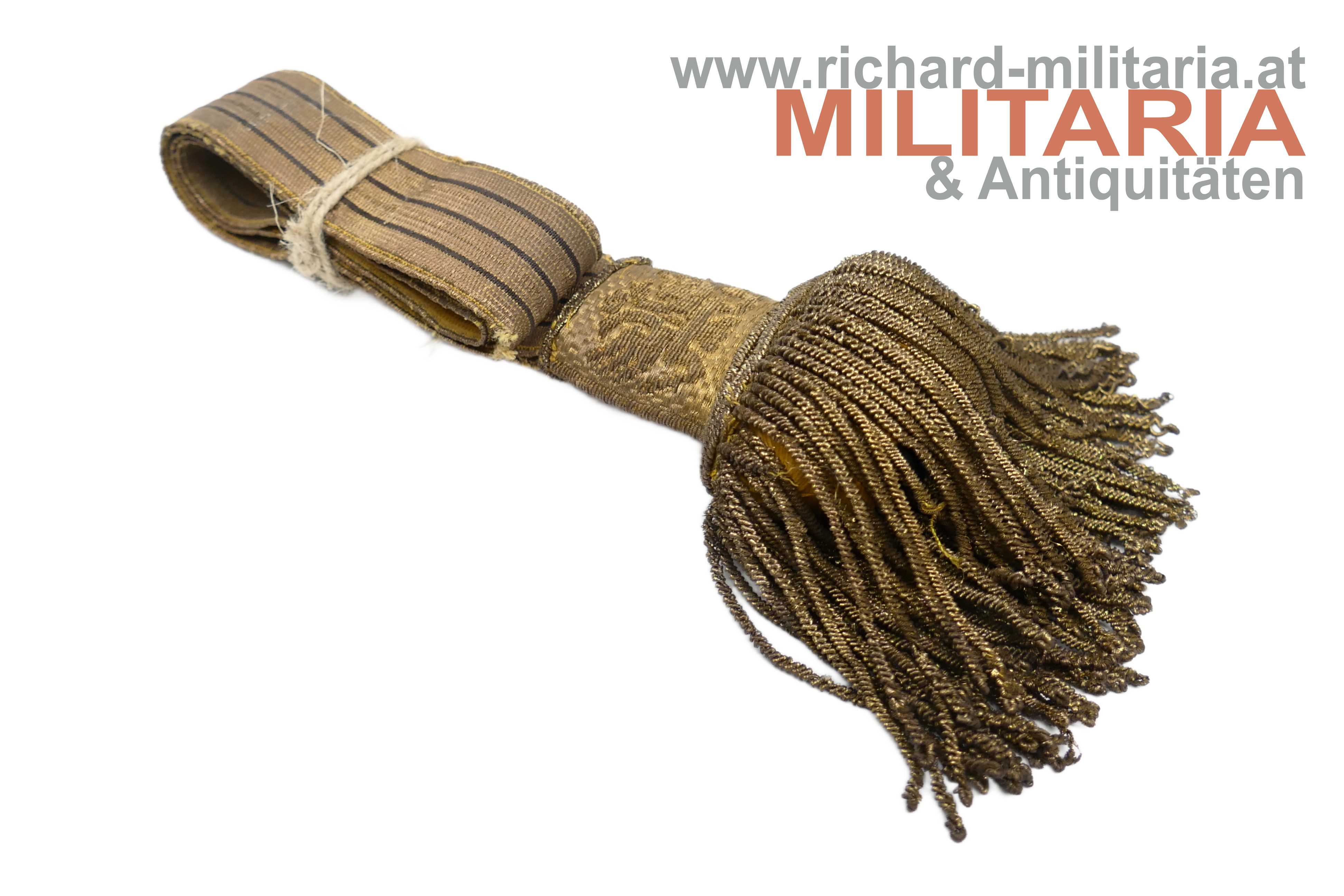 k.u.k. Säbelportepee für Offiziere - Kaiser Franz Joseph; Band aus Goldfaden mit 3 schwarzen Durchzügen mit dünnem gelben Stoff unterfüttert; am Quastenkopf der Allerhöchste Namenszug "FJ1" und der kaiserliche Doppeladler; verdrillte Quasten aus Goldfaden etwas ausgedünnt und beschädigt;