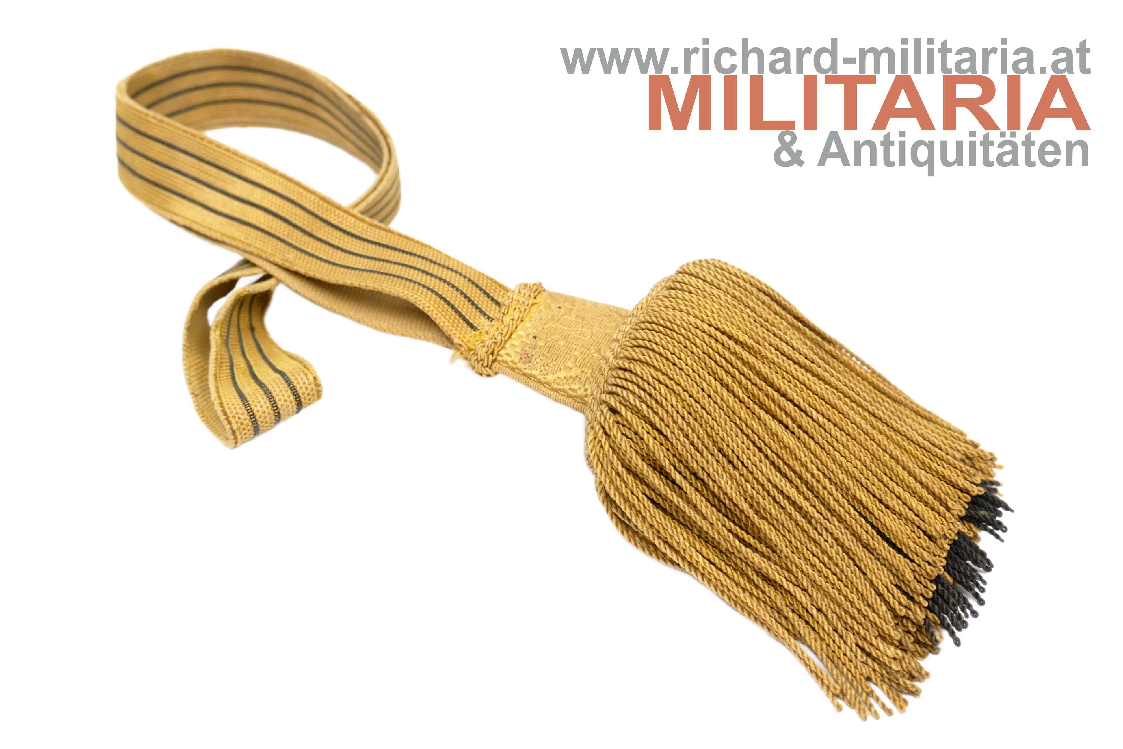 k.u.k. Säbelportepee für Unteroffiziere; gefertigt aus kaisergelber Wolle; offen - innere Quasteln aus schwarzer Wolle; Modell Kaiser Franz Josef; guter Zustand mit Tragespuren am Band