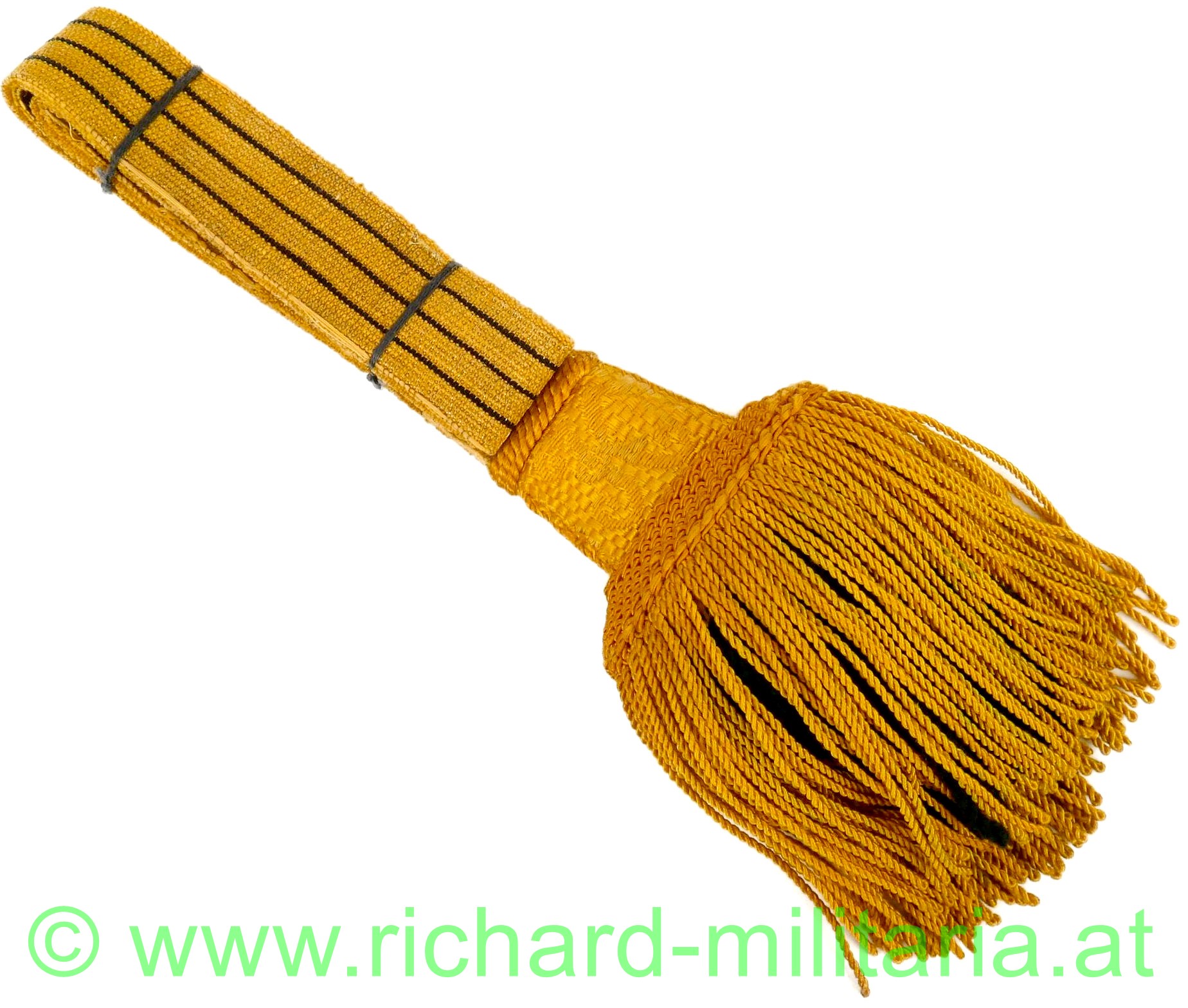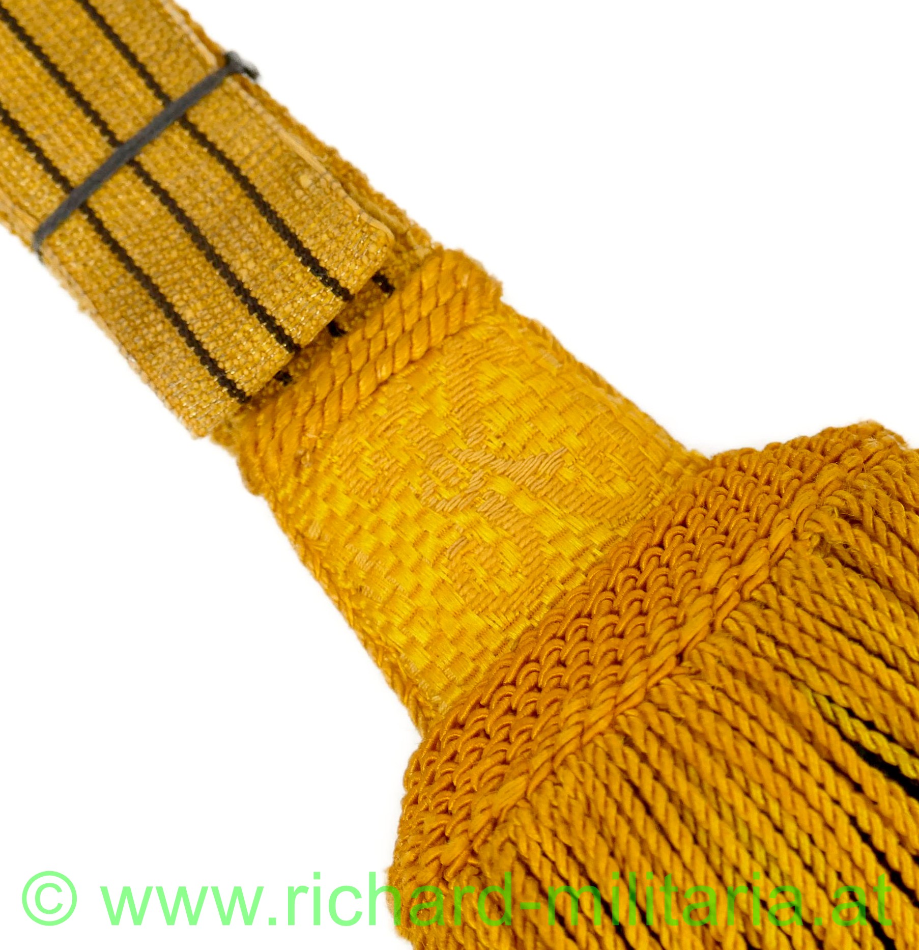 k.u.k. Säbelportepee für Unteroffiziere (K) Kaiser Karl; Band aus kaisergelbe Wolle mit 3 schwarzen Durchzügen; Band mit originalen Stoffschnüren doppelt zusammengebunden - UNGETRAGEN (!); Quastenkopf beidseitig mit "K" (Kaiser Karl) bestickt; gelbe gedrillte Portepeefransen;