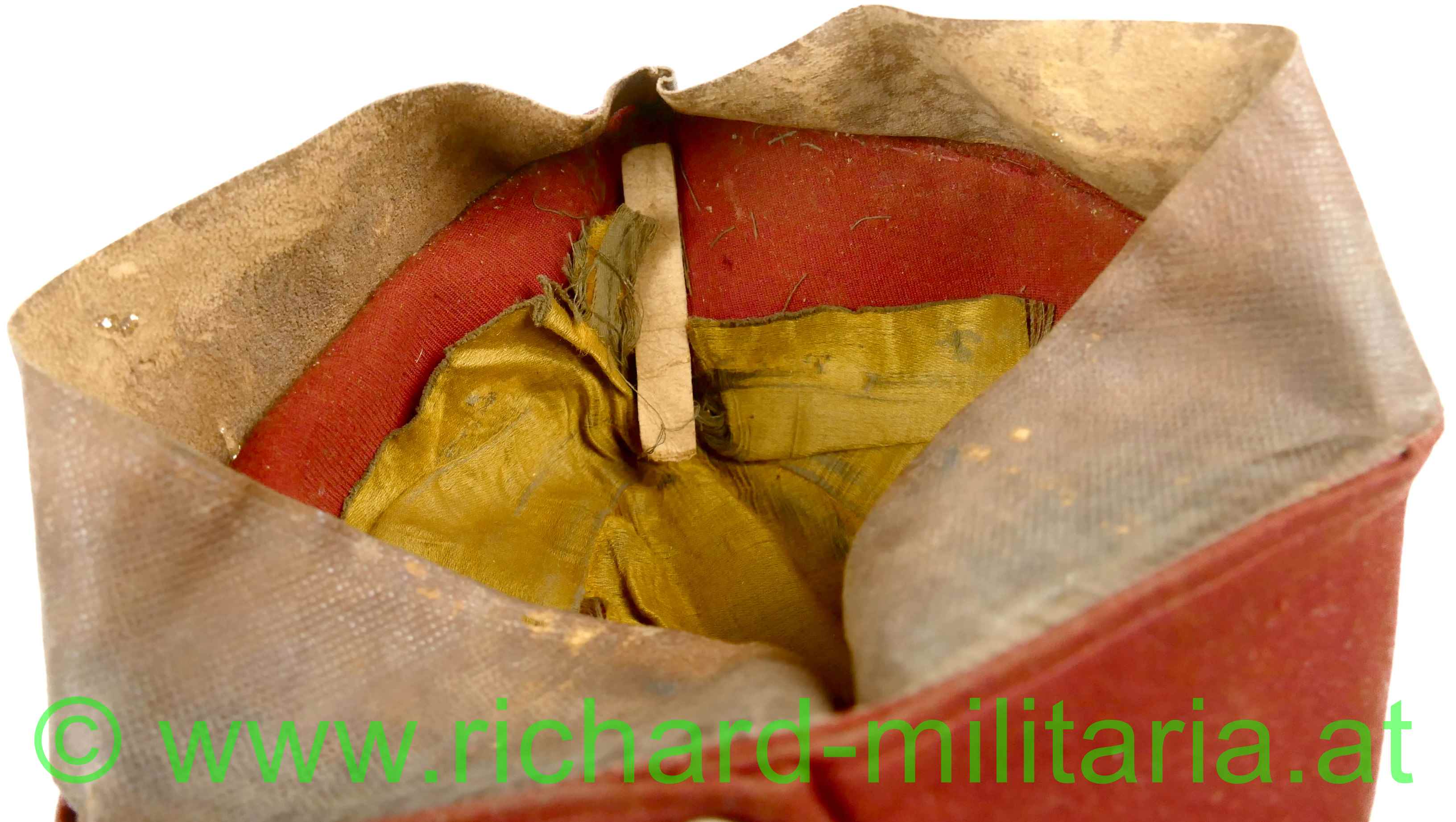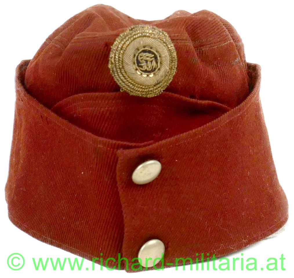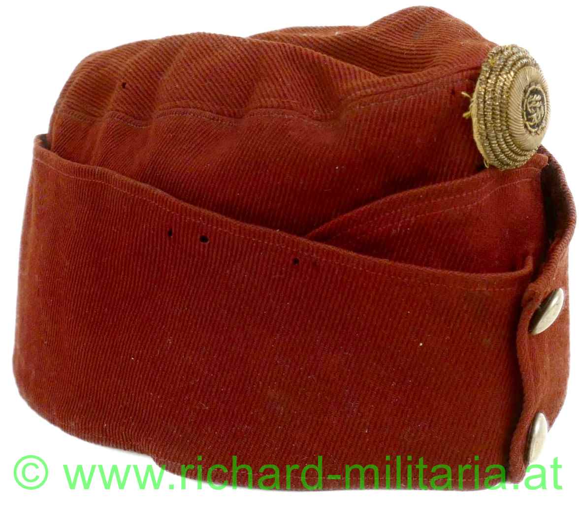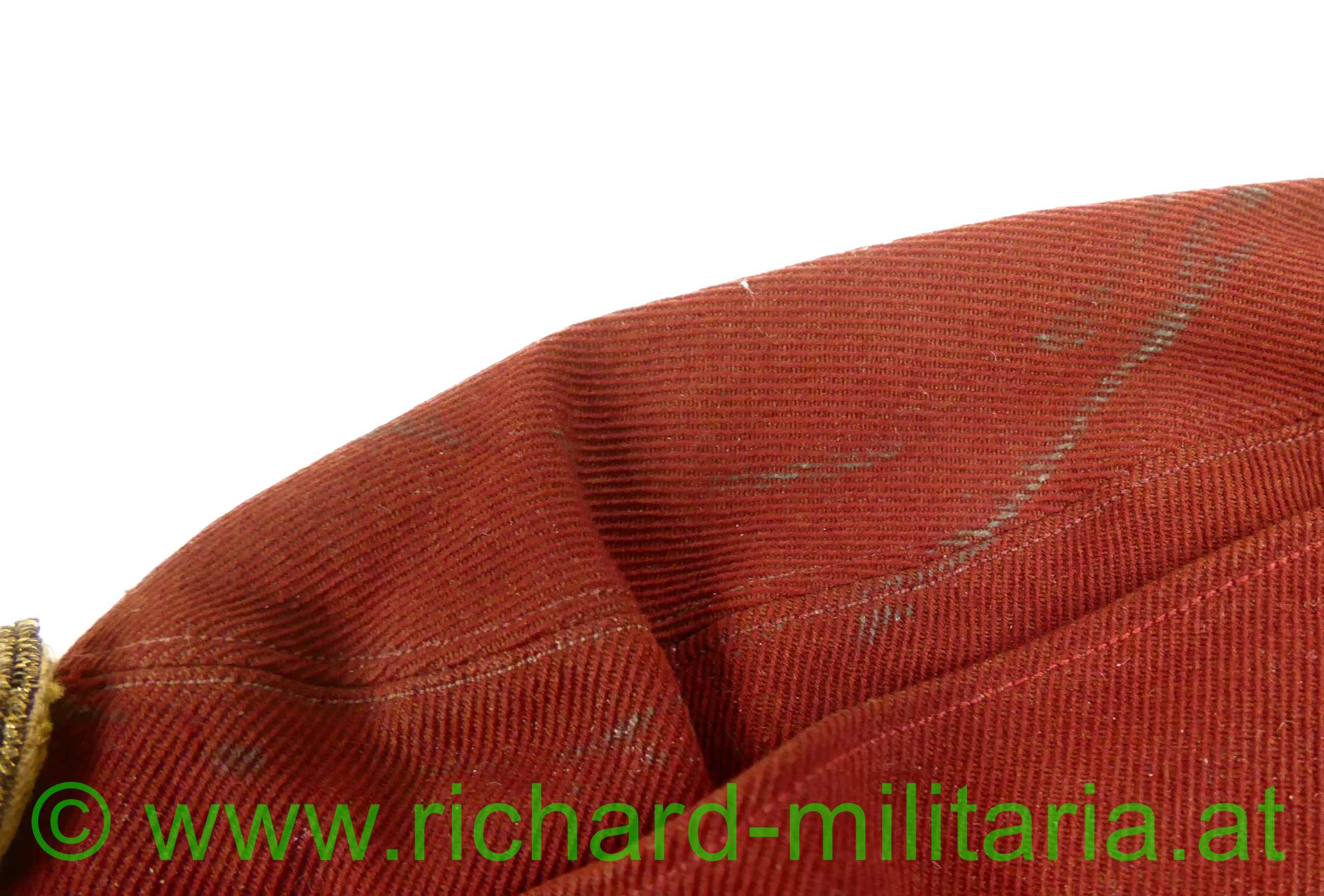 k.u.k. schirmlose rote Lagerkappe für Offiziere der Kavallerie; rotes Tuch; vorne gestickter Kokarde "FJ1" für Offiziere und 2 silberne Knöpfe; innen mit gelbem dünnem Seidenstoff ausgelegt; dieses an mehreren Stellen zerschlissen; weiches dunkelbraunes Stirnleder mit Größenangabe "54 1/2"; mehrere kleine Mottenlöcher außen; auf der Oberseite etwas angeschmutzt;