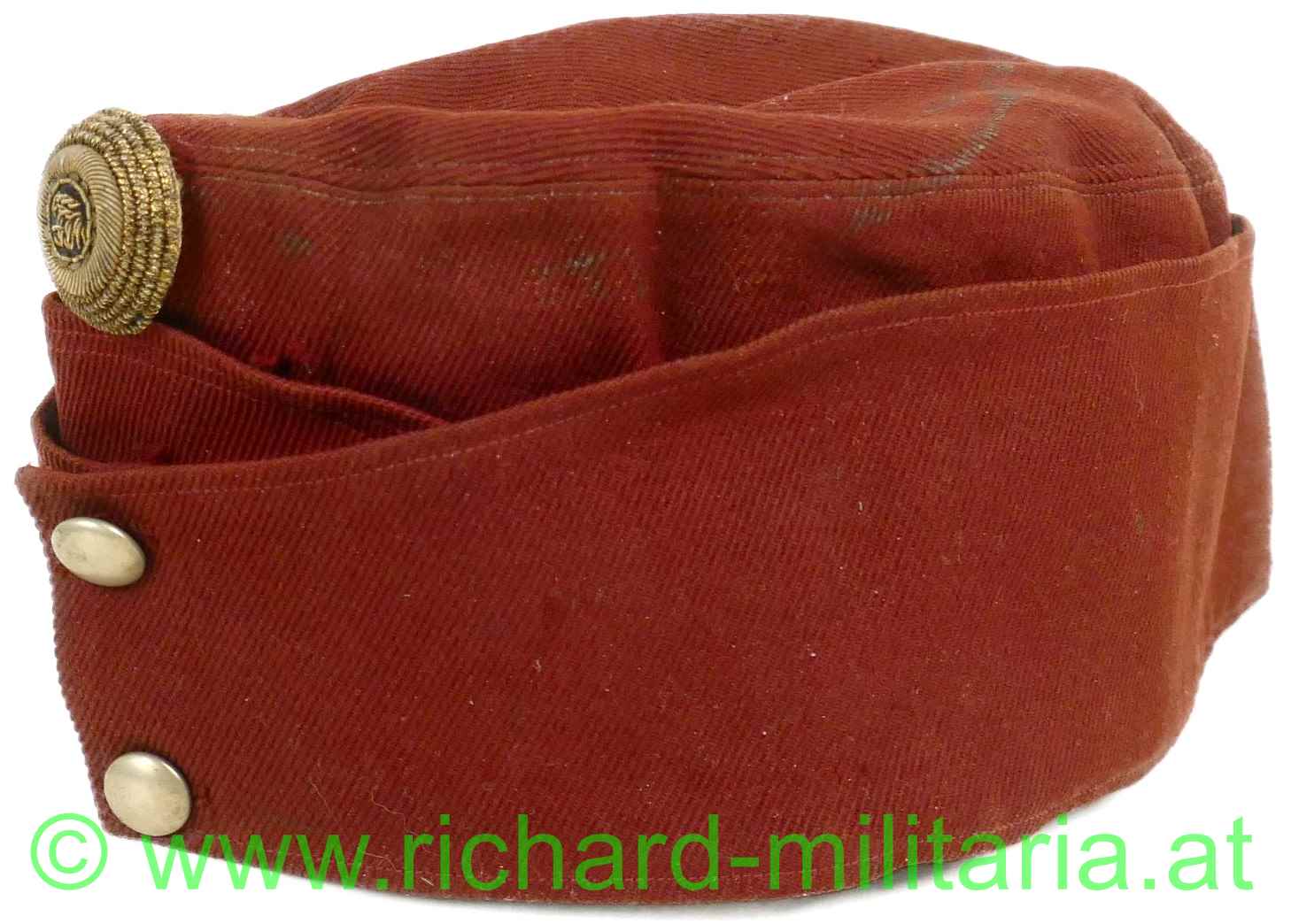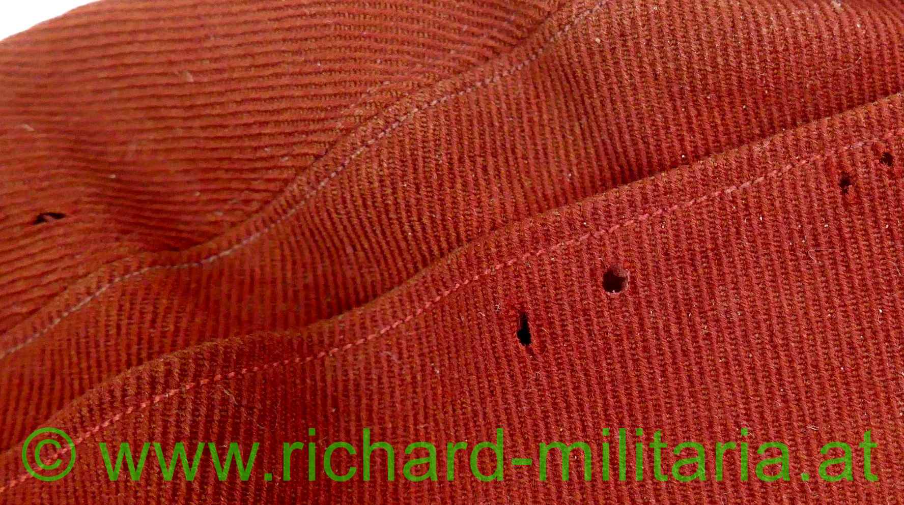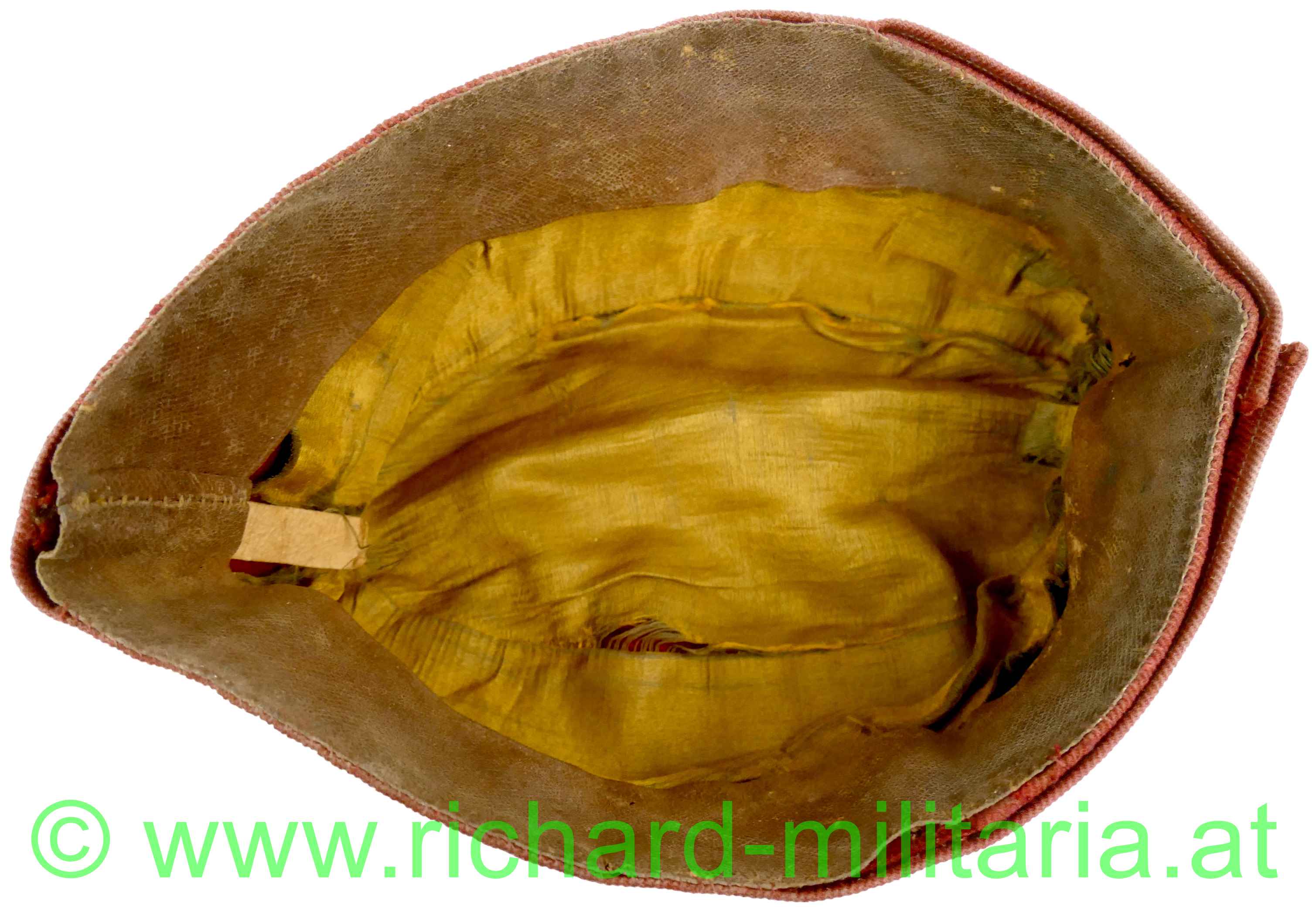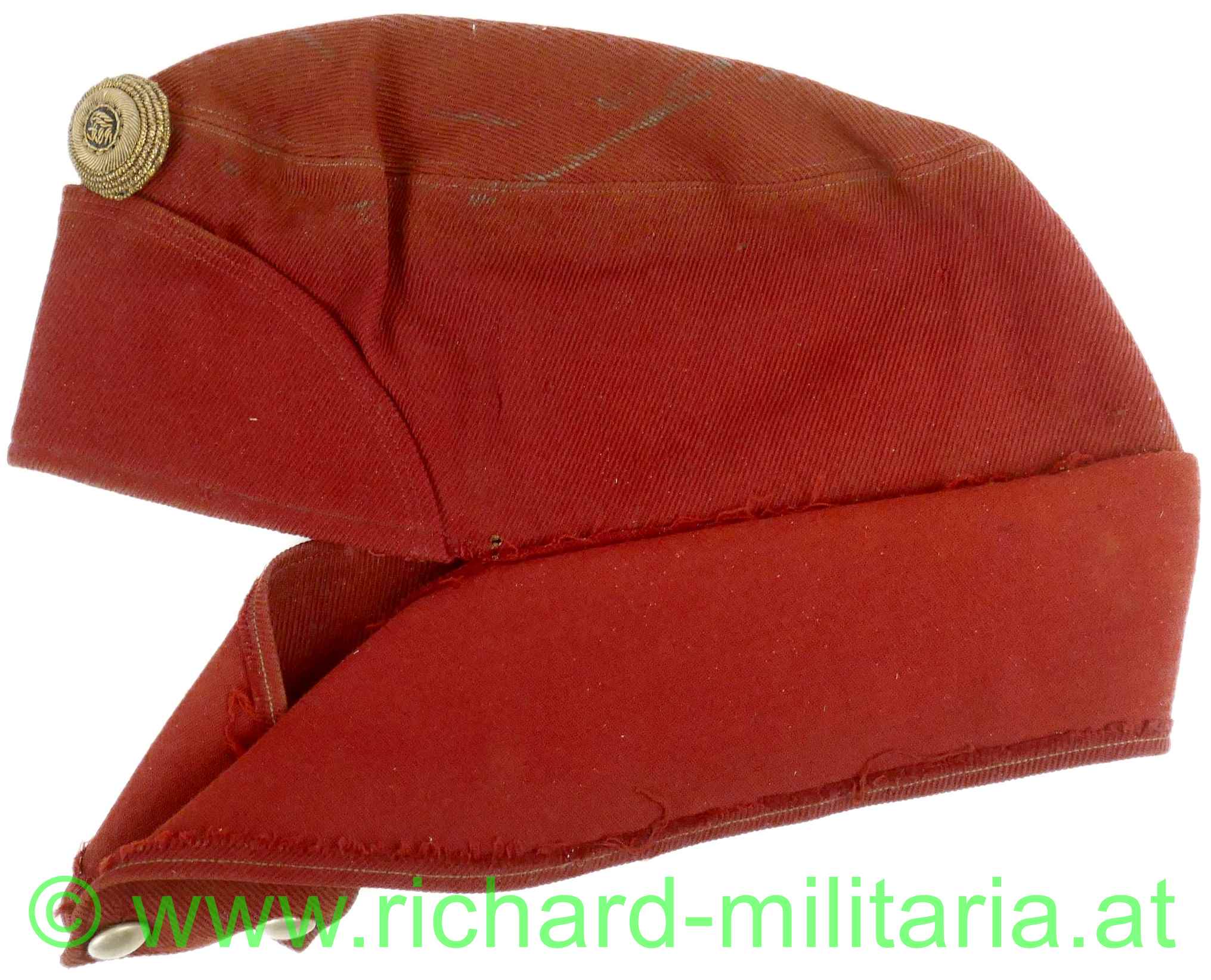 k.u.k. schirmlose rote Lagerkappe für Offiziere der Kavallerie; rotes Tuch; vorne gestickter Kokarde "FJ1" für Offiziere und 2 silberne Knöpfe; innen mit gelbem dünnem Seidenstoff ausgelegt; dieses an mehreren Stellen zerschlissen; weiches dunkelbraunes Stirnleder mit Größenangabe "54 1/2"; mehrere kleine Mottenlöcher außen; auf der Oberseite etwas angeschmutzt;