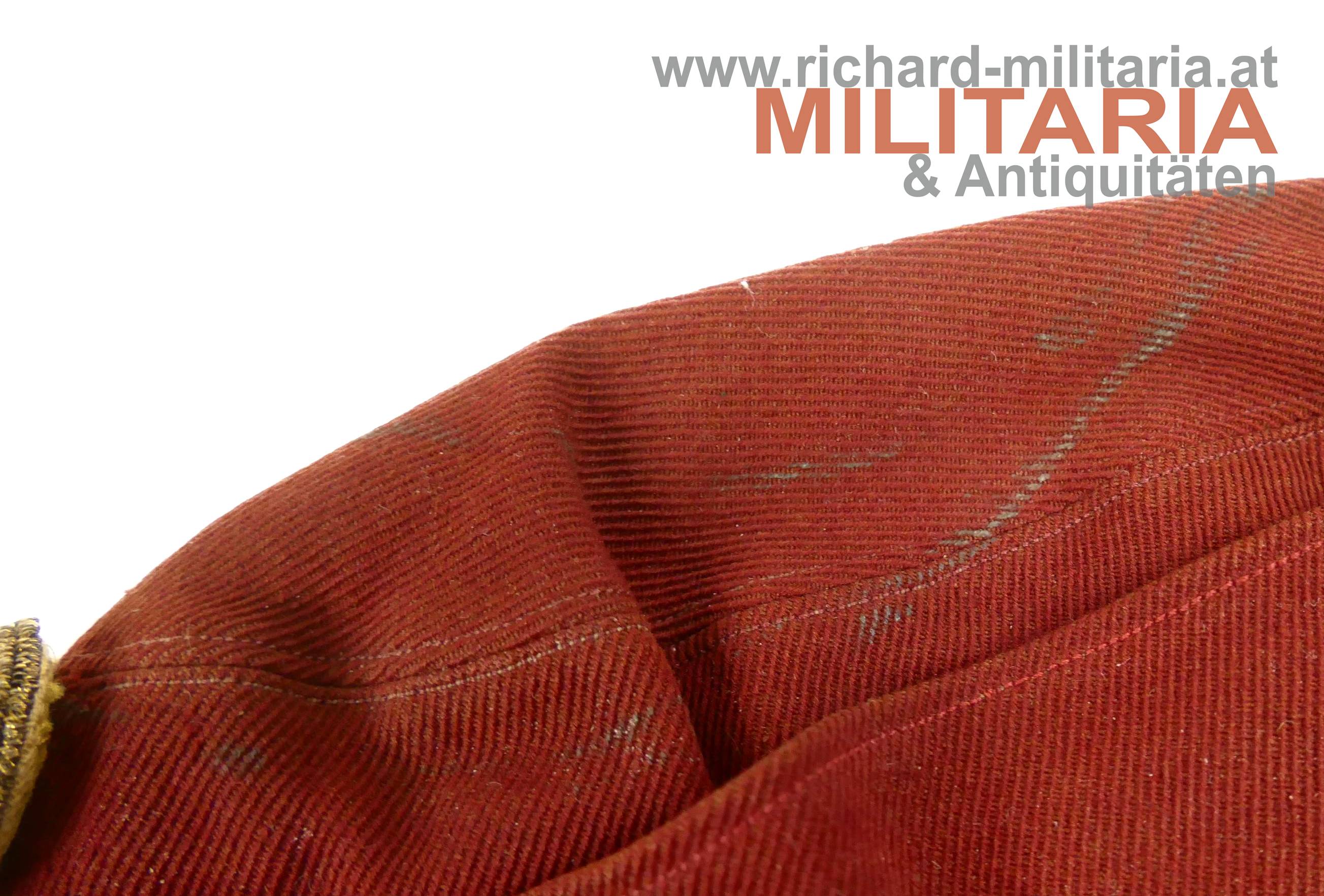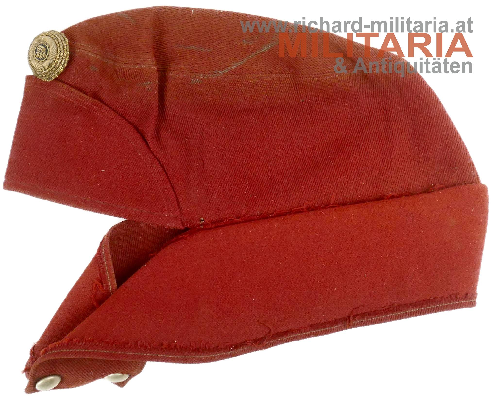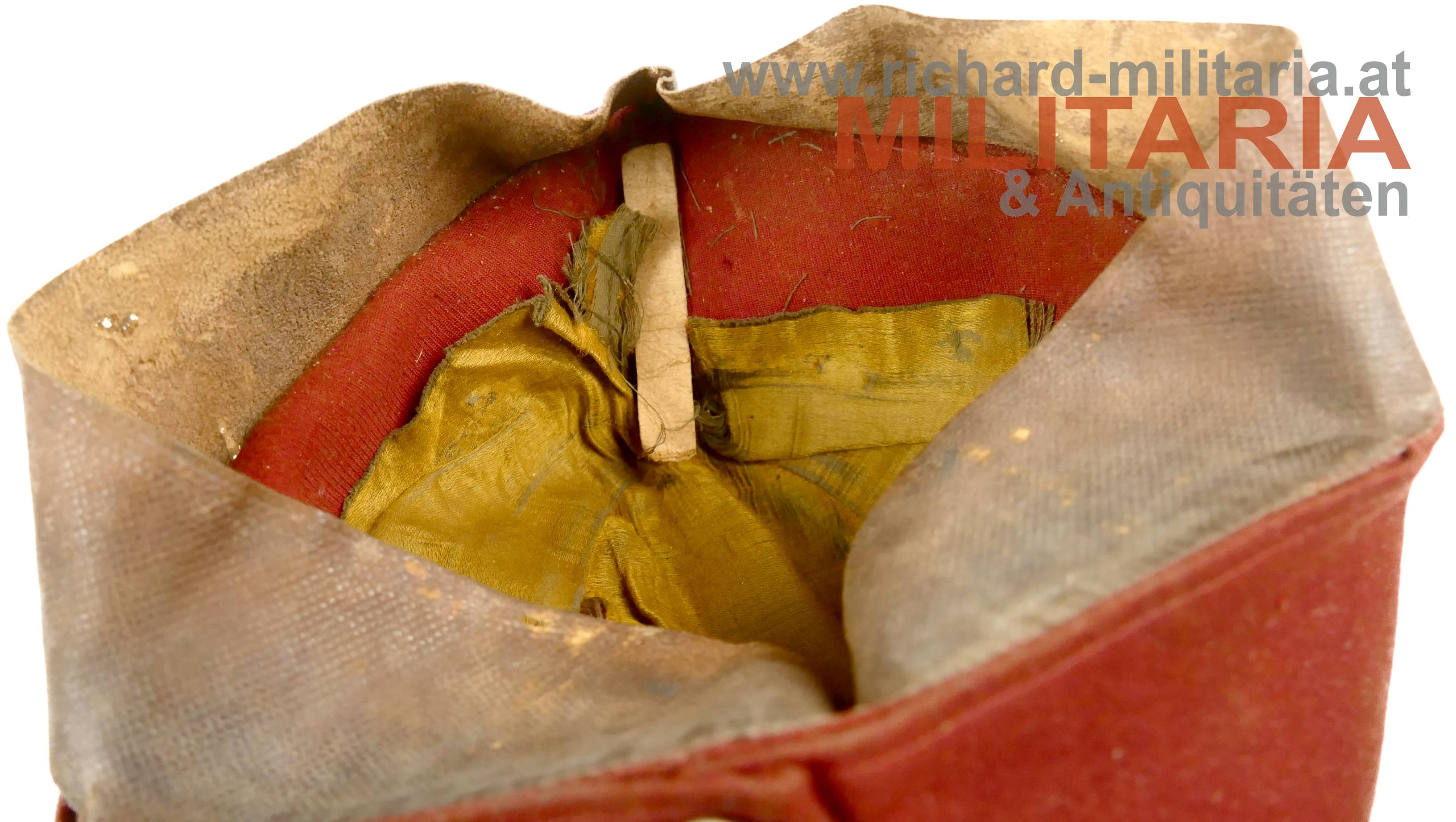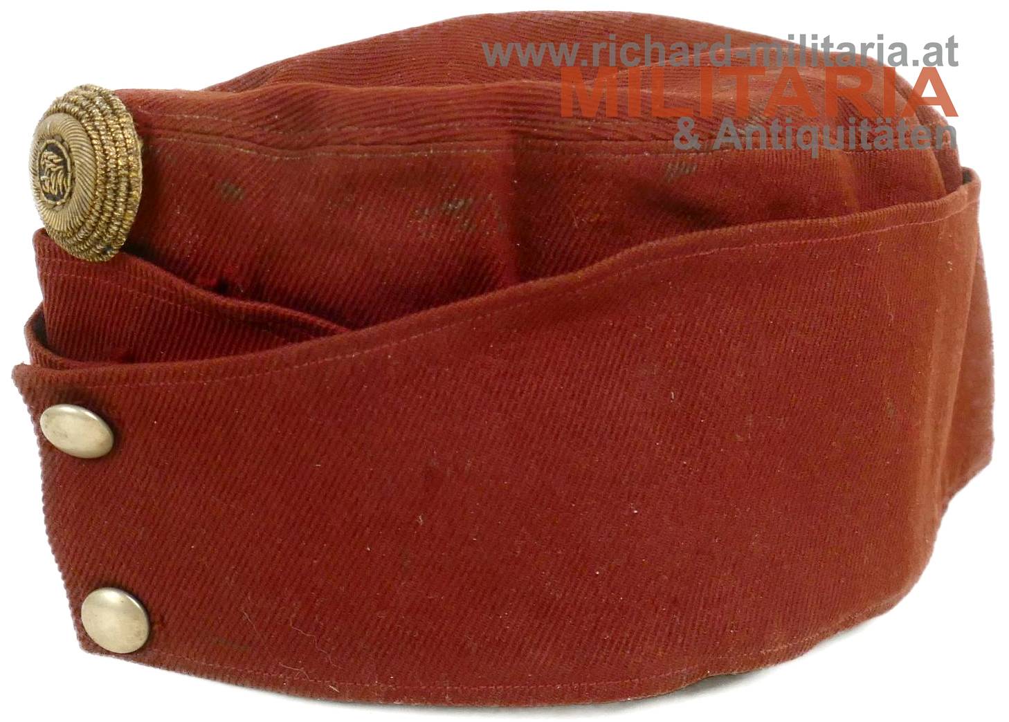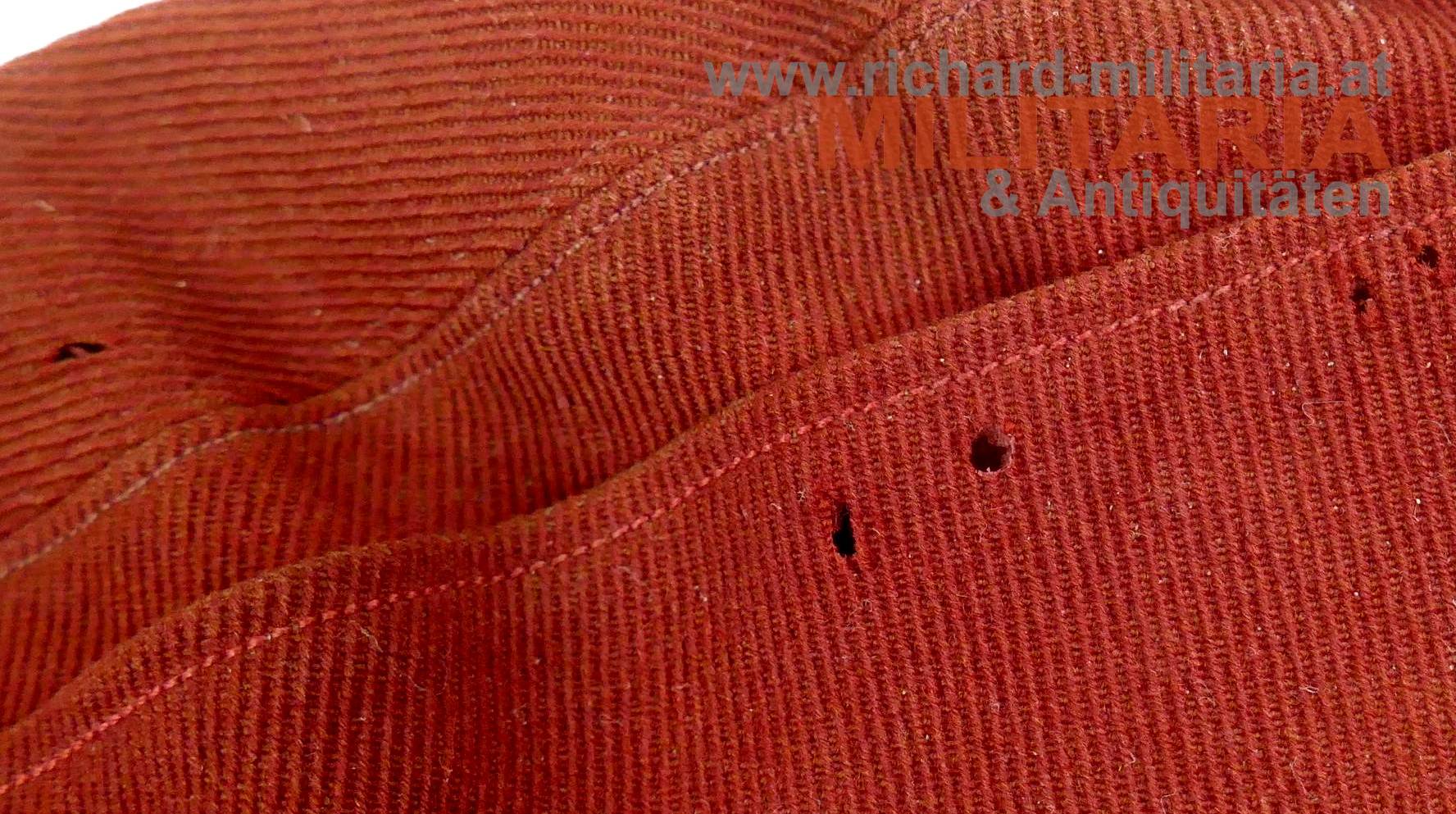 k.u.k. schirmlose rote Lagerkappe für Offiziere der Kavallerie; rotes Tuch; vorne mittig eine gestickte Offizierskokarde "FJ1" und 2 silberne Knöpfe; innen mit gelben dünnem Seidenstoff ausgelegt; dieses an mehreren Stellen zerschlissen; weiches dunkelbraunes Stirnleder mit Größenangabe "54 1/2"; mehrere kleine Mottenlöcher außen; auf der Oberseite etwas angeschmutzt;