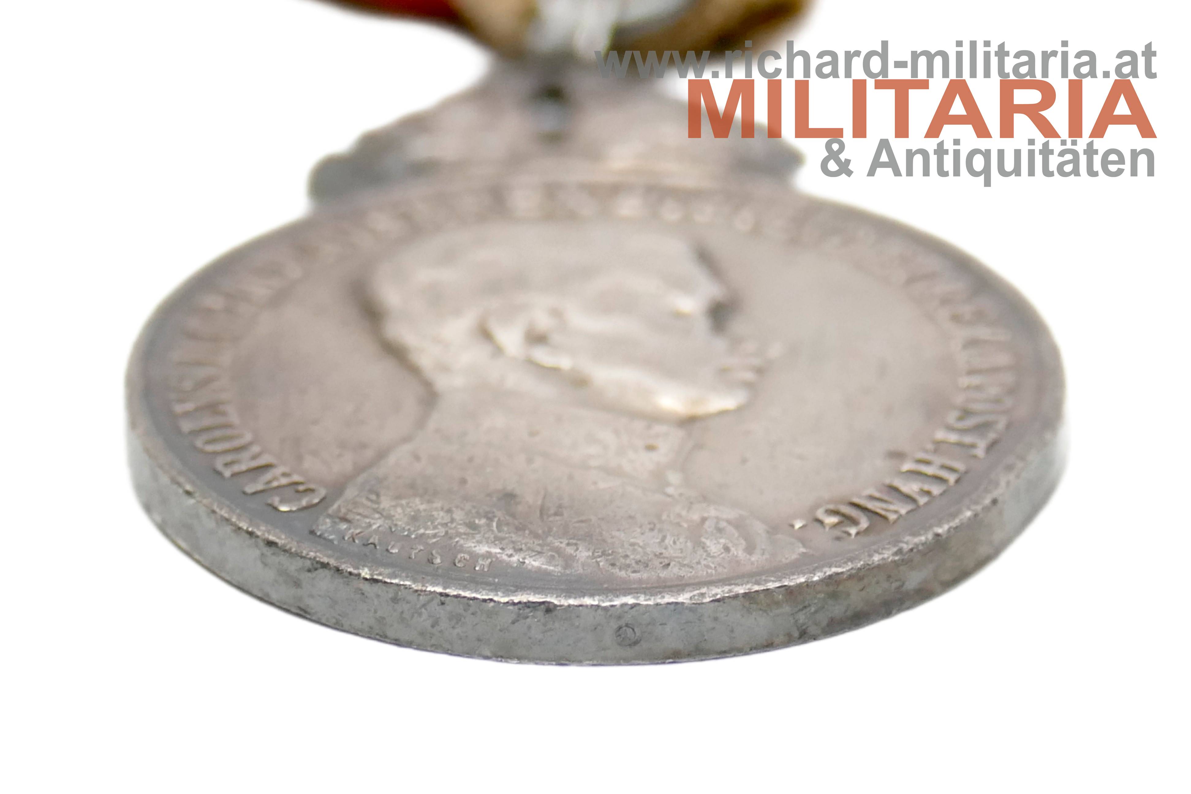 k.u.k. Silberne Militärverdienstmedaille Kaiser Karl mit Wiederholungsspange und Schwertern; Silber mit Kontrollamtspunze "A"; am Bande zum Militärverdienstkreuz; privat beschaffte rechteckige Wiederholungsspange mit aufgelegten klein ausgeführten Schwertern; Metall vernickelt;