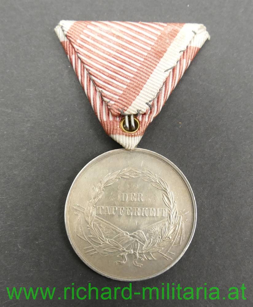 k.u.k. Silberne Tapferkeitsmedaille 1. Klasse Kaiser Franz Josef mit Verkaufsetui; Kontrollamtspunzierung "A"; dünne Ausführung; am originalen sehr schönen Band; zugehöriges schwarzes Verkaufsetui (Kartonetui); innen mit roter Einlage; am Etuiboden ein ausgeblichener, unleserlicher Stempel;