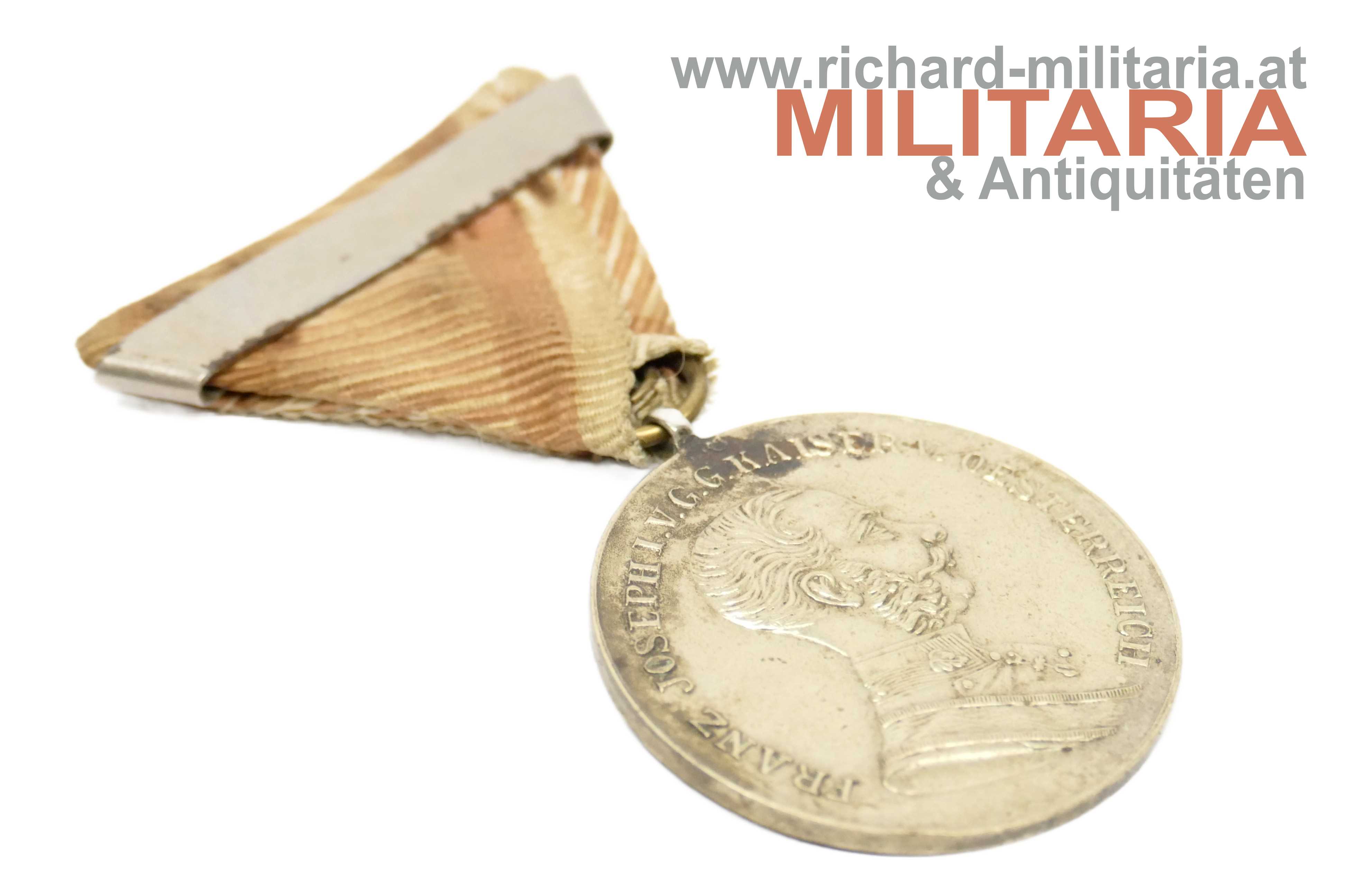 k.u.k. Silberne Tapferkeitsmedaille 1. Klasse - FJ1 - NACHKRIEGSFERTIGUNG; Metall versilbert; ohne Stempelschneider; am passenden Band mit zeitgenössisch vernähter Wiederholungsspange aus Eisen;
