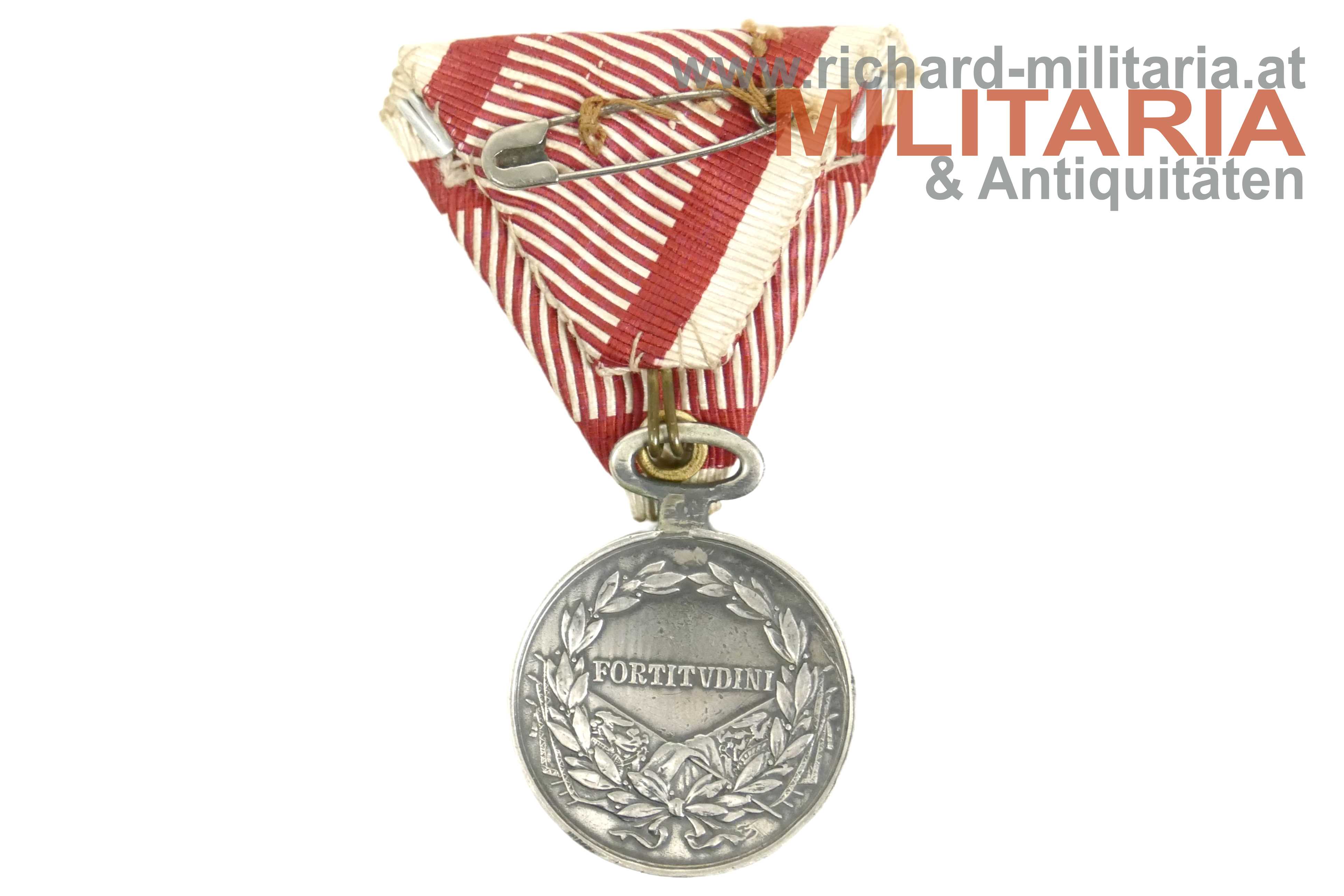 k.u.k. Silberne Tapferkeitsmedaille 2. Klasse Kaiser Karl; originale Tapferkeitsmedaille mit Kontrollamtspunzierung "A" mit ergänzter Henkelöse (privat gefertigt); Stempelschneider "Kautsch"; am originalen Band mit zeitgenössisch vernähter Trageklammer revers;