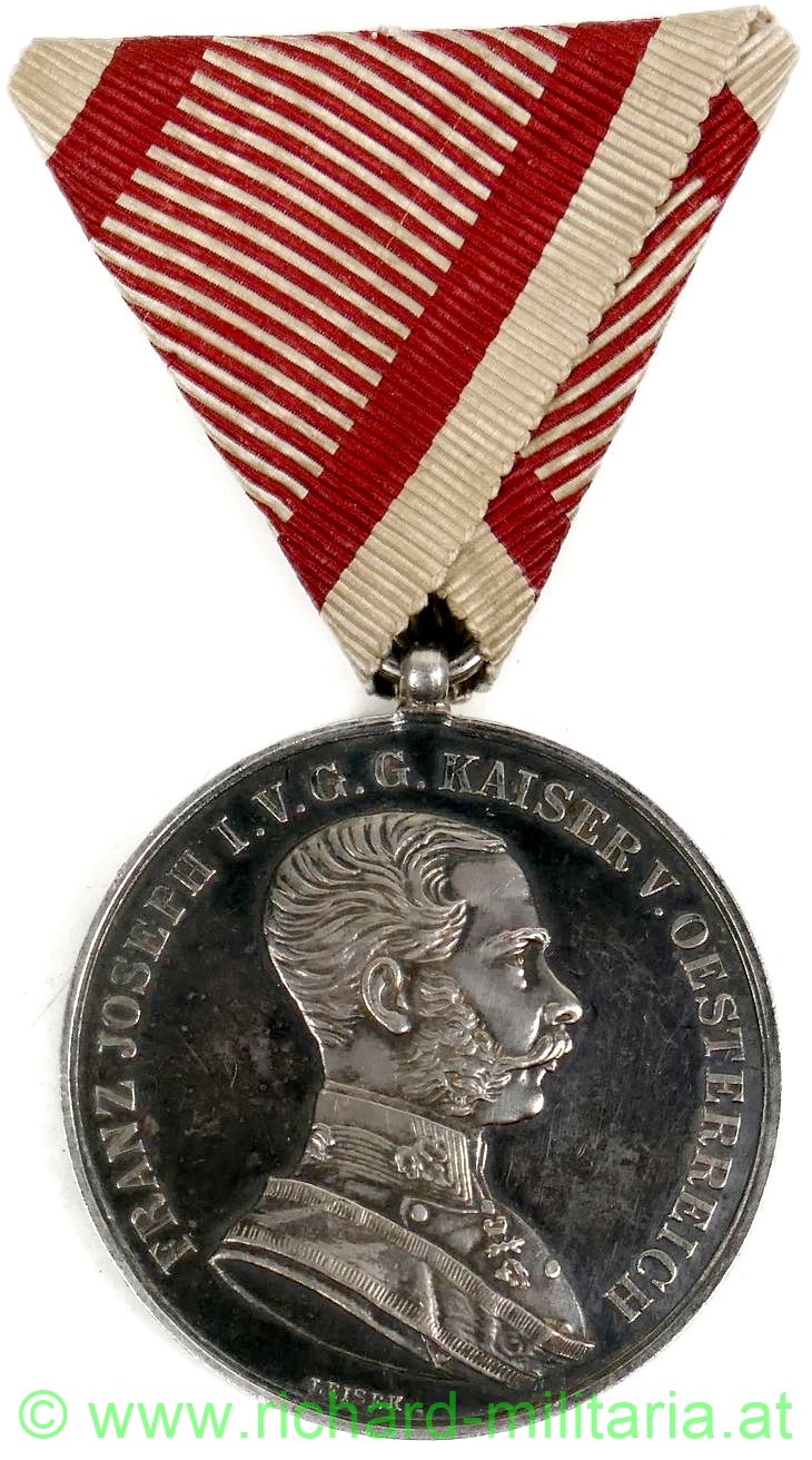 k.u.k. silberne Tapferkeitsmedaille I. Klasse Kaiser Franz Josef; mit Kontrollamtspunzierung "A"; Stempelschneider Leisek; am originalen Band;