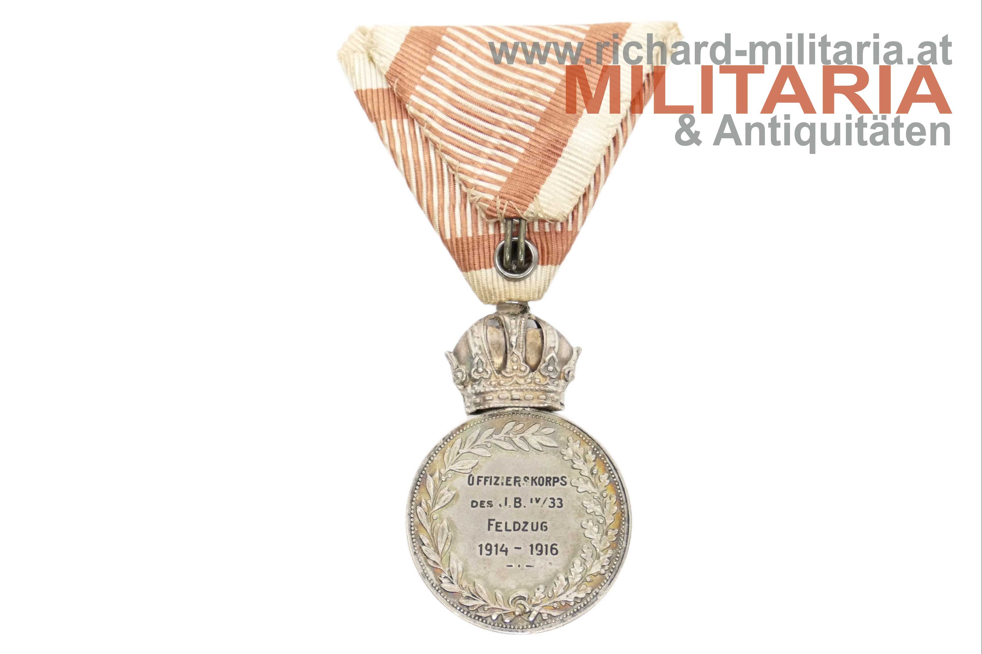 k.u.k. Silbernes Signum Laudis FJ1 mit Schwertern - WIDMUNGSSTÜCK; am Bandring die Herstellerpunzierung "HUW" (Heinrich Ulbrich's Witwe) und eine Windhundpunzierung; große Ausführung (32mm Durchmesser); revers mit der Gravur "Offizierskorps des J. B. IV/33 Feldzug 1914-1916"; am originalen Band mit aufgesplinteten Schwertern;