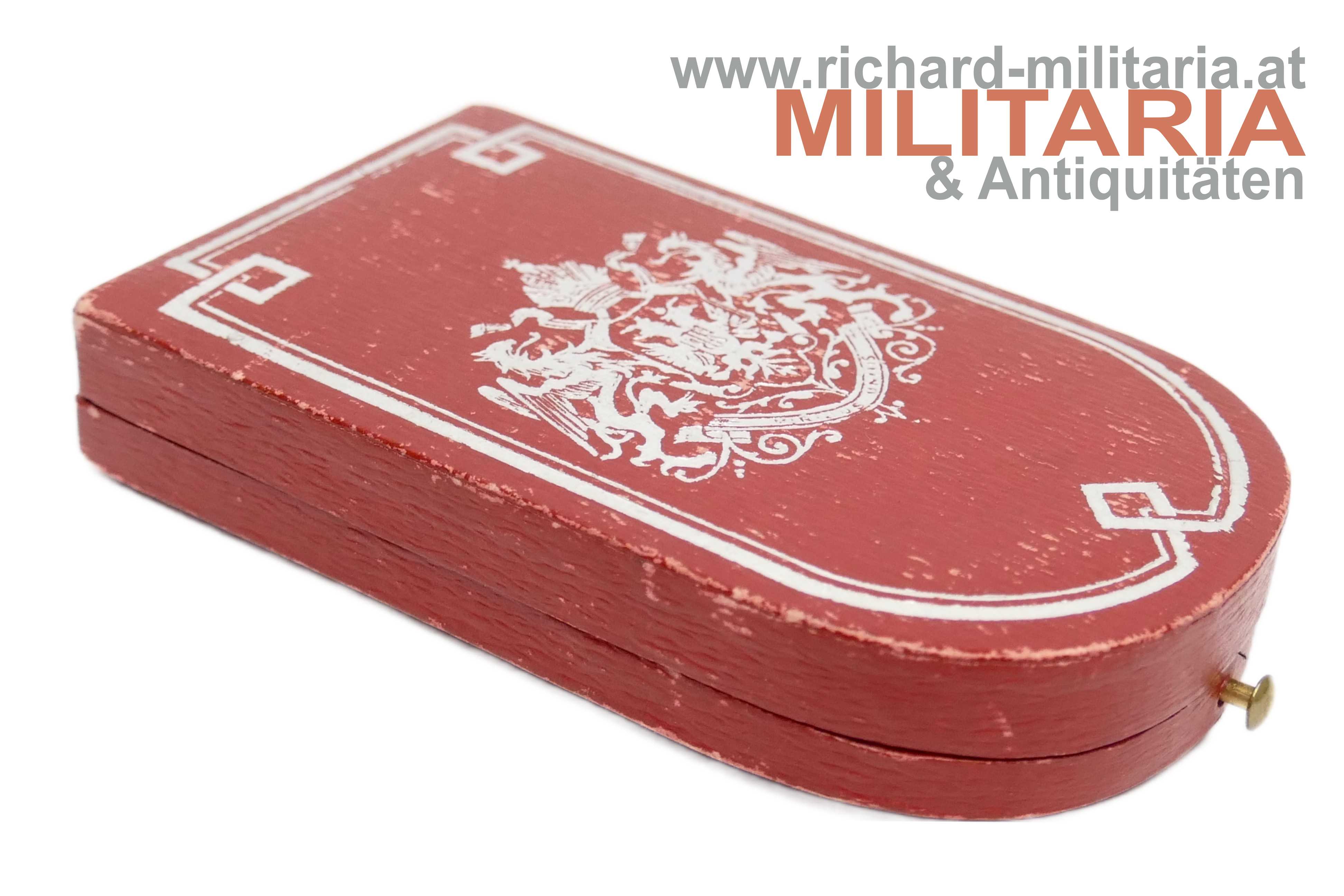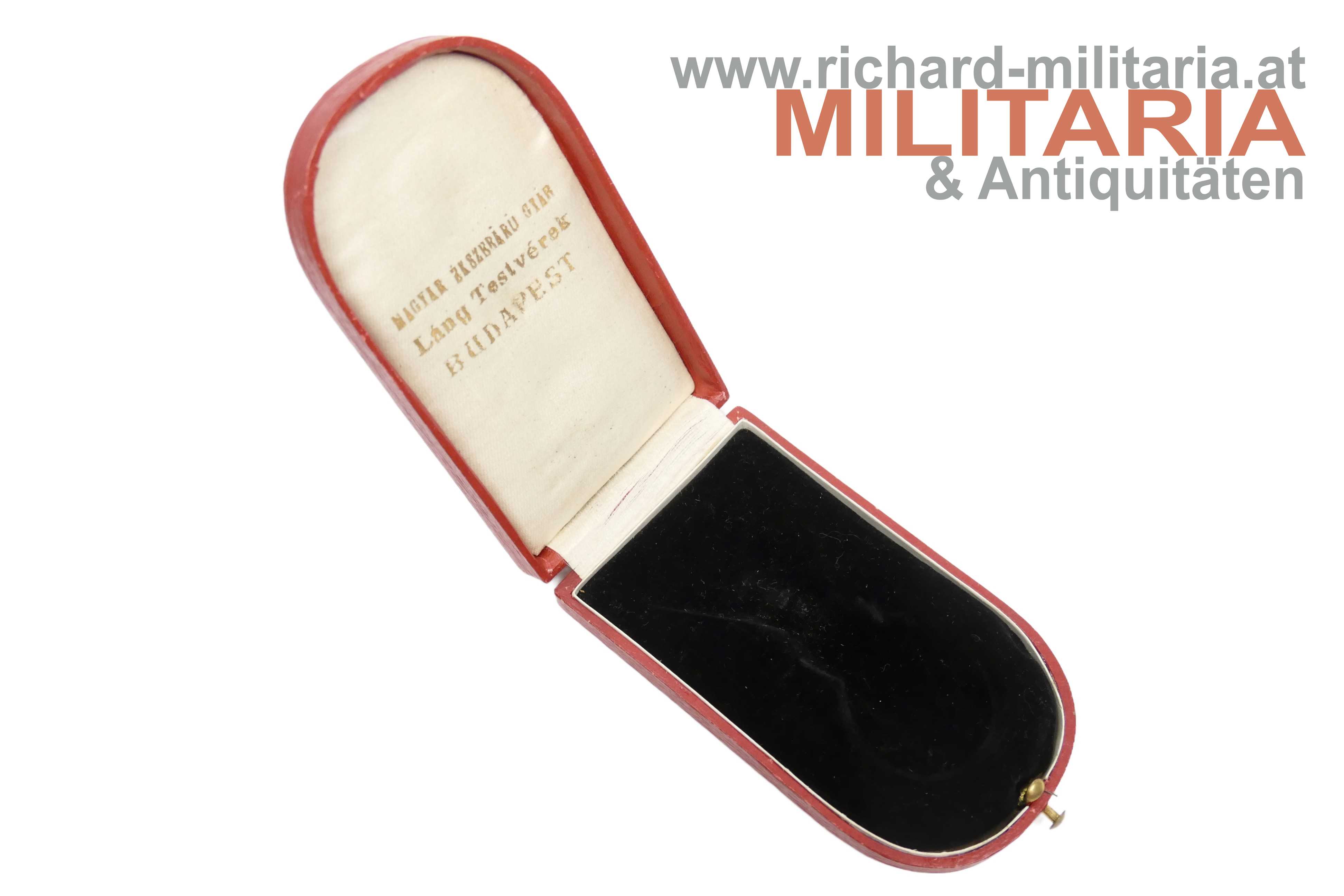 k.u.k. Silbernes Signum Laudis Kaiser Franz Josef mit Wiederholungsspange und Schwerter im Etui; am Bandring Windhundpunzierung und Herstellerpunzierung "JZ" (Josef Zimbler); Randpunzierung "A"; Medaille mit dunkler Patina; Wiederholungsspange mit Schwerter auf das originale Band aufgesplintet; im passenden Etui des Herstellers Láng Testvérek; farbfrisches Etui mit altersüblichen Abnutzungsspuren;