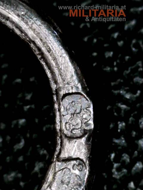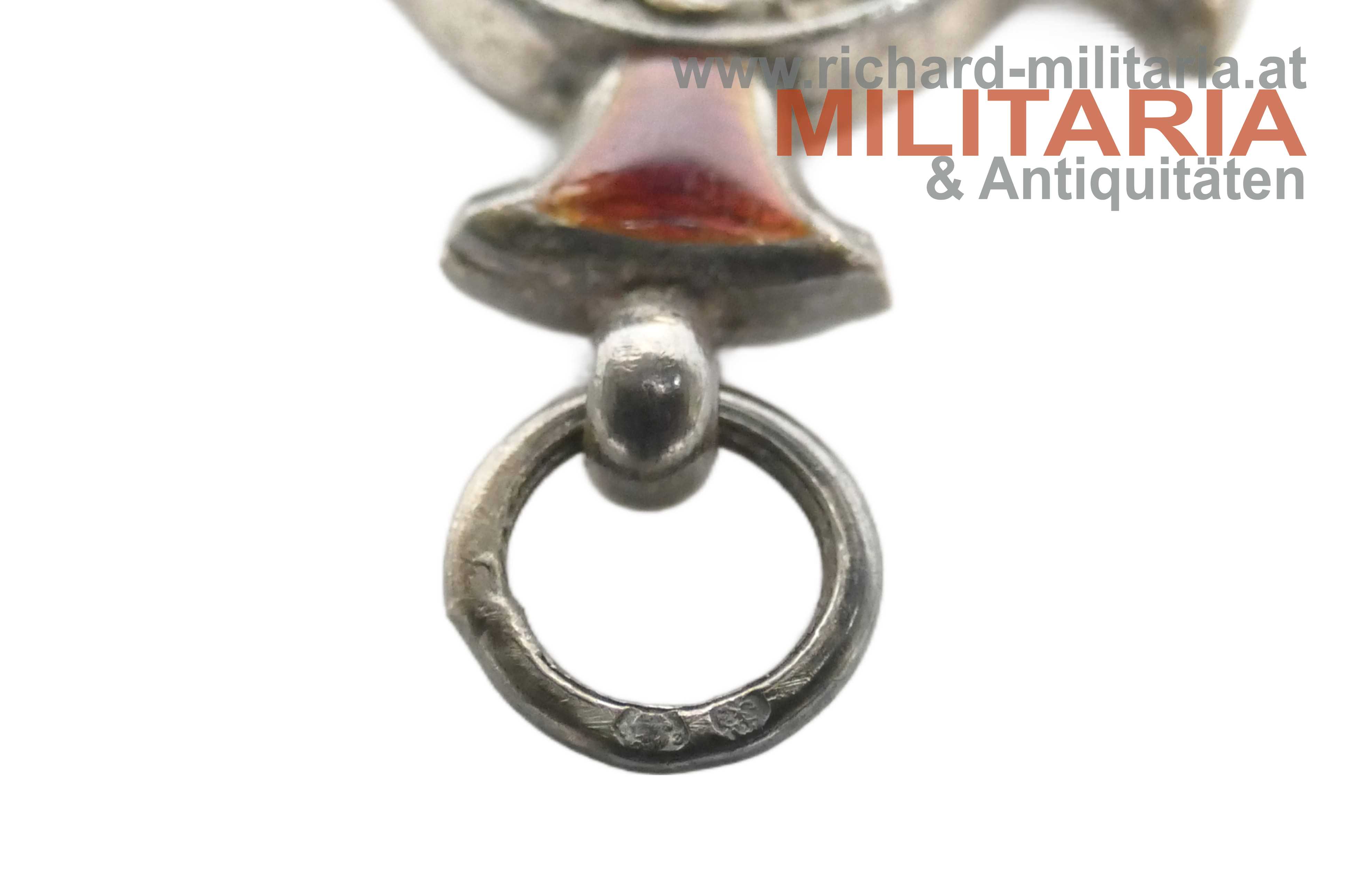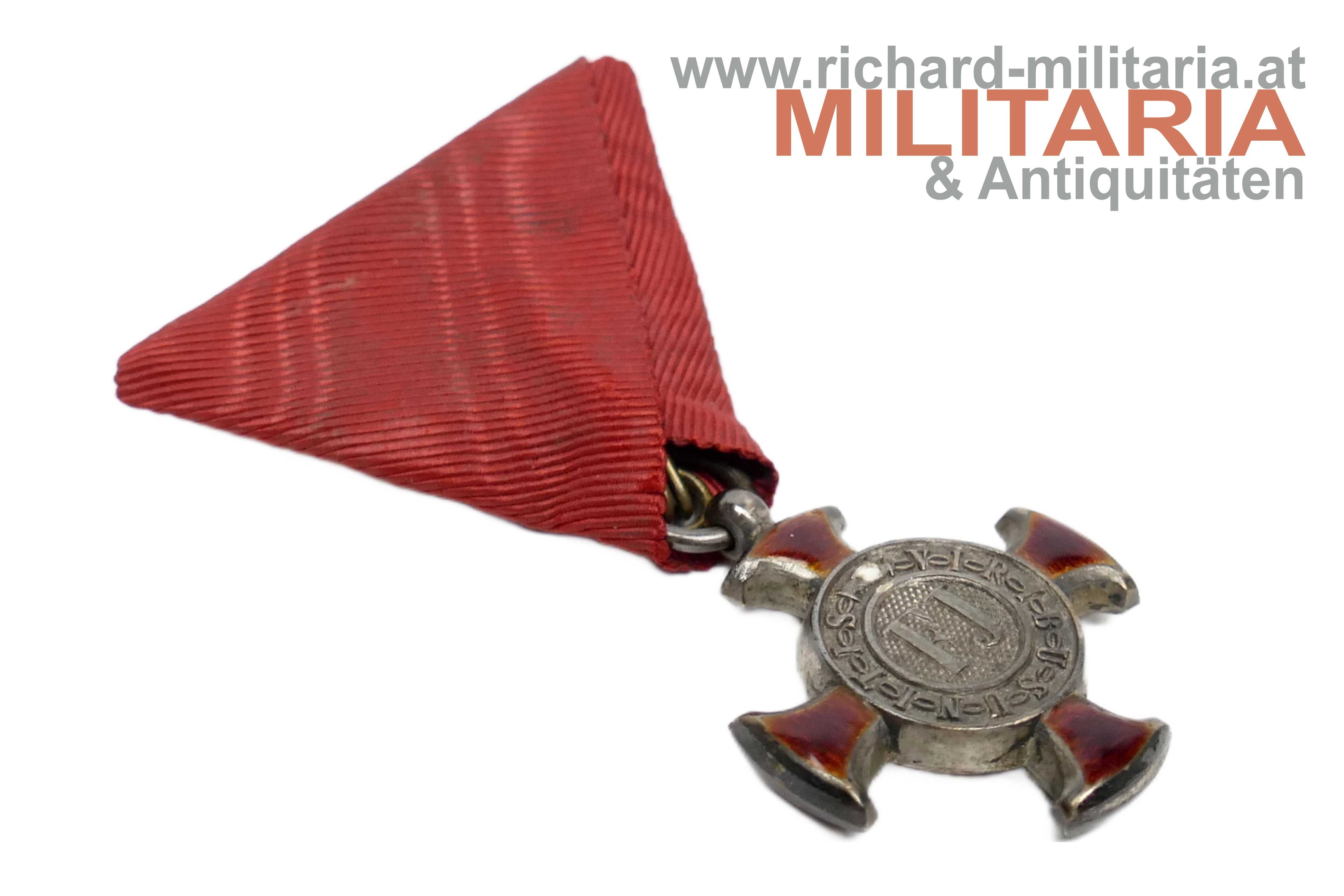 k.u.k. Silbernes Verdienstkreuz; SIlber; Dianakopfpunzierung und Herstellerpunzierung am Ring; Punzierung vermutlich "BSW" (Brüder Schneider Wien); Emaillierung einwandfrei; am originalen roten Friedensband;