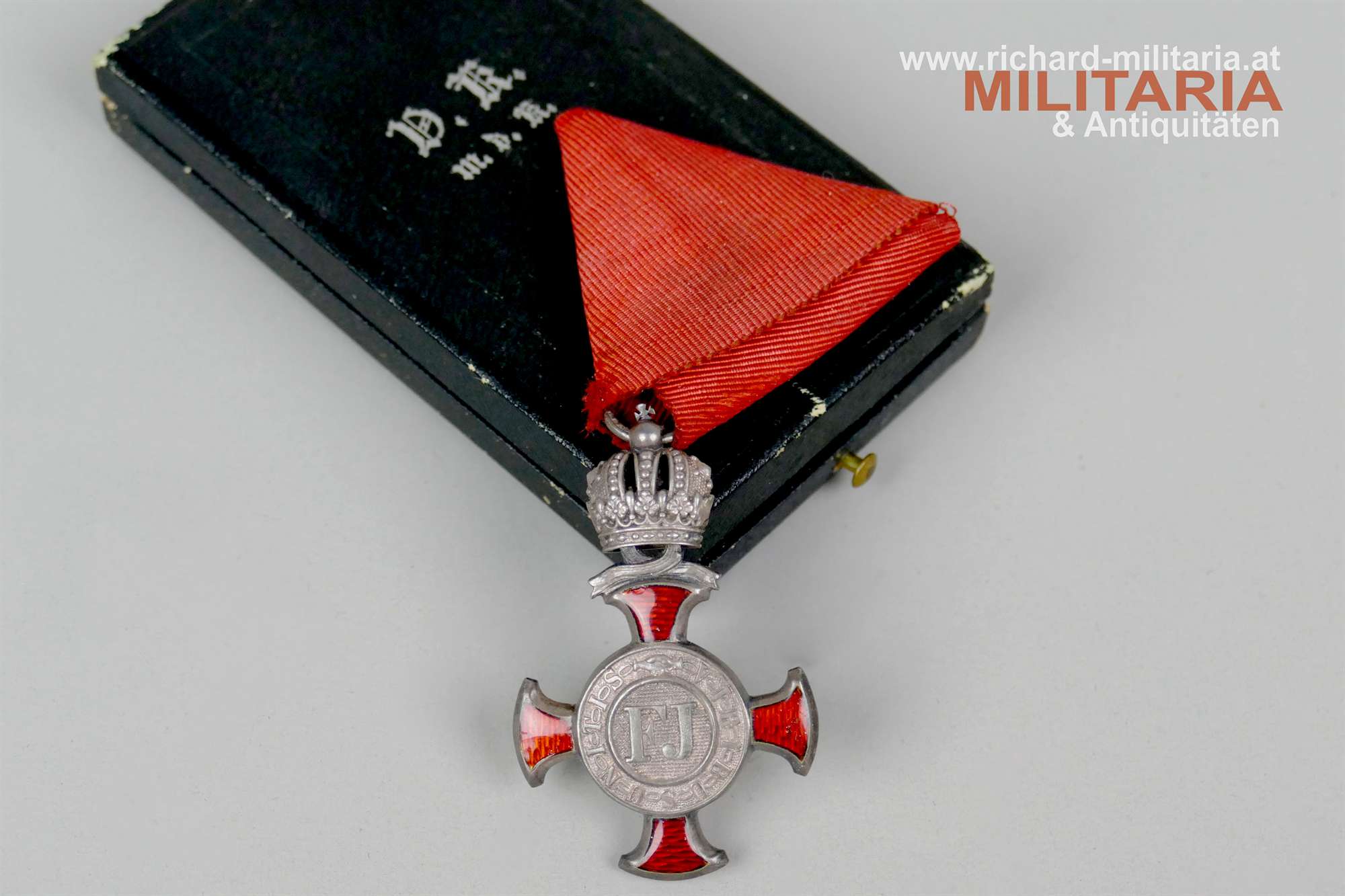 k.u.k. Silbernes Verdienstkreuz mit der Krone mit Etui; Herstellerpunzierung "V. Mayers Söhne", Dianakopfpunzierung und "In Wien" am Bandring; minimale Tragespuren; mit leicht angeschmutztem originalen Friedensband; schwarzes Etui mit silbernem Deckelaufdruck; auf der Unterseite mit "1918" gestempelt; leichtere Abnutzungsspuren auf der Außenseite;