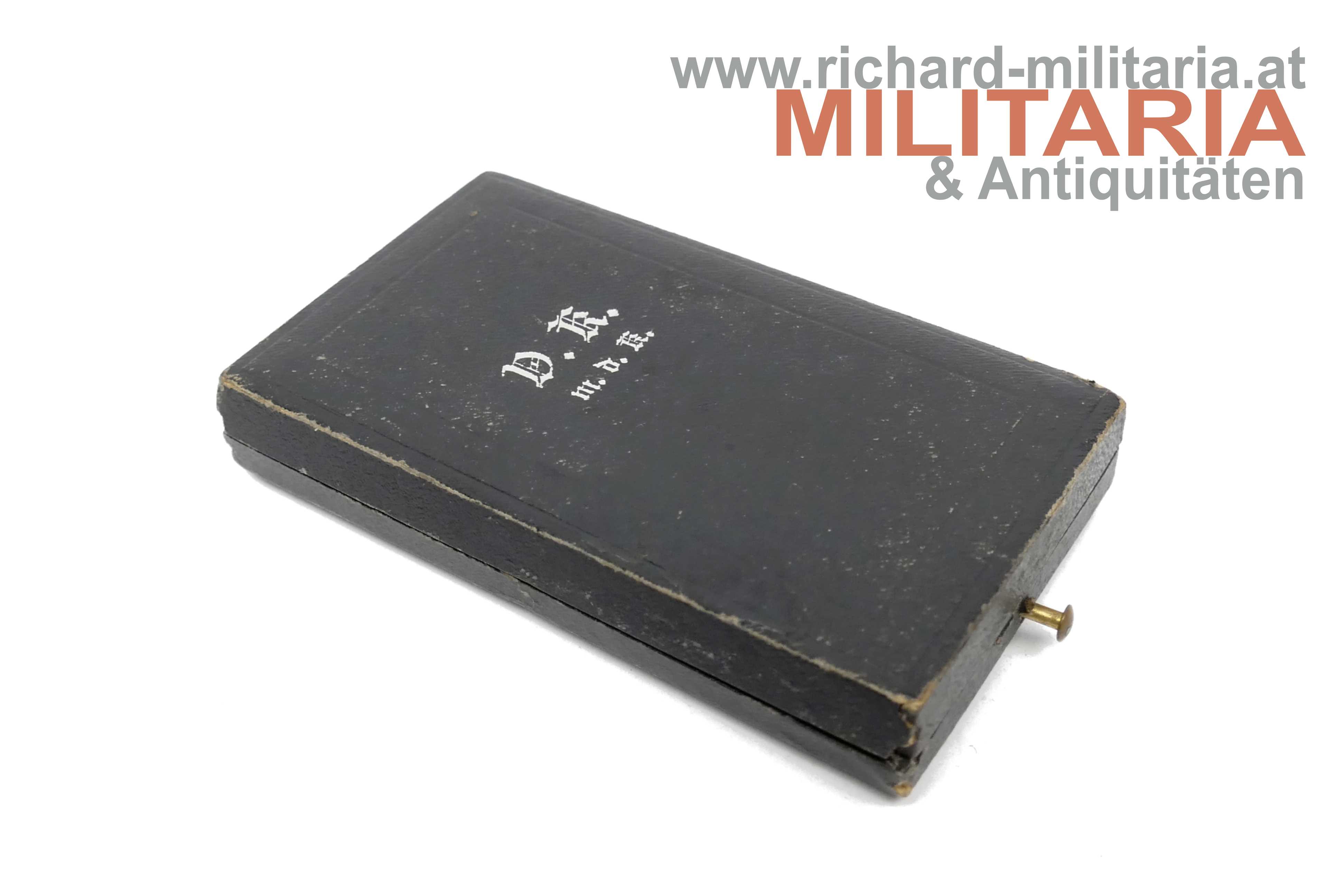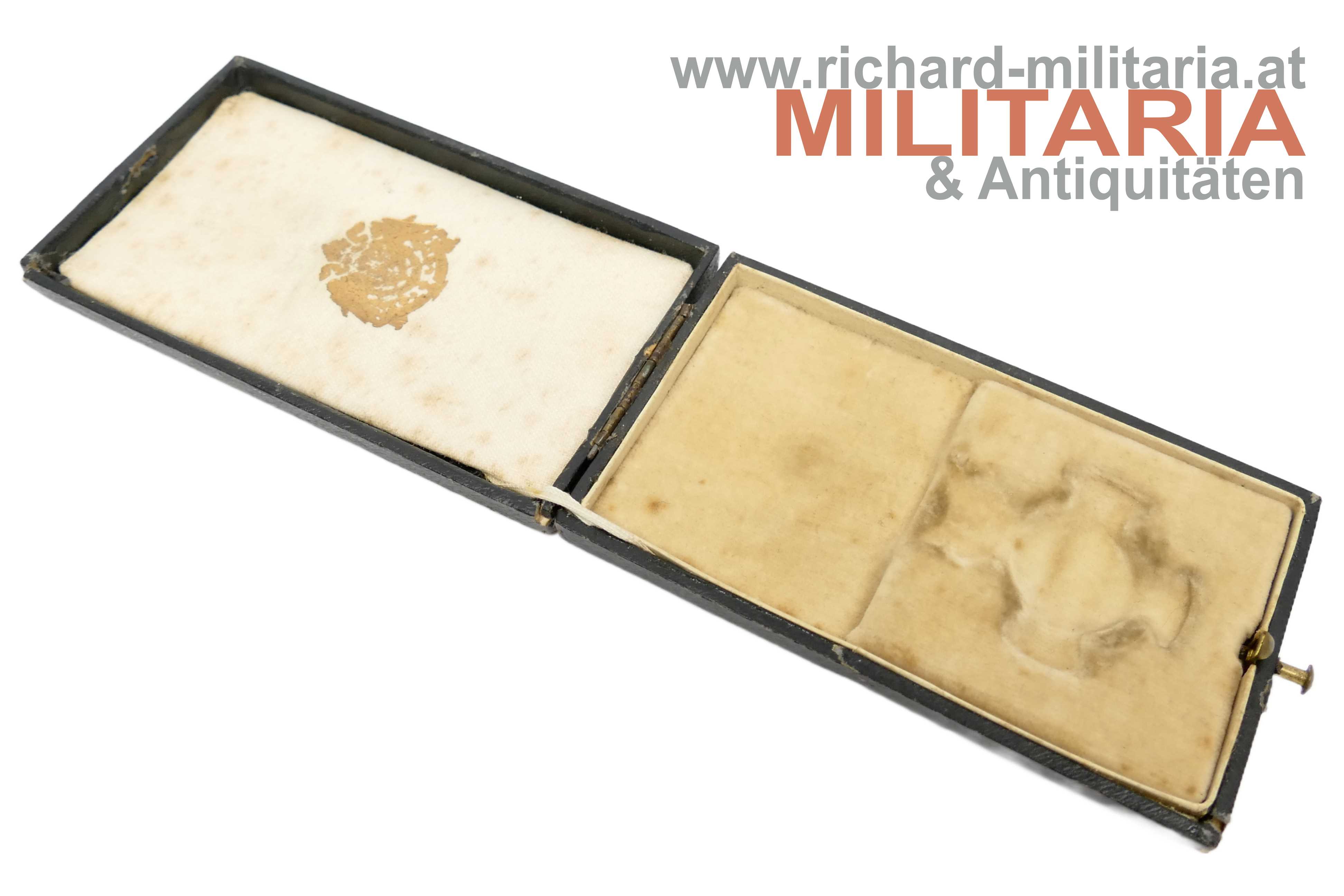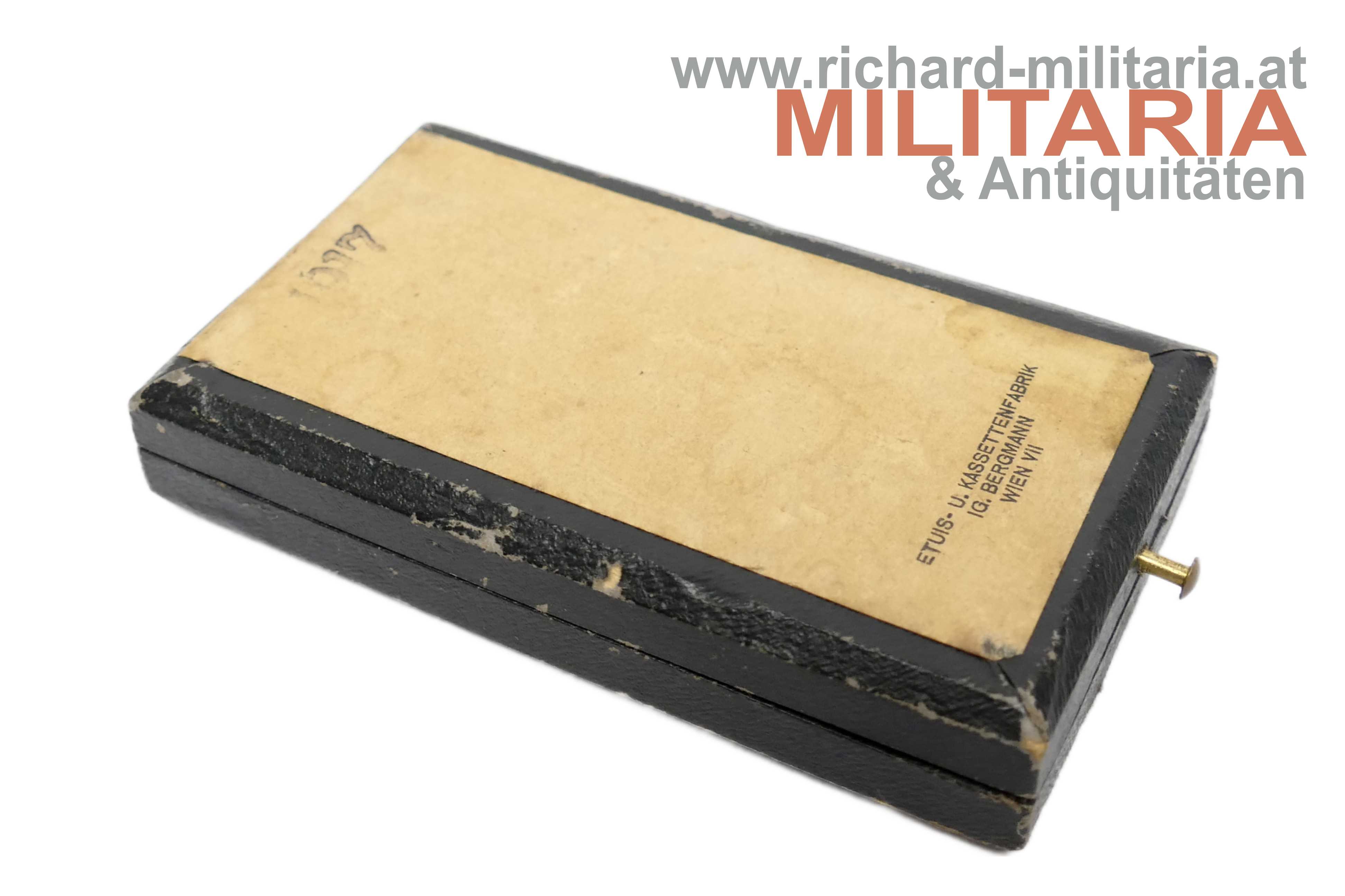 k.u.k. Silbernes Verdienstkreuz m.d.K. mit Etui; Variante mit RUDOLFSKRONE; Windhundpunze und eine weitere undeutliche Punze im Ring; ungefütterte Krone; feine Fertigung mit rotem Band aus der Nachkriegszeit; im originalen Etui mit silbernem Aufdruck "V.K. m.d.K." und Bodenstempel "1917";