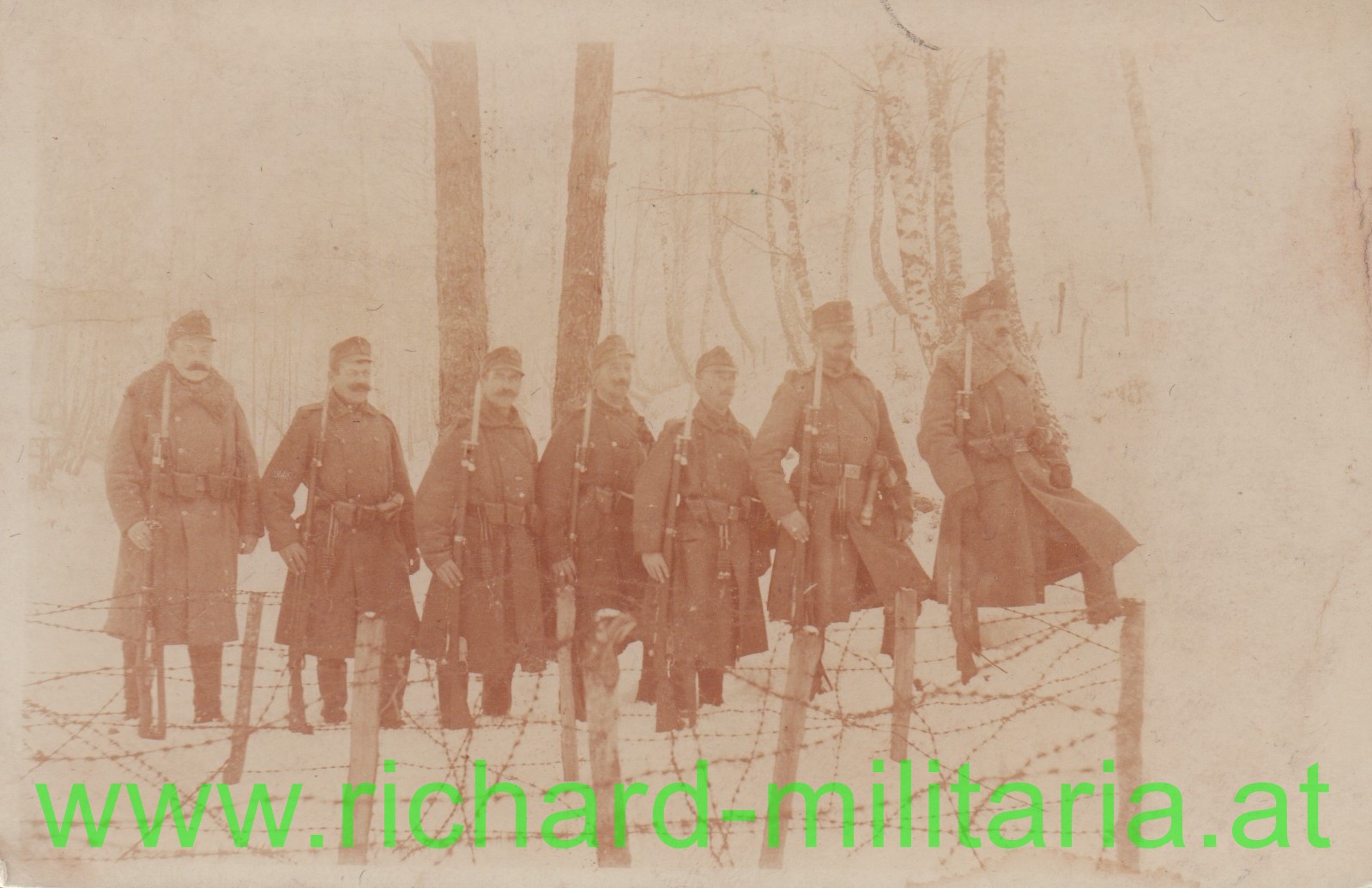 Produktinformationen "k.u.k. Soldaten mit Handgranaten und aufgepflanztem Bajonett im Winter hinter Stacheldraht"