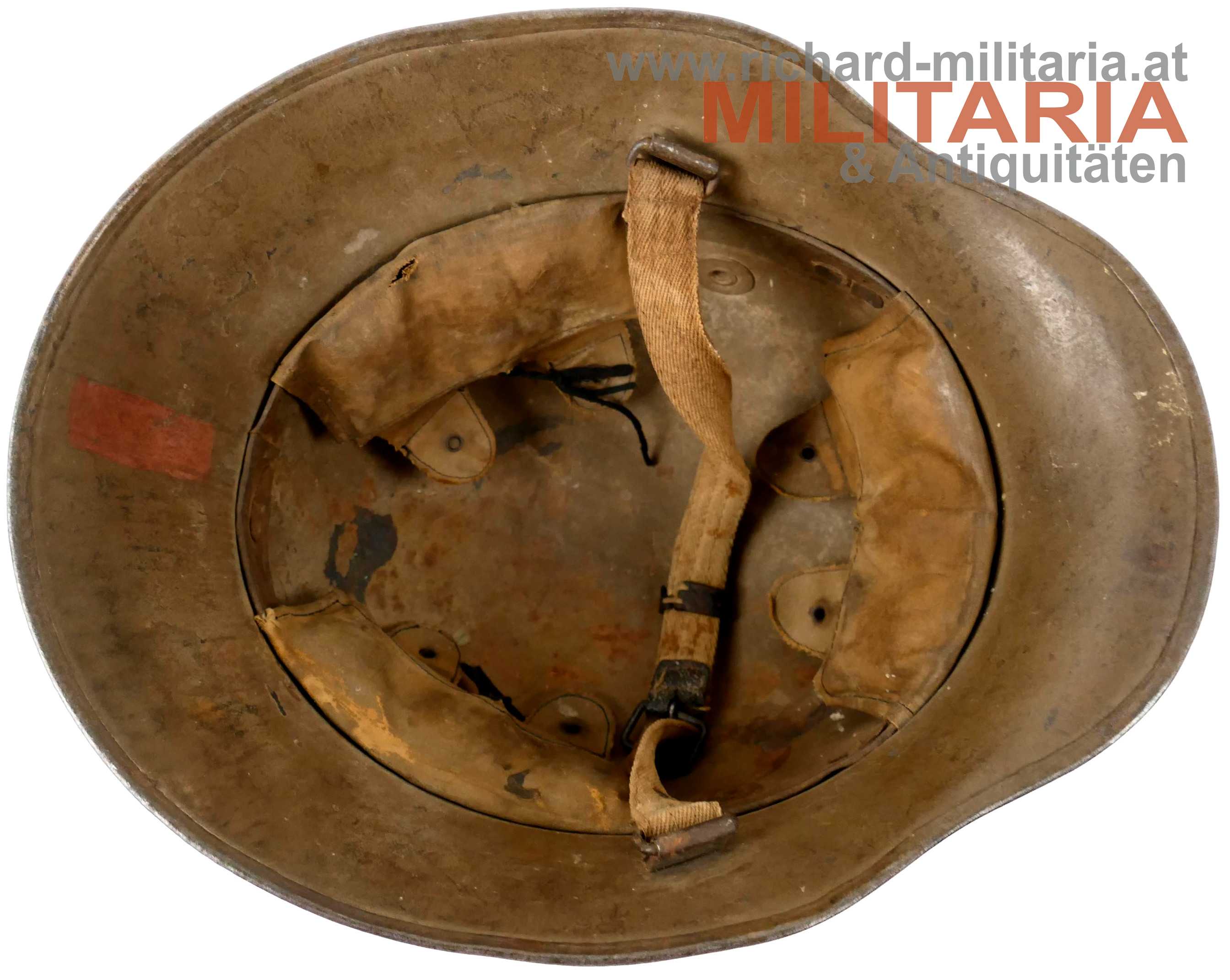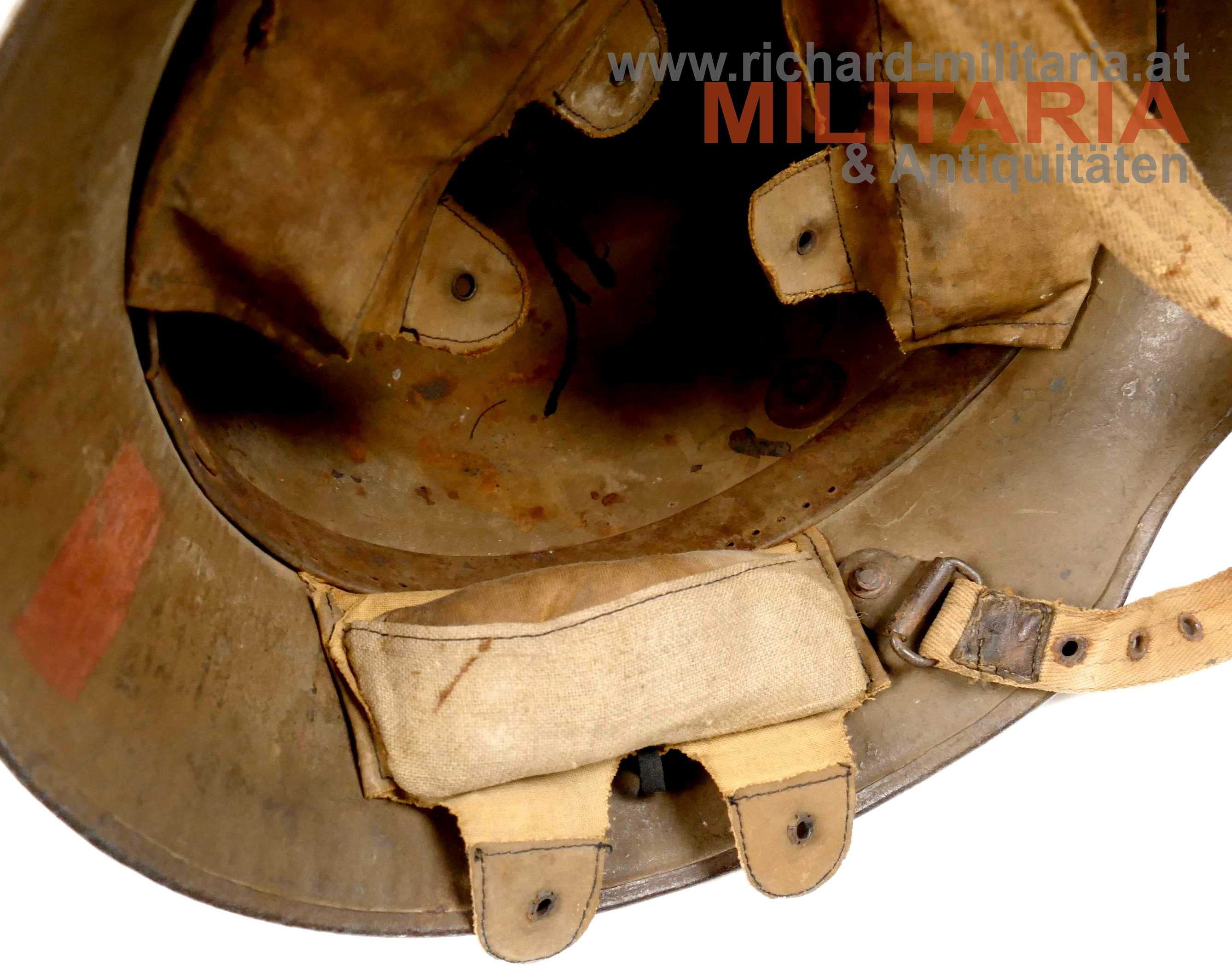 Am Nackenschutz auf der Innenseite - roter Streifen - Zeichen für Helme zweiter Wahl (!) - diese durften nicht in der vordersten Linie eingesetzt werden!