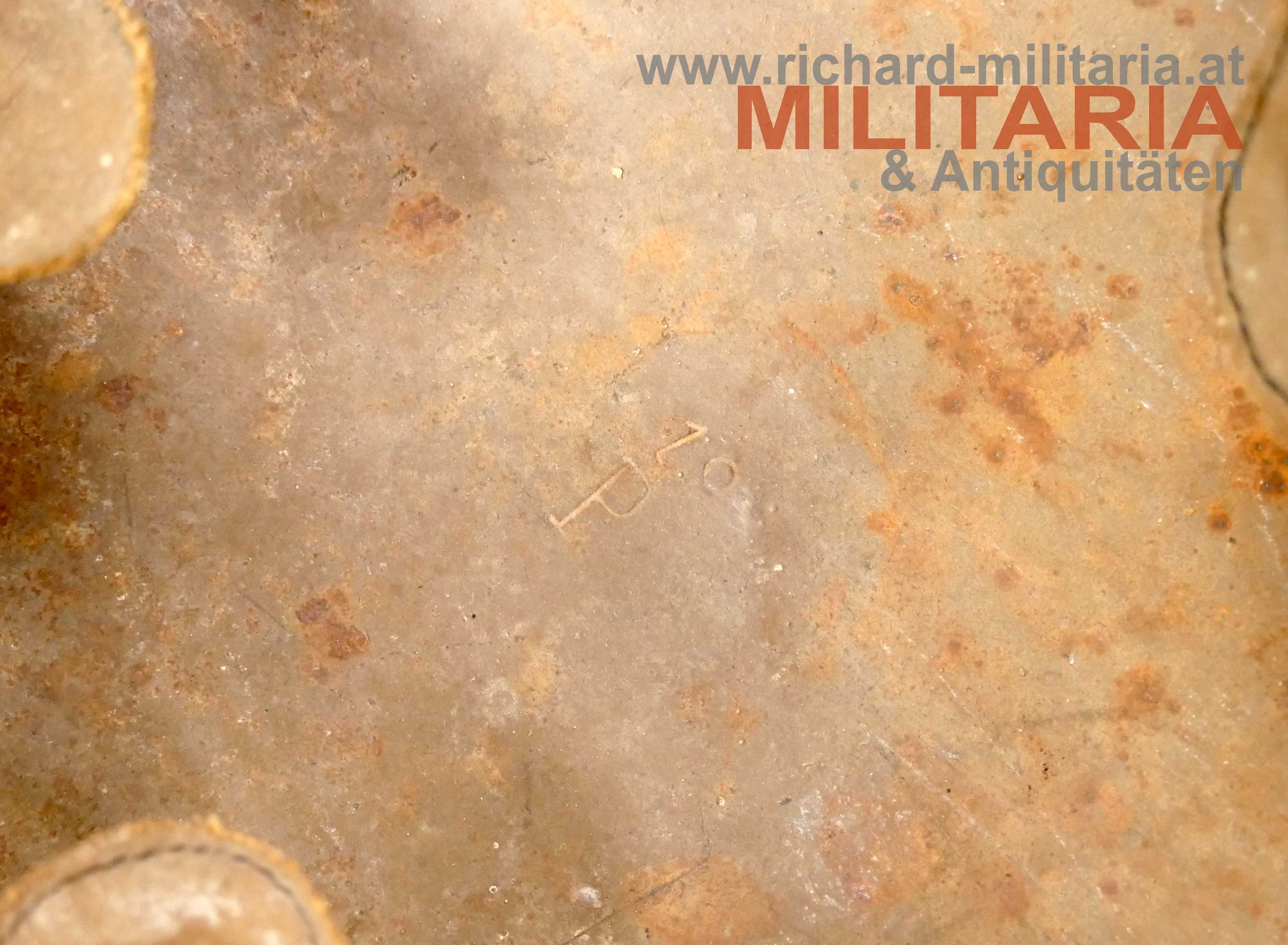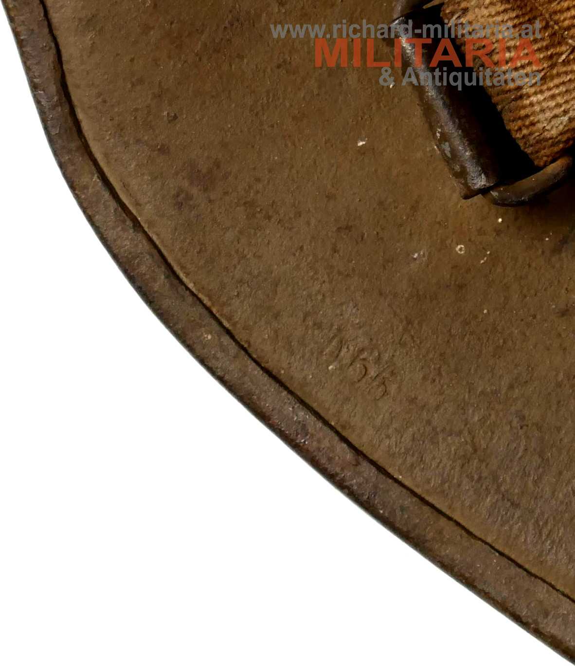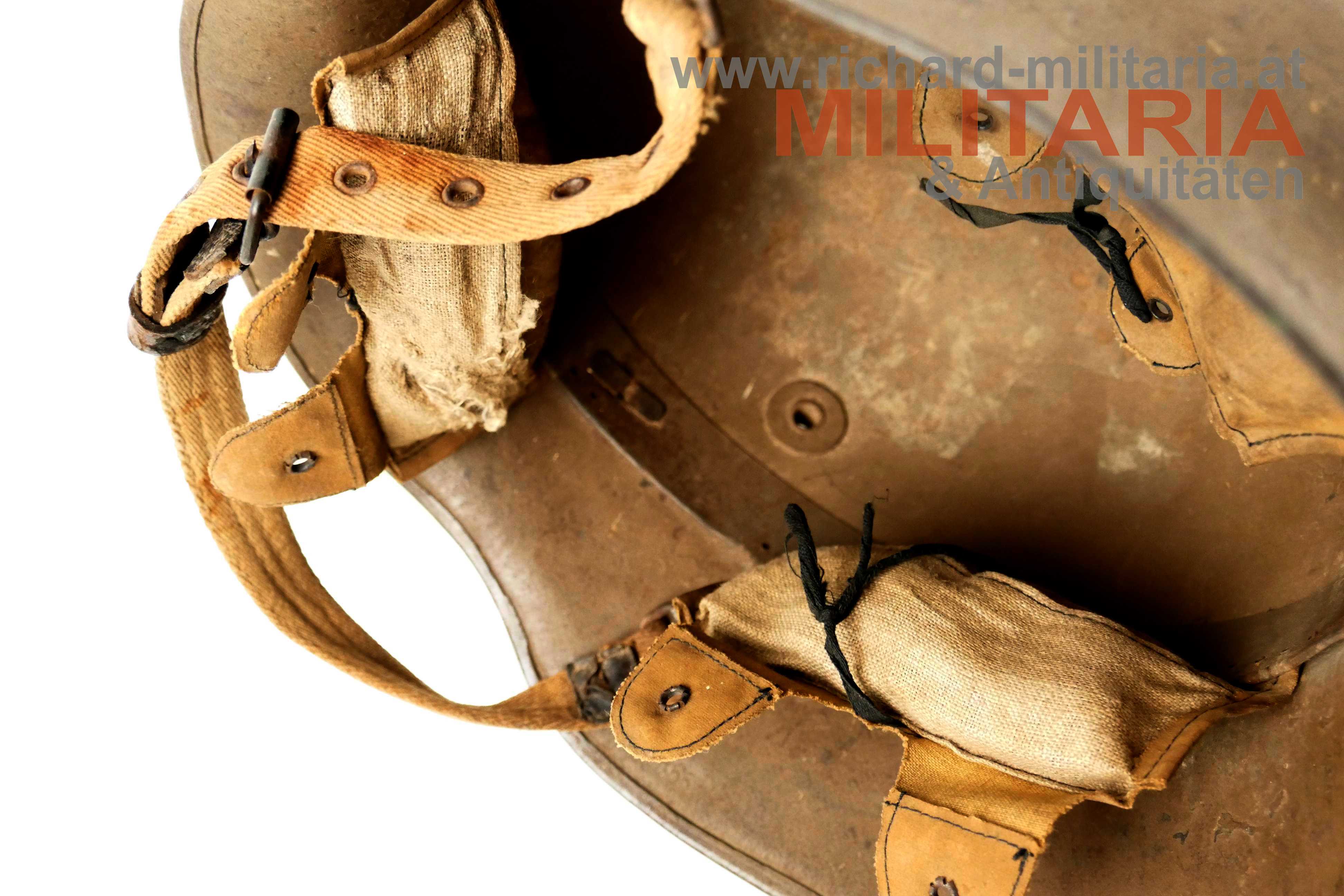 k.u.k. Stahlhelm M17 nach österreichischem Muster - Ausschusshelm - nicht geeignet für den Einsatz in der vordersten Linie (!); originale Lackierung noch sehrgut erhalten; Hersteller "B" (Berndorfer) - Größenstempel: "66" auf der rechten Innenseite; originaler Innenring mit den sehr seltenen und noch original vernähten Ersatzlederlappen mit Rosshaarpolsterungen; originaler Kinnriemen aus Leinen am Ende mit Leder verstärkt; Helmdom mit minimaler Beule, im Dom gestempelt "P 19".