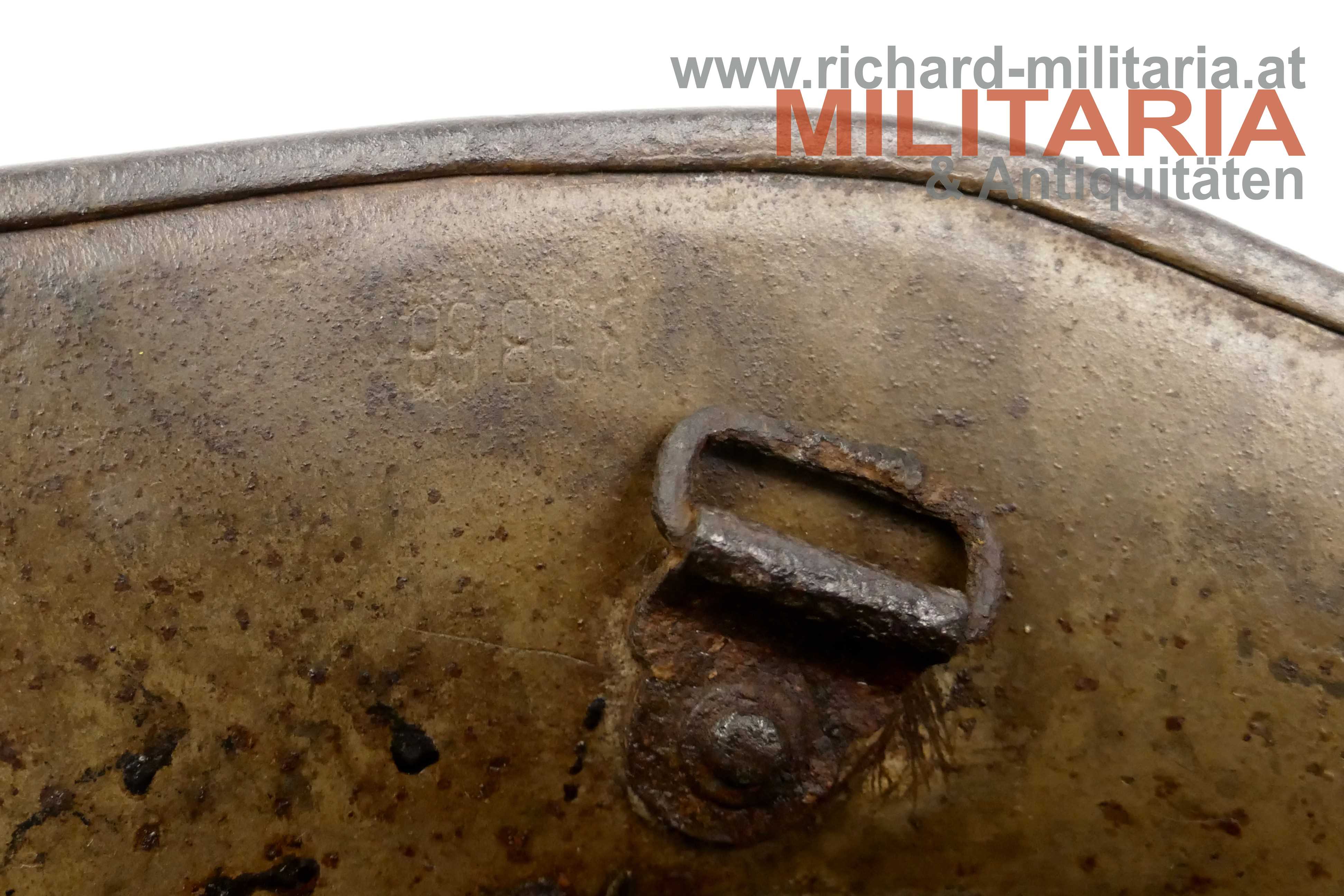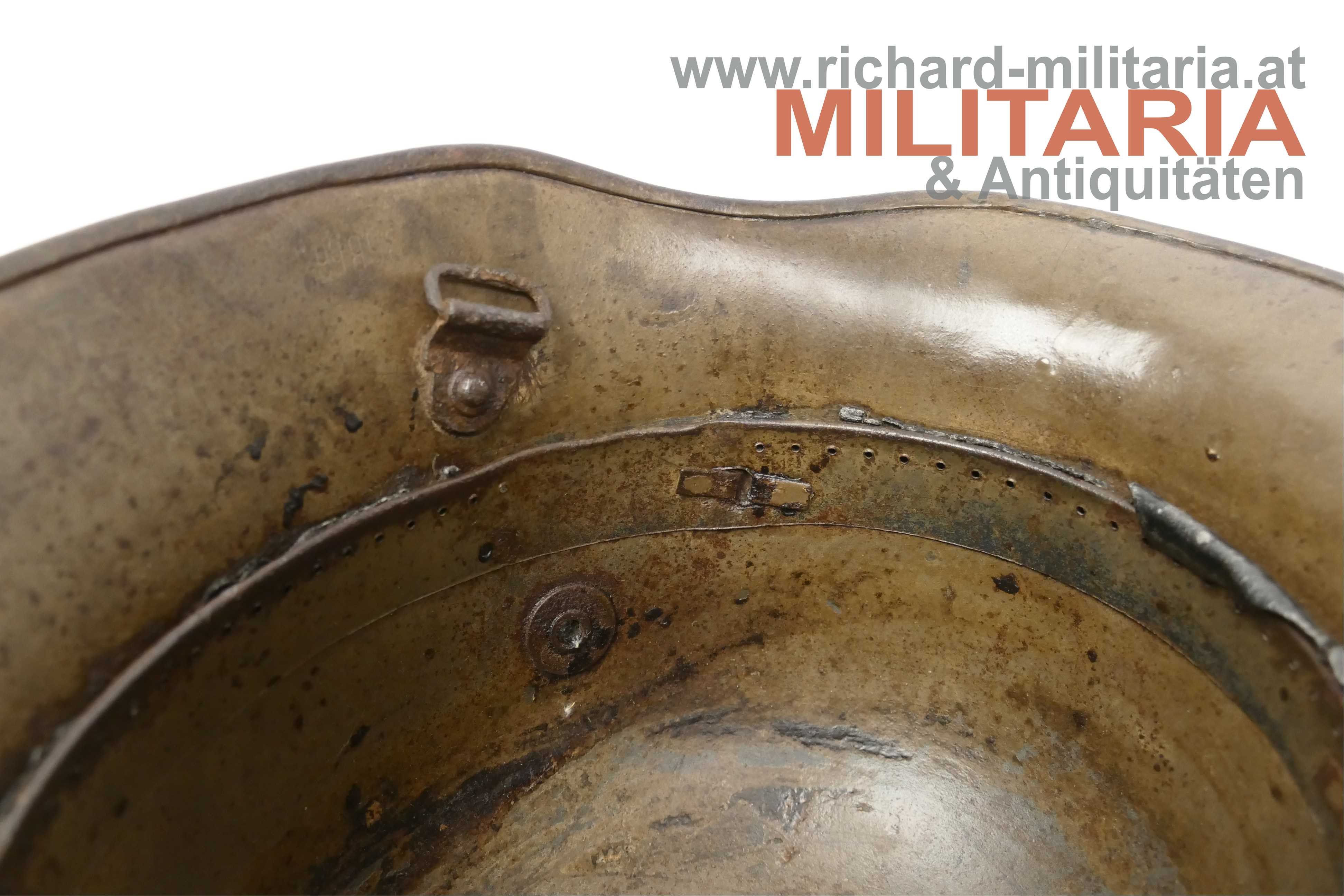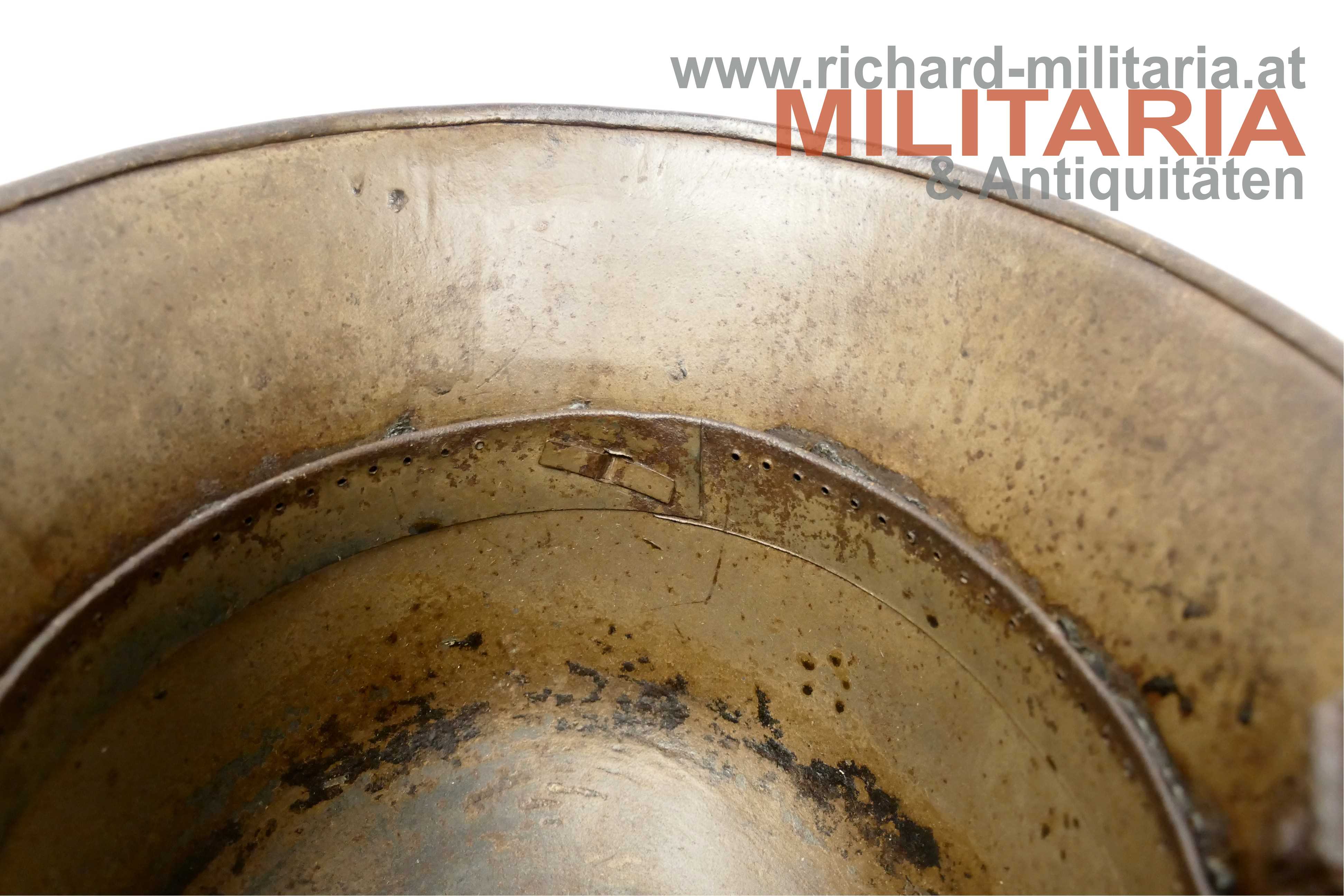 k.u.k. Stahlhelm M17 - "P 47"; Helmglocke mit viel originaler "isonzobrauner" Lackierung; oben auf der Helmglocke mit "P 47" markiert; rechts auf der Innenseite neben der Einhängelasche die Stempelung "BGB 66" (Brüder Gottlieb und Brauchbar Brunn und Helmgröße 66); Innenfutter fehlt; Helminnenring original vernietet; dahinter noch steife Reste des Innenfutters vorhanden; an der linken Kinnriemenhalterung noch ein steifes Stück des Riemens vorhanden;