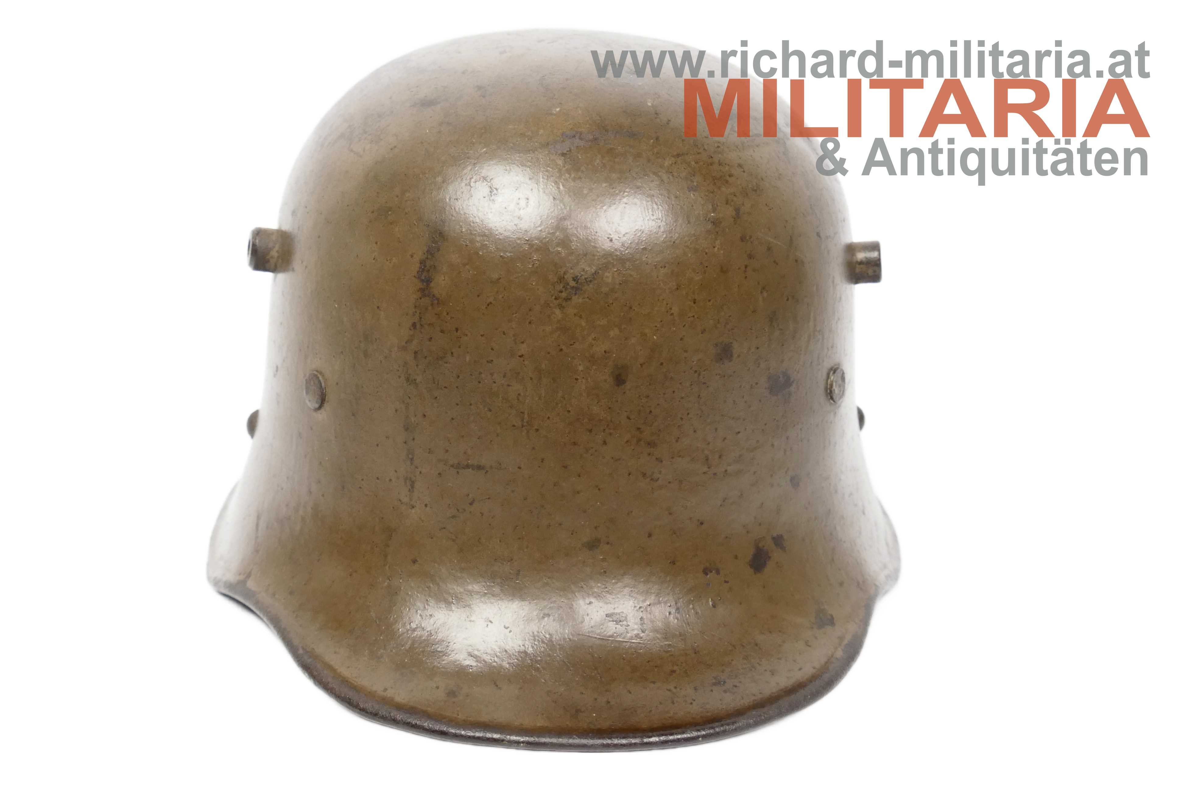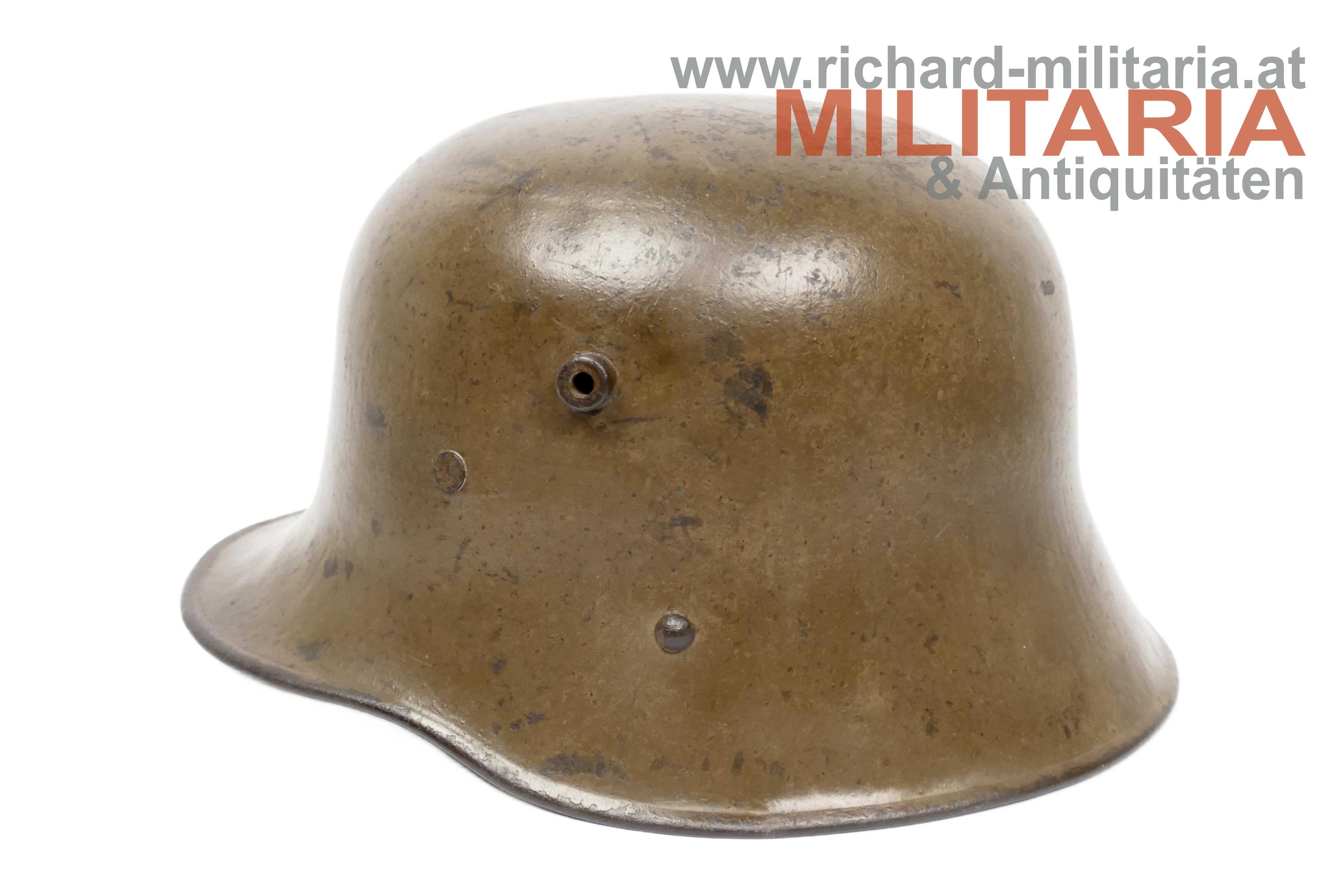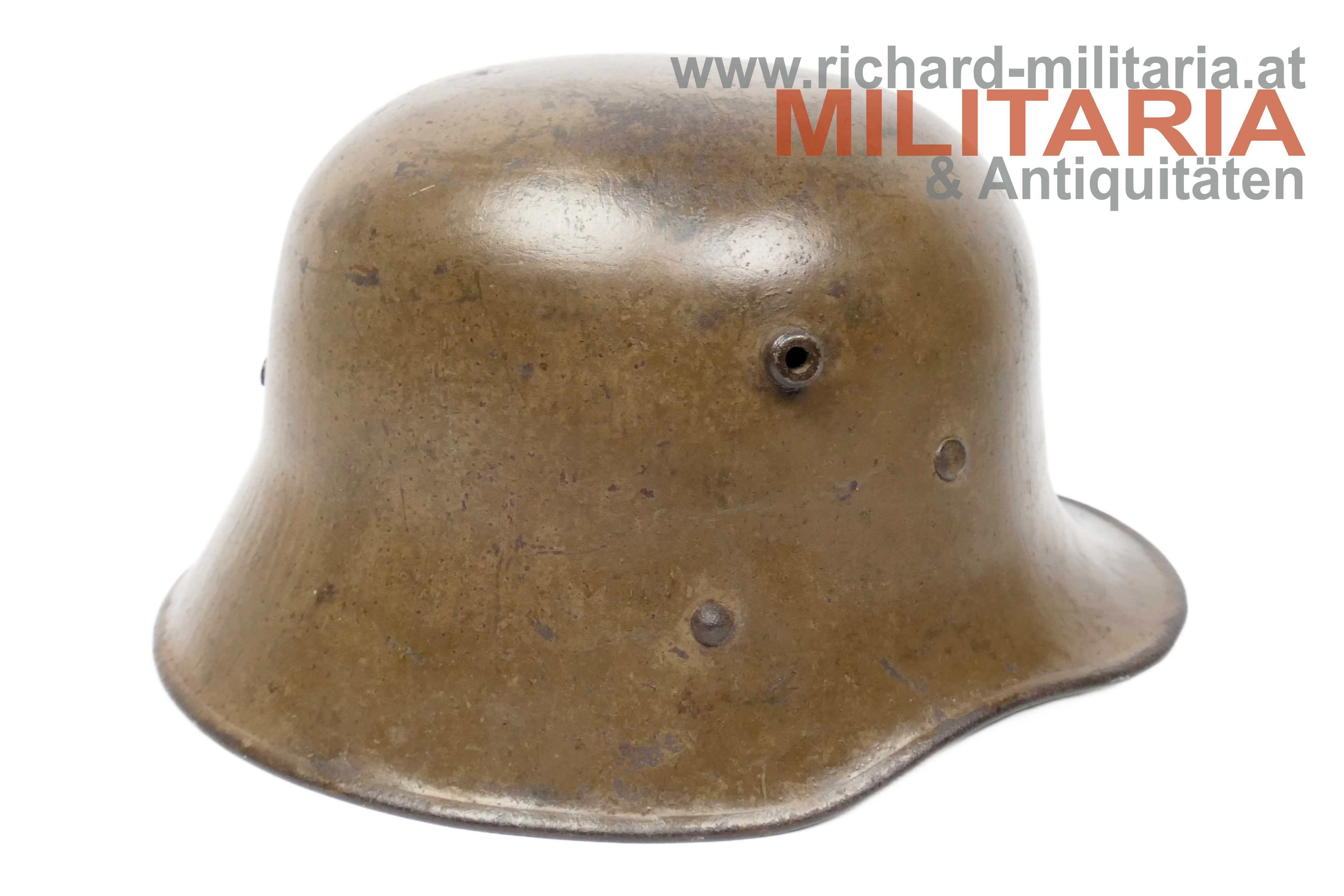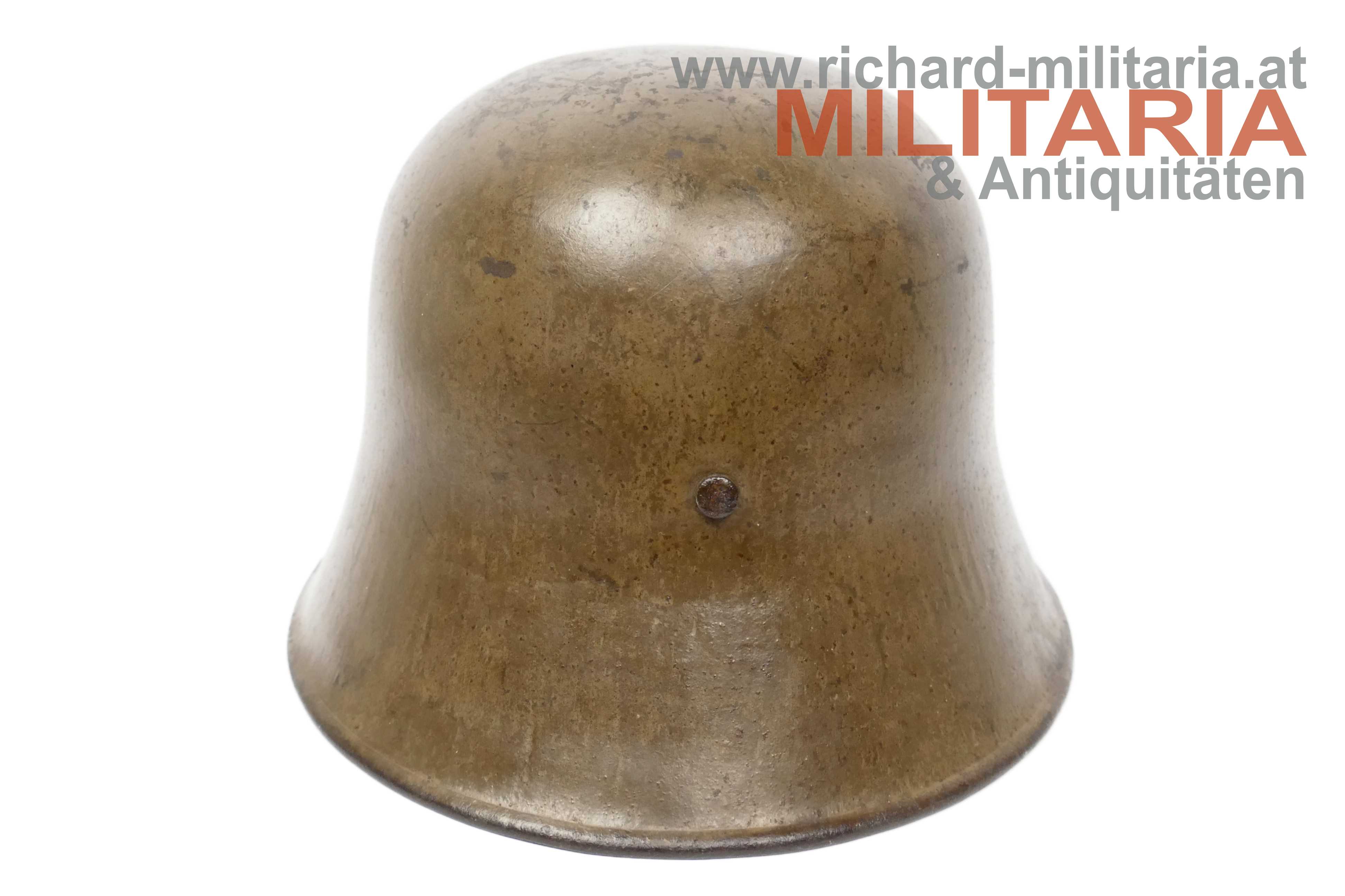 k.u.k. Stahlhelm M17 - "P 47"; Helmglocke mit viel originaler "isonzobrauner" Lackierung; oben auf der Helmglocke mit "P 47" markiert; rechts auf der Innenseite neben der Einhängelasche die Stempelung "BGB 66" (Brüder Gottlieb und Brauchbar Brunn und Helmgröße 66); Innenfutter fehlt; Helminnenring original vernietet; dahinter noch steife Reste des Innenfutters vorhanden; an der linken Kinnriemenhalterung noch ein steifes Stück des Riemens vorhanden;