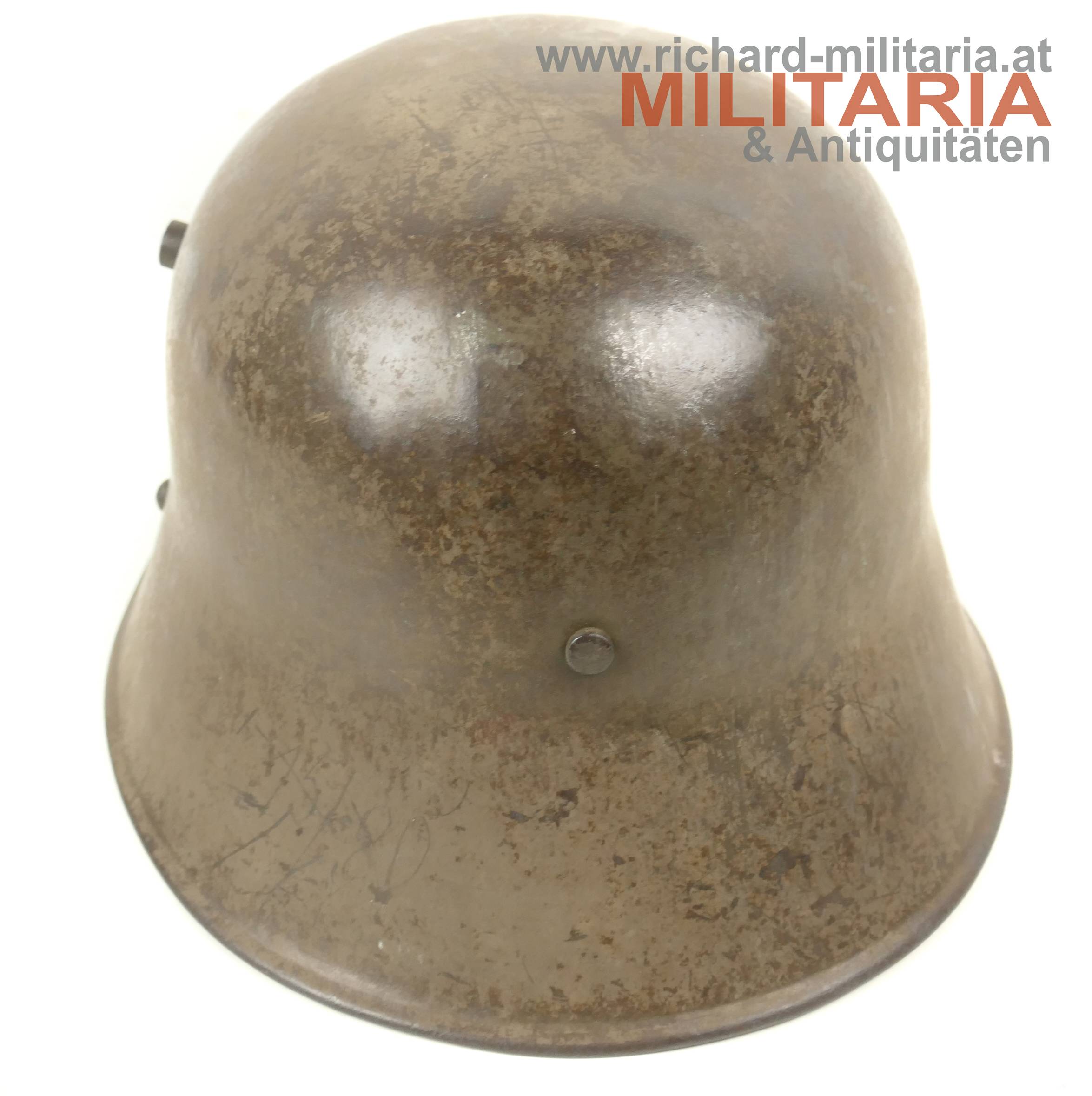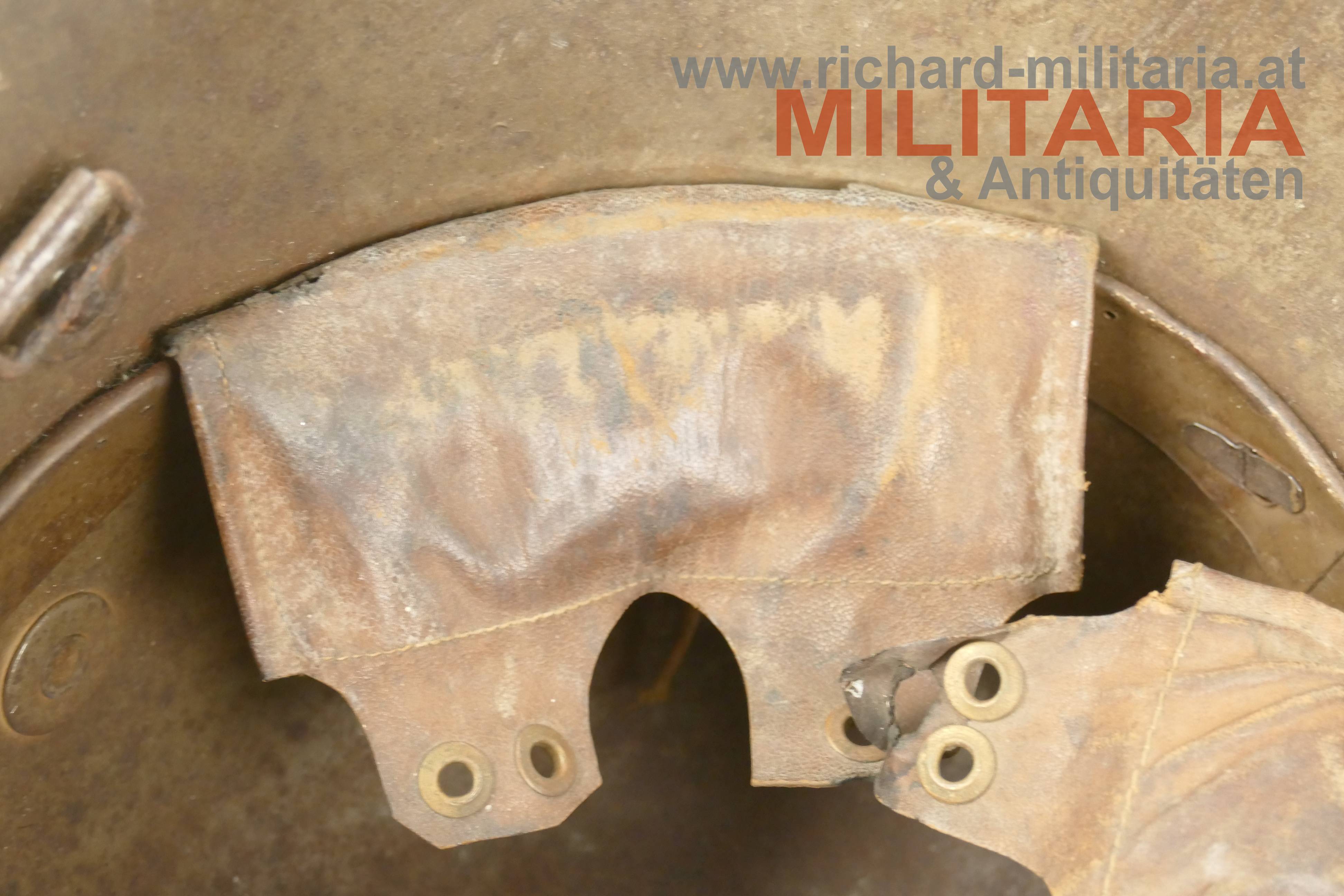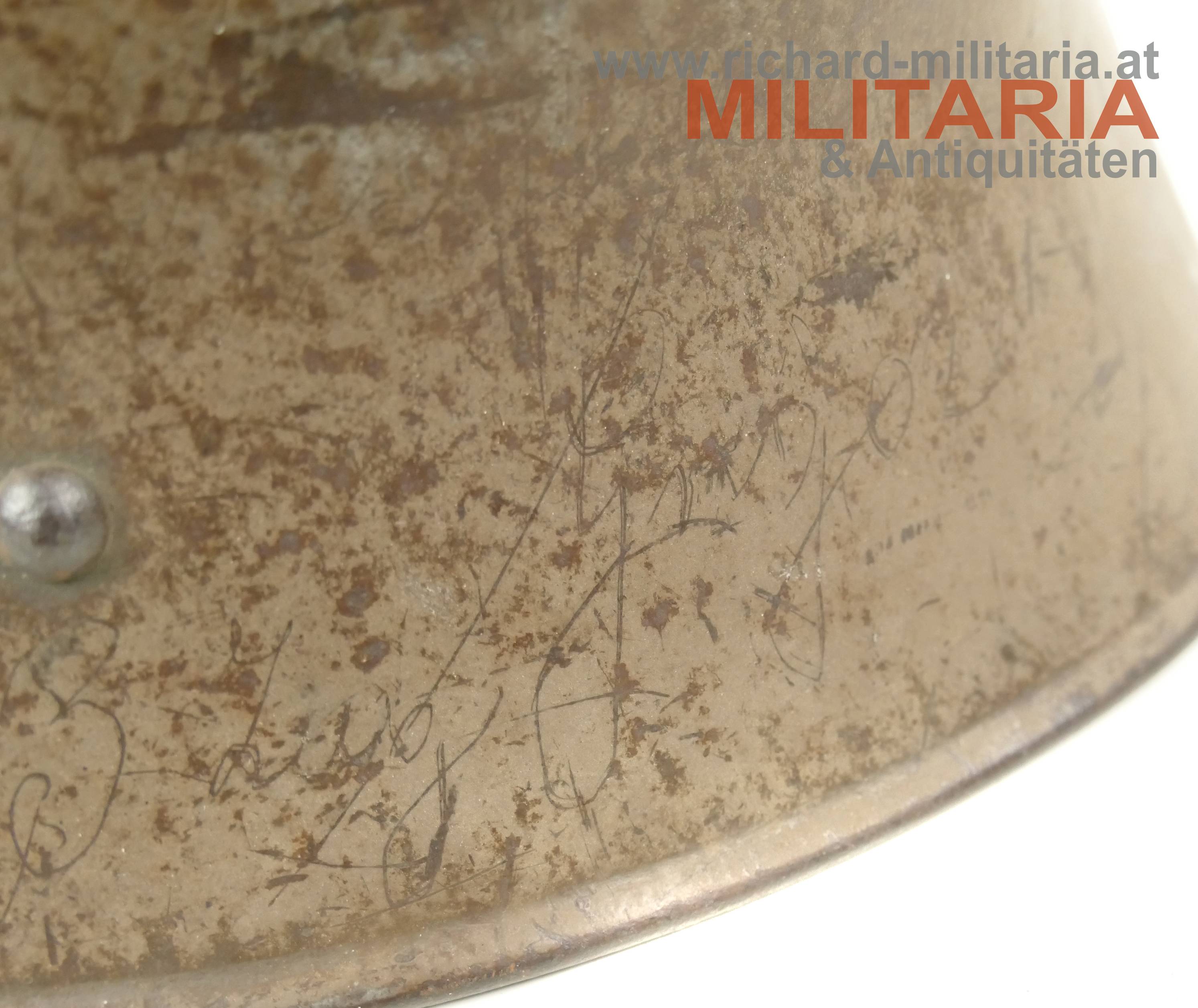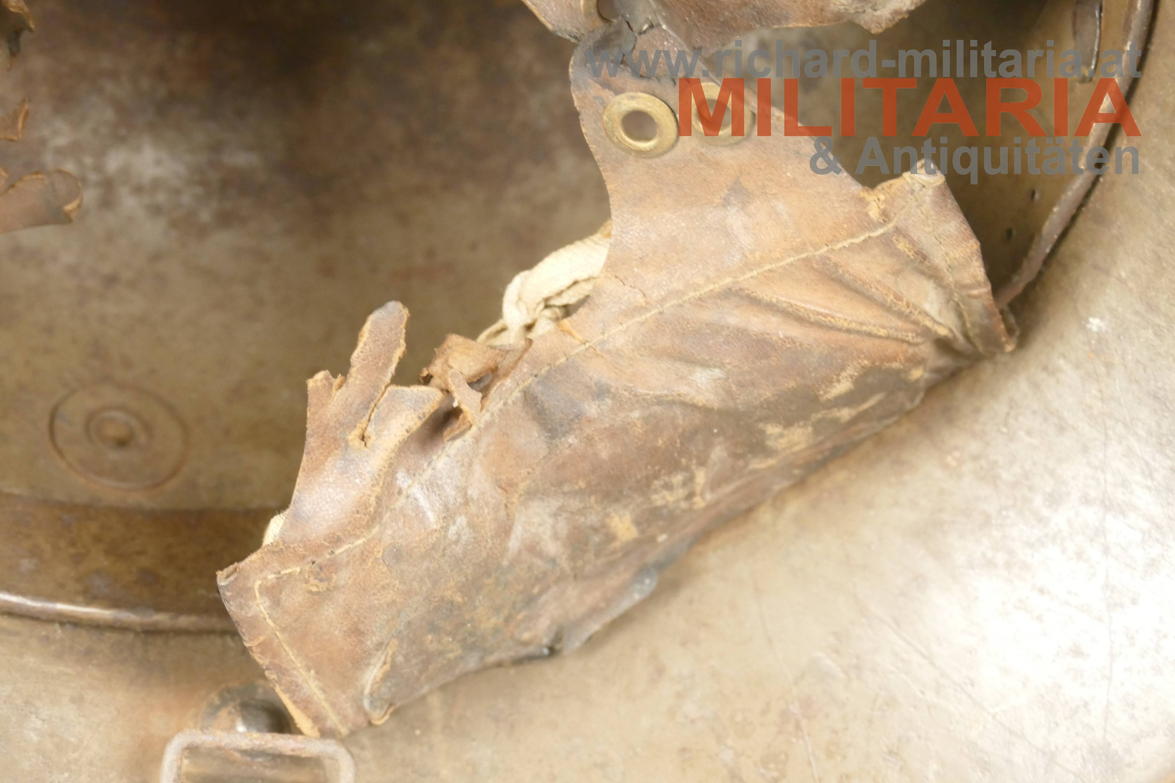 k.u.k. Stahlhelm Muster 1917 - österreichische Fertigung von Brüder Gottlieb u. Brauchbar, Brünn; Helmglocke mit originaler olivbrauner Lackierung (ca. 90% erhalten) - mit typischen Alterungsspuren; außen auf der linken Seite ein schlecht lesbarer Name mit Daten eingeritzt; Hersteller- u. Größenstempel auf der rechten Innenseite: "B.G.B 66"; originaler ungeöffneter Innenhelmring mit den 3 originalen Lederlappen mit Roßhaarfüllung; ein Lederteil teilweise am Innenhelmring eingerissen und partiell leicht beschädigt; Leder trocken; ohne Kinnriemen