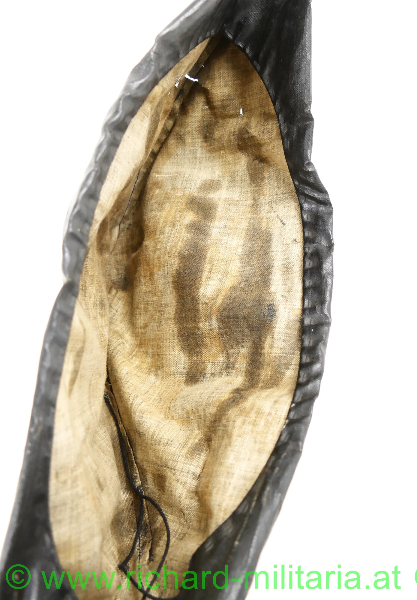 Regenüberzug für einen k.u.k. Stulphut, mit schwarzer Imprägnierung überzogenes Leinen, innen mit Zugband, guter Zustand mit kleinen Fehlstellen.