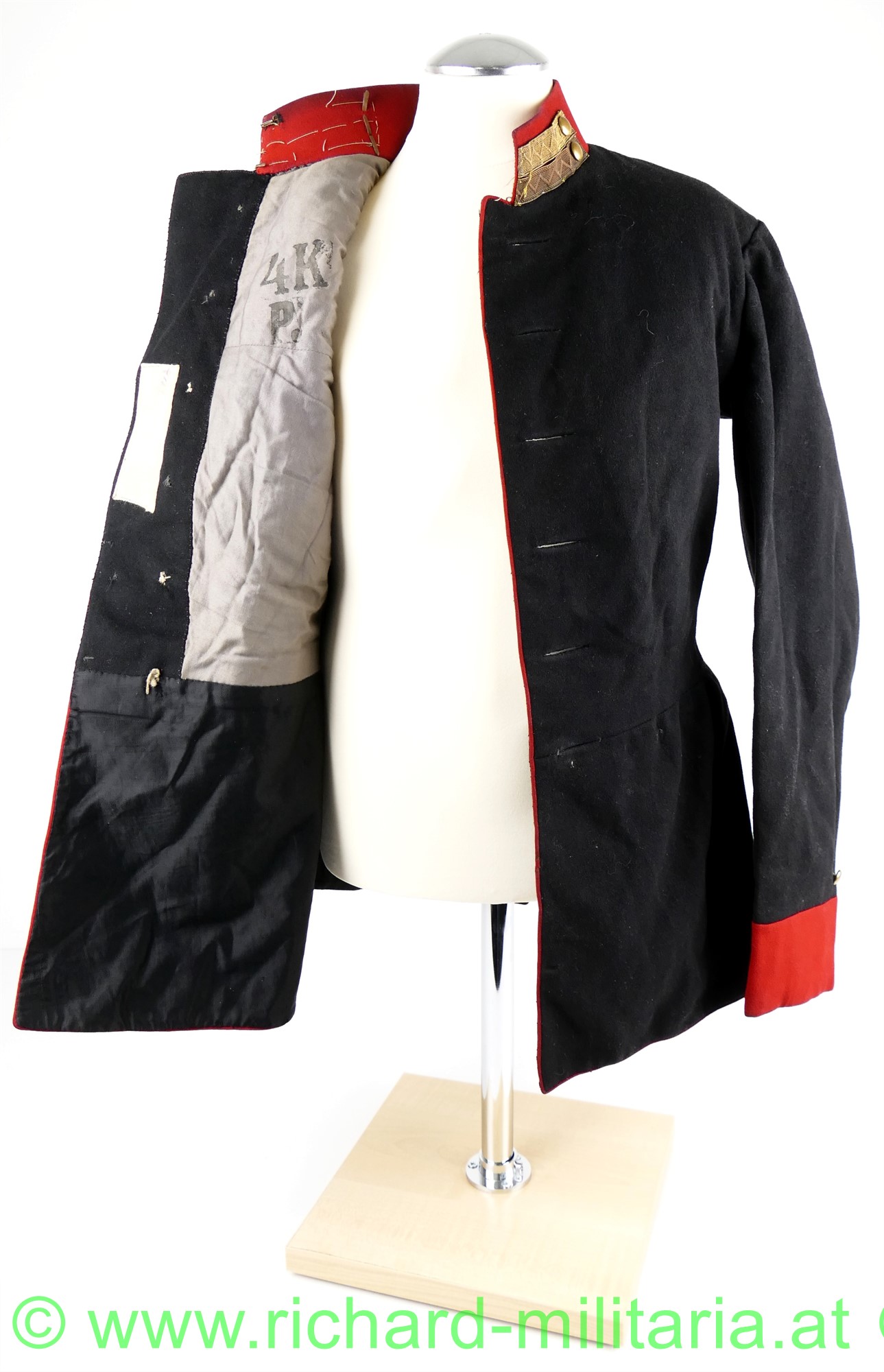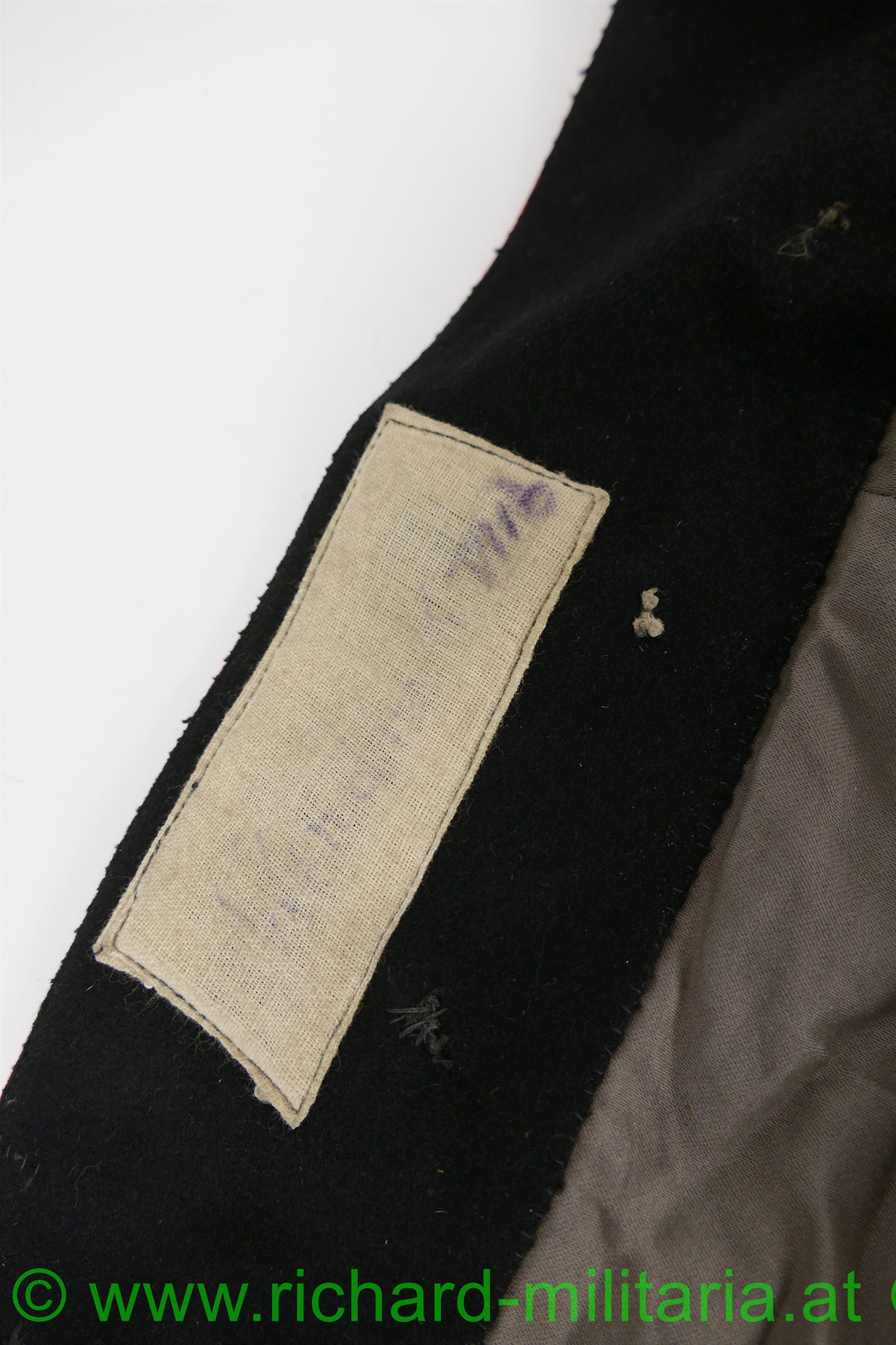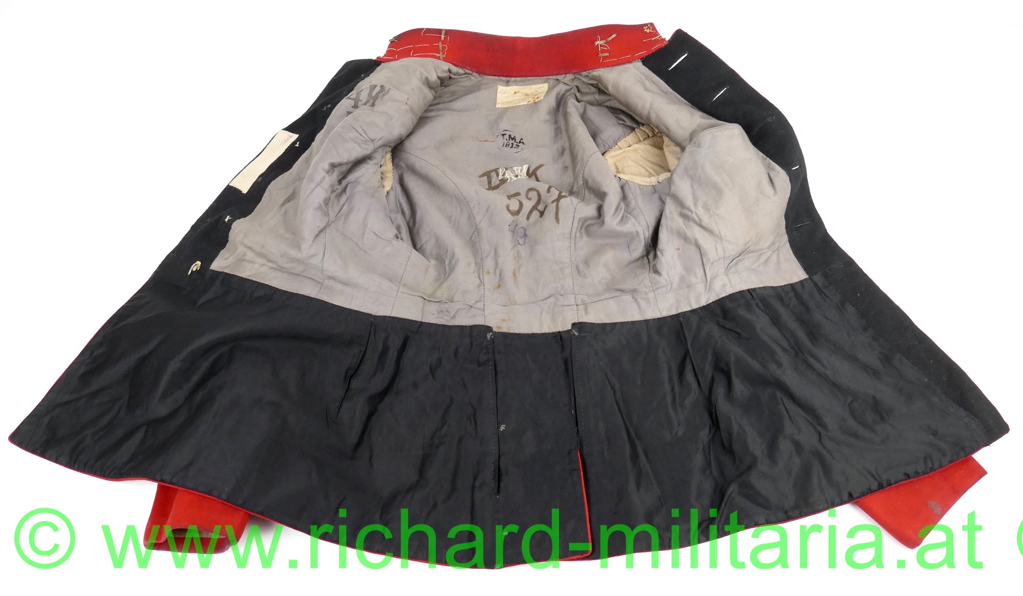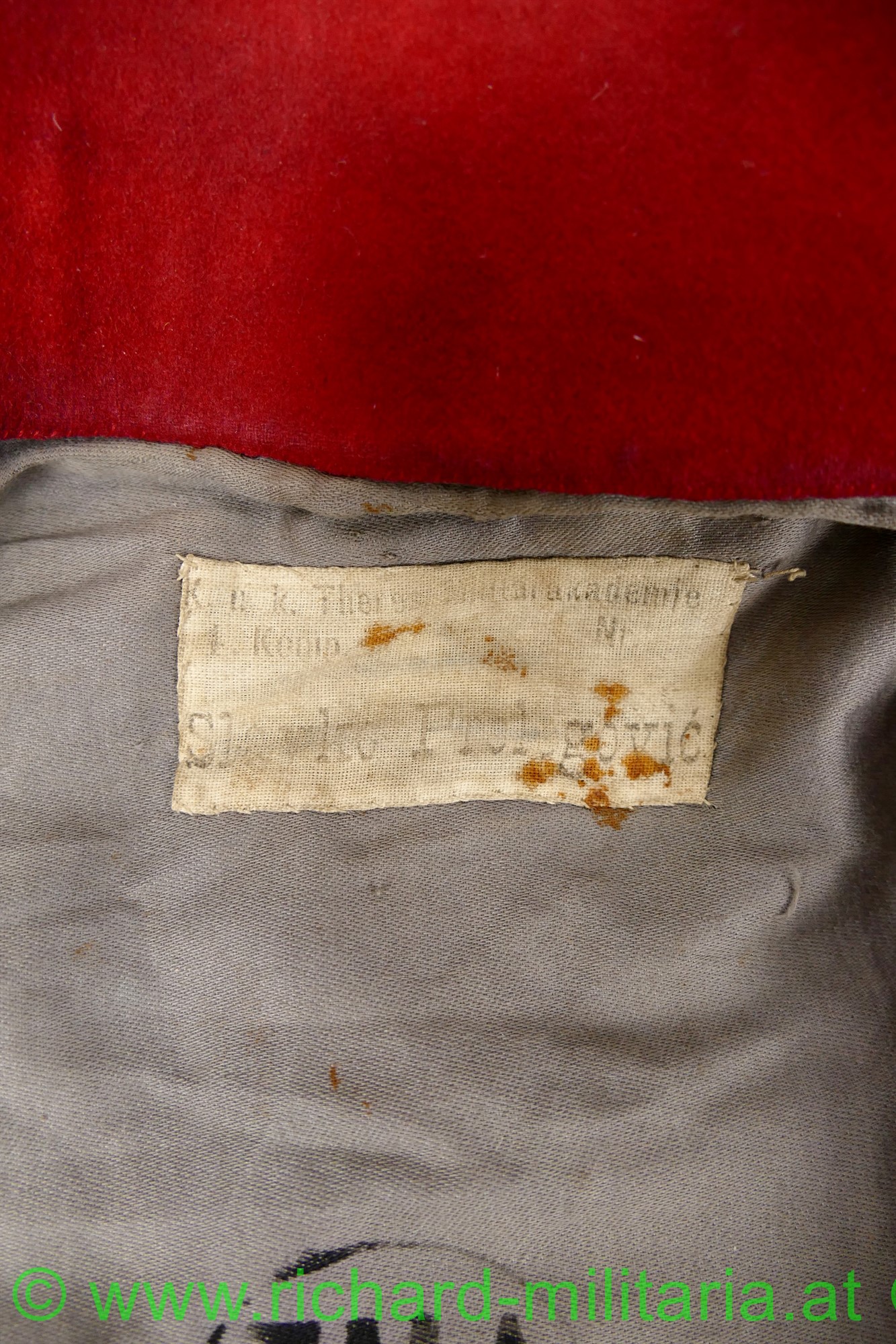 Rock für einen Zögling der k.u.k. Theresianischen Militärakademie in Wiener Neustadt, gefertigt nach der Adjustierungsvorschrift von 1910/11 aus mohrengrauen (schwarzen) Wollstoff; Kragen und Ärmelaufschläge aus scharlachrotem Tuch, sowie scharlachrote Vorstösse an den Rockkanten; am Kragen verlaufen je zwei Goldborten, die von zwei goldgelben Knöpfen gehalten werden, diese signalisieren ausgezeichneten Fortgang; 6fache Knopfleiste mit goldgelben Knöpfen besetzt, je ein goldgelber Knopf an den Ärmeln und je zwei am Stehkragen; Innenfutter im Oberkörperbereich aus grauer Baumwolle, diese mit diversen Kammerstempeln "T.M.A. 1912", "4 K 527" und darunter ein Trägeretikett des Zöglings "Slavko Prelegovic", Innentasche an der linken Brust, Tragespuren an den Achseln im Innenfutter, der untere Teil des Innenfutters besteht aus schwarzer Seide, leichte Gebrauchsspuren vor allem an den Goldborten, keinerlei Mottenlöcher im Wollstoff
