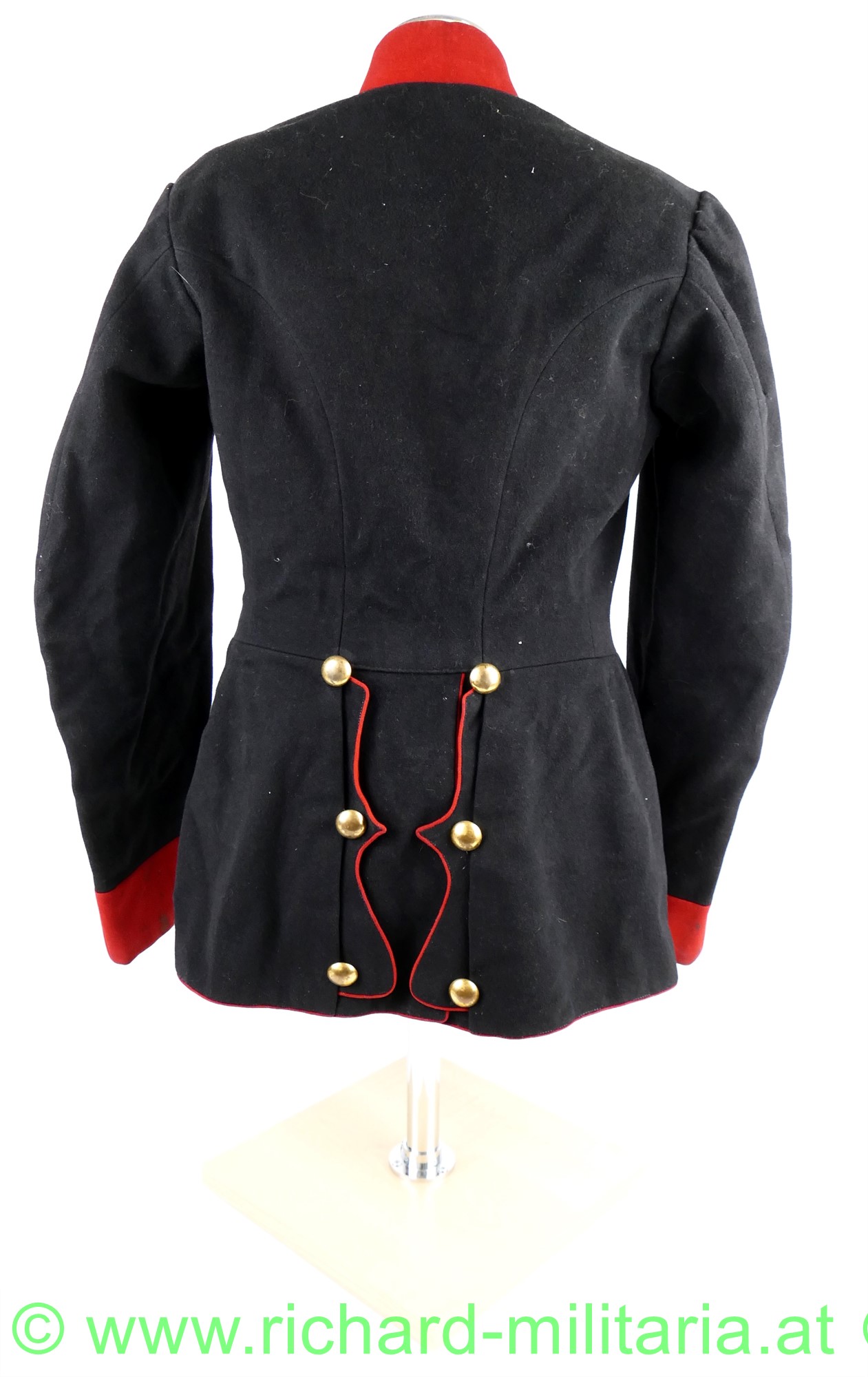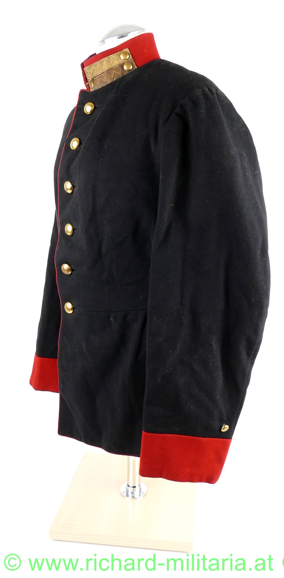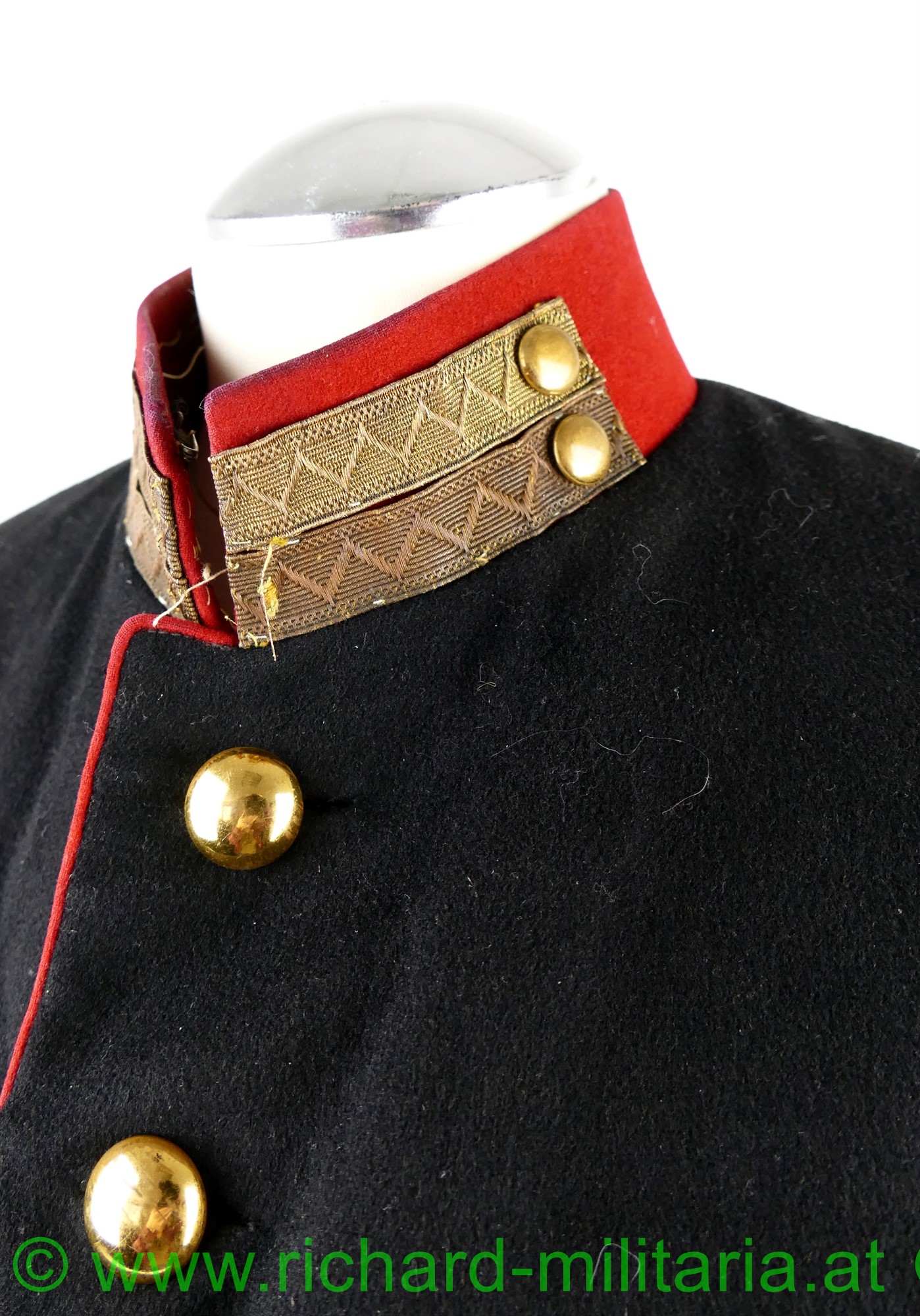 Rock für einen Zögling der k.u.k. Theresianischen Militärakademie in Wiener Neustadt, gefertigt nach der Adjustierungsvorschrift von 1910/11 aus mohrengrauen (schwarzen) Wollstoff; Kragen und Ärmelaufschläge aus scharlachrotem Tuch, sowie scharlachrote Vorstösse an den Rockkanten; am Kragen verlaufen je zwei Goldborten, die von zwei goldgelben Knöpfen gehalten werden, diese signalisieren ausgezeichneten Fortgang; 6fache Knopfleiste mit goldgelben Knöpfen besetzt, je ein goldgelber Knopf an den Ärmeln und je zwei am Stehkragen; Innenfutter im Oberkörperbereich aus grauer Baumwolle, diese mit diversen Kammerstempeln "T.M.A. 1912", "4 K 527" und darunter ein Trägeretikett des Zöglings "Slavko Prelegovic", Innentasche an der linken Brust, Tragespuren an den Achseln im Innenfutter, der untere Teil des Innenfutters besteht aus schwarzer Seide, leichte Gebrauchsspuren vor allem an den Goldborten, keinerlei Mottenlöcher im Wollstoff