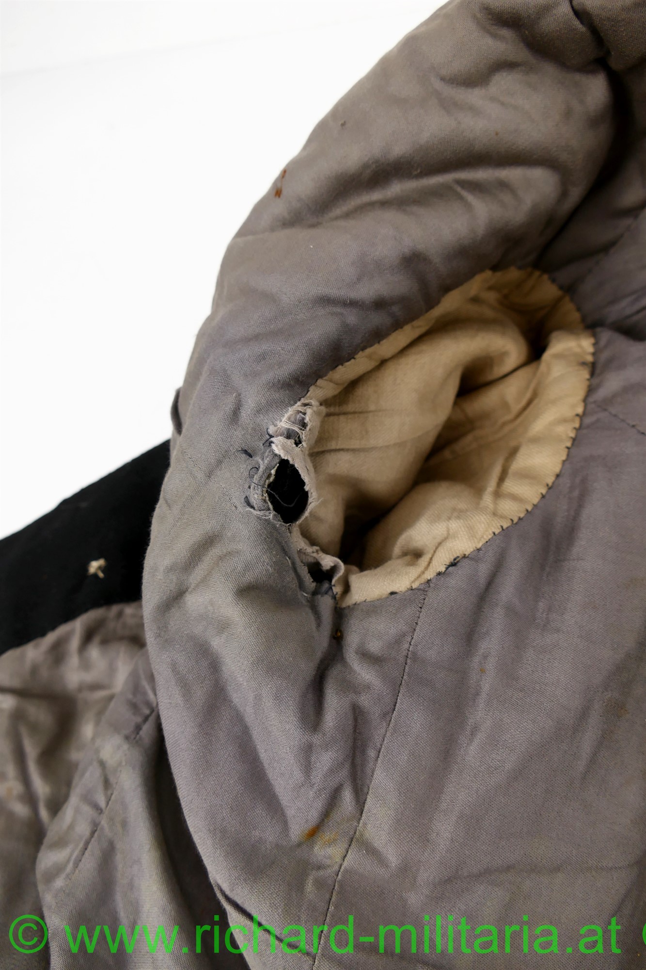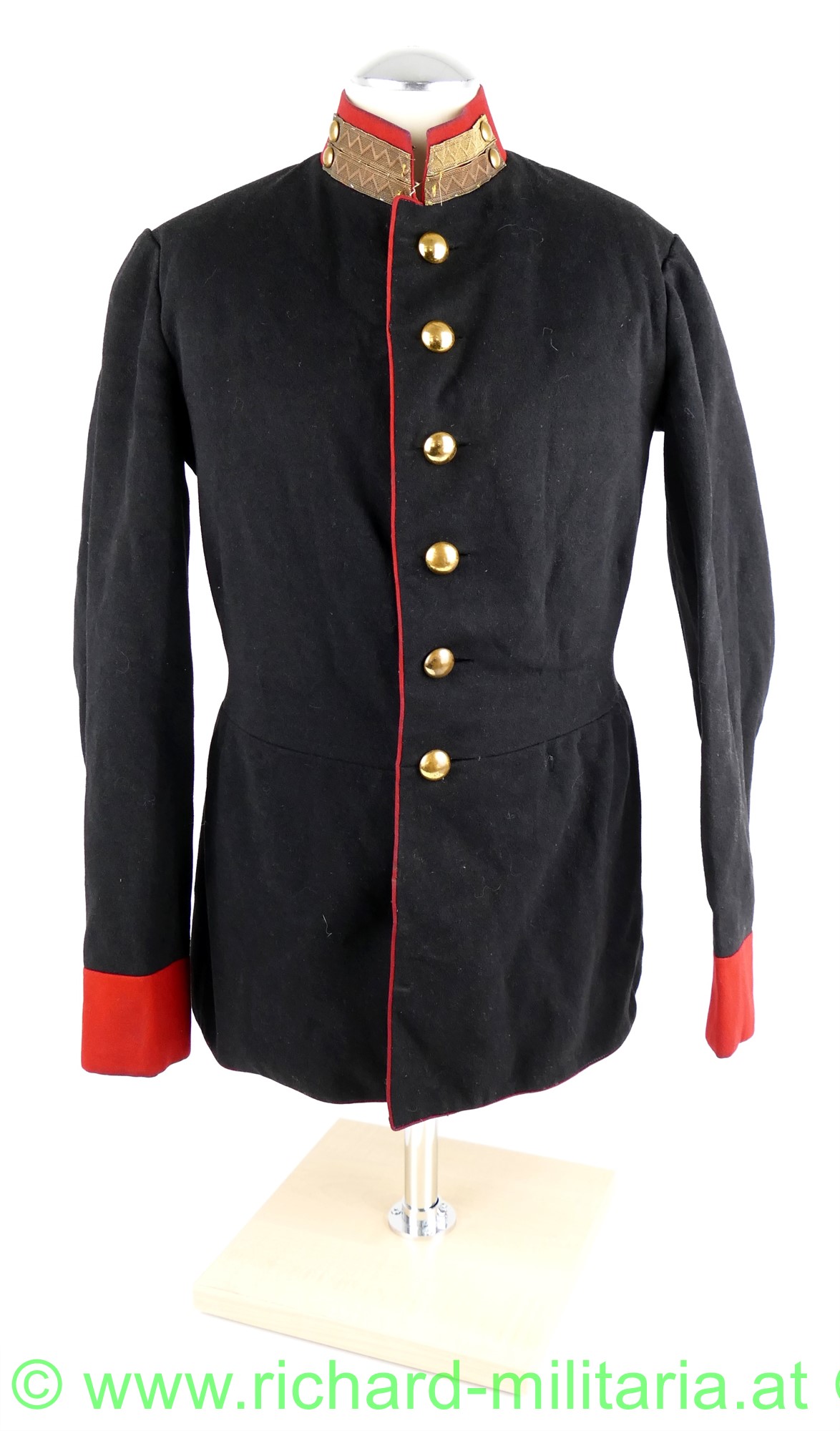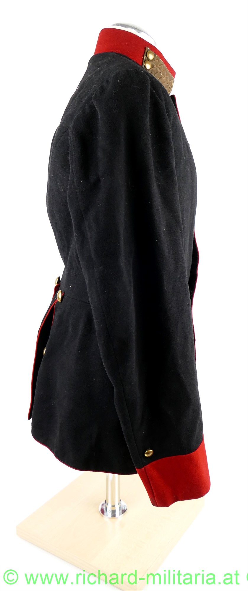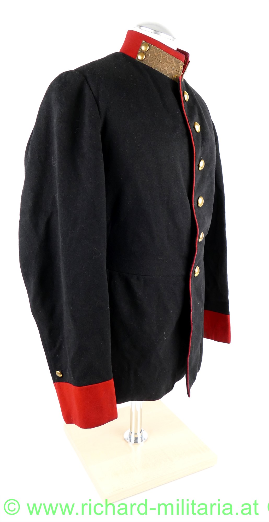 Rock für einen Zögling der k.u.k. Theresianischen Militärakademie in Wiener Neustadt, gefertigt nach der Adjustierungsvorschrift von 1910/11 aus mohrengrauen (schwarzen) Wollstoff; Kragen und Ärmelaufschläge aus scharlachrotem Tuch, sowie scharlachrote Vorstösse an den Rockkanten; am Kragen verlaufen je zwei Goldborten, die von zwei goldgelben Knöpfen gehalten werden, diese signalisieren ausgezeichneten Fortgang; 6fache Knopfleiste mit goldgelben Knöpfen besetzt, je ein goldgelber Knopf an den Ärmeln und je zwei am Stehkragen; Innenfutter im Oberkörperbereich aus grauer Baumwolle, diese mit diversen Kammerstempeln "T.M.A. 1912", "4 K 527" und darunter ein Trägeretikett des Zöglings "Slavko Prelegovic", Innentasche an der linken Brust, Tragespuren an den Achseln im Innenfutter, der untere Teil des Innenfutters besteht aus schwarzer Seide, leichte Gebrauchsspuren vor allem an den Goldborten, keinerlei Mottenlöcher im Wollstoff