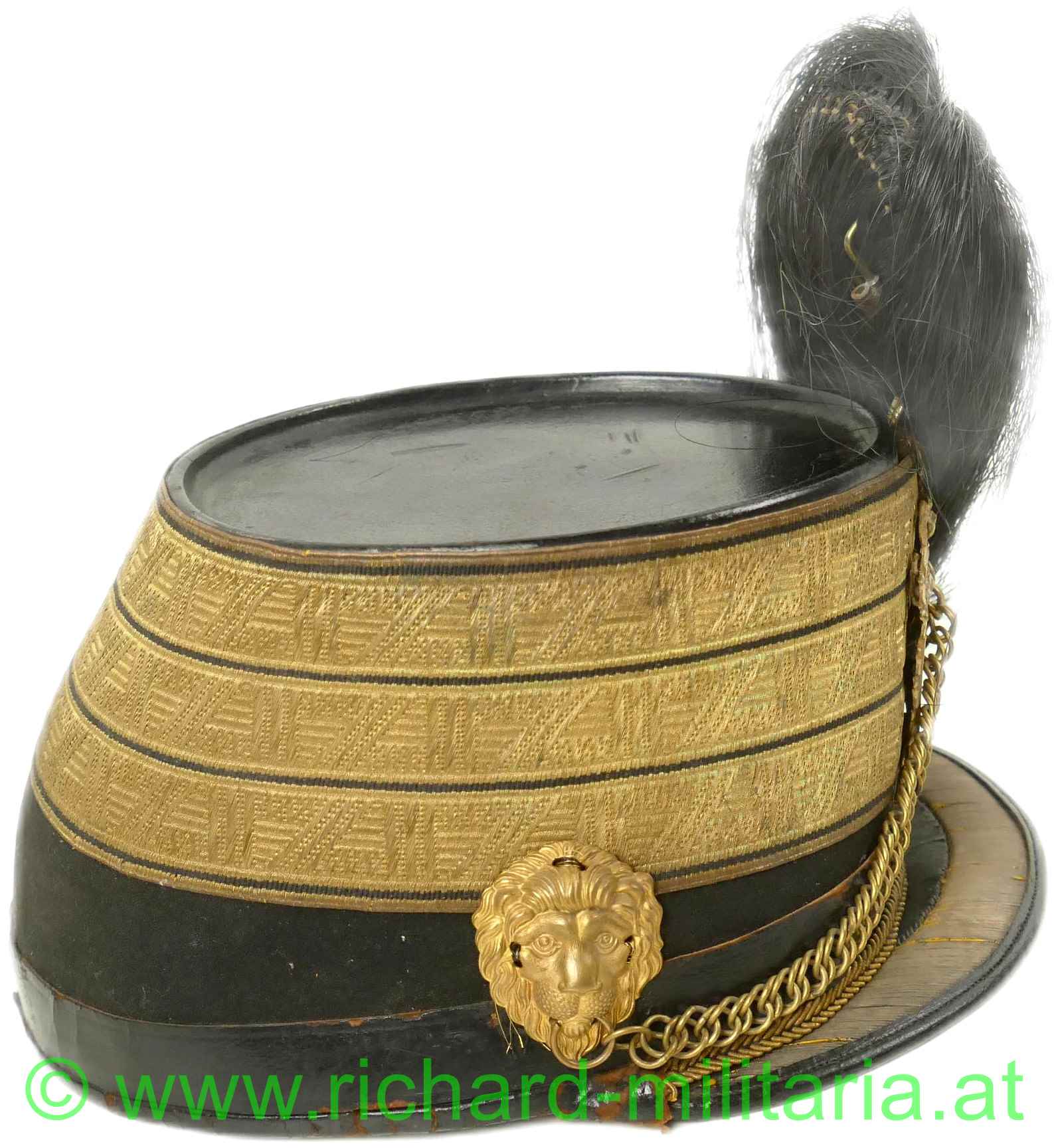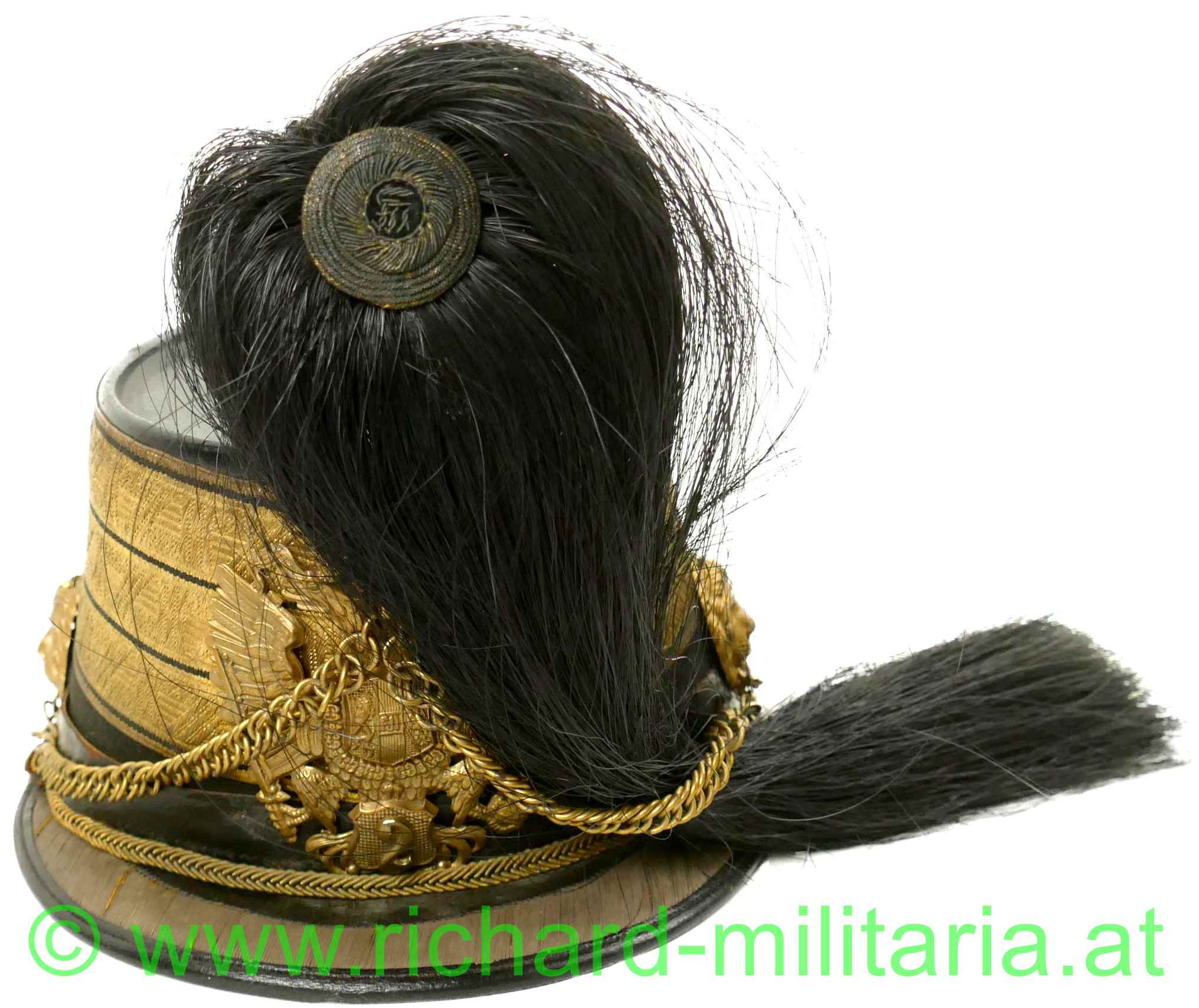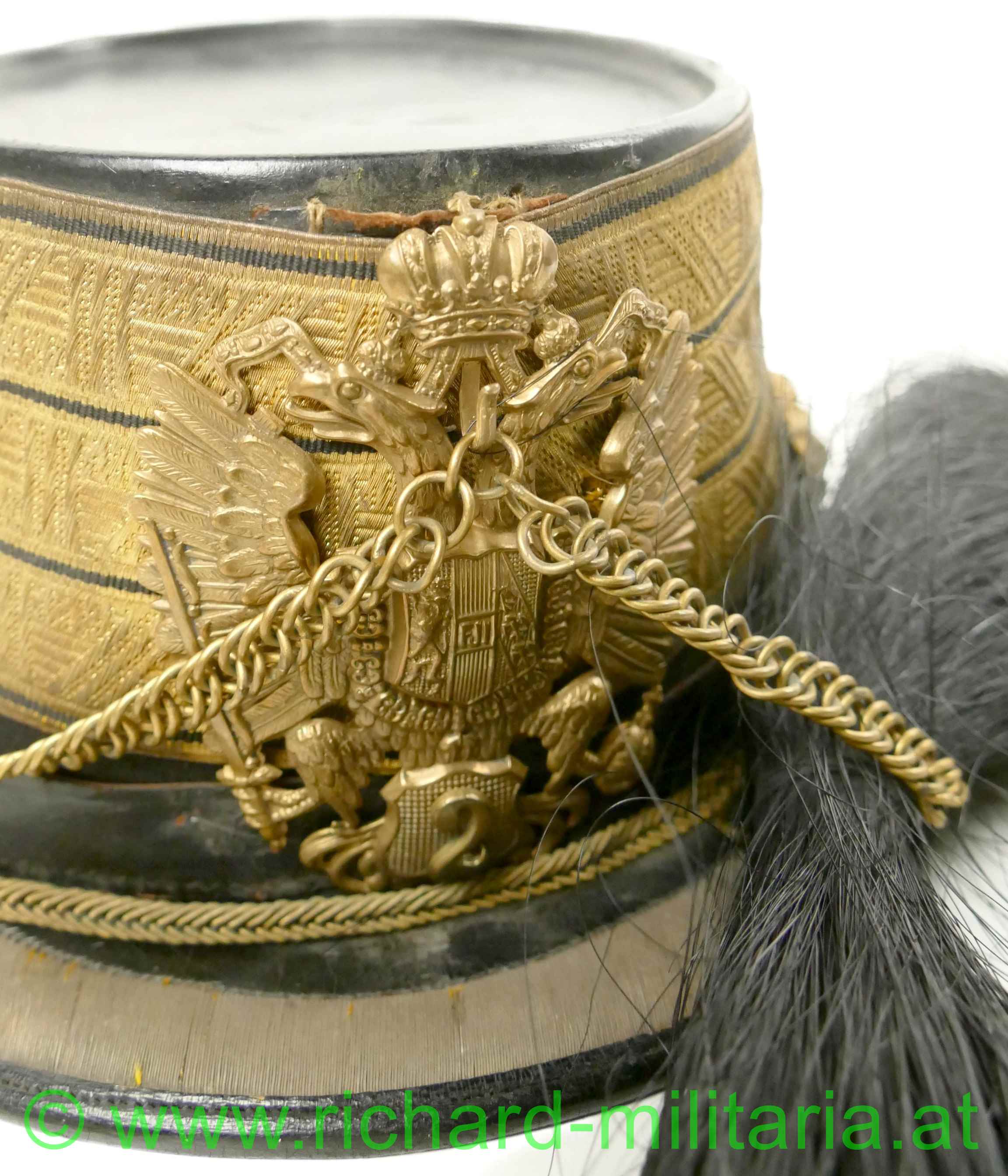 Tschako für Stabsoffiziere (Major, Oberstleutnant u. Oberst) der Artillerie in der k.u.k. Armee, mit schwarzem Filz überzogener Korpus, umlaufende Offiziersborte aus Goldgespinst für Stabsoffiziere, vergoldeter Doppeladler mit Regimentsnummer 2 und gestickter Rosette Kaiser Franz Josef mit Rosshaarbusch, links und rechts je ein vergoldeter Löwenkopf der im Maul die vergoldete Kette zum Doppeladler hält, Schirm mit Goldborte - Schirm hat sich teilweise vom Tschako gelöst, mittelbraunes Schweißleder, beiges Seidenfutter mit Hersteller: "E.H.Schwaab, Prag, k.u.k. Hoflieferant", Größenstempel: "57"; Kinnriemen fehlt; altersbedingte Beschädigungen;
