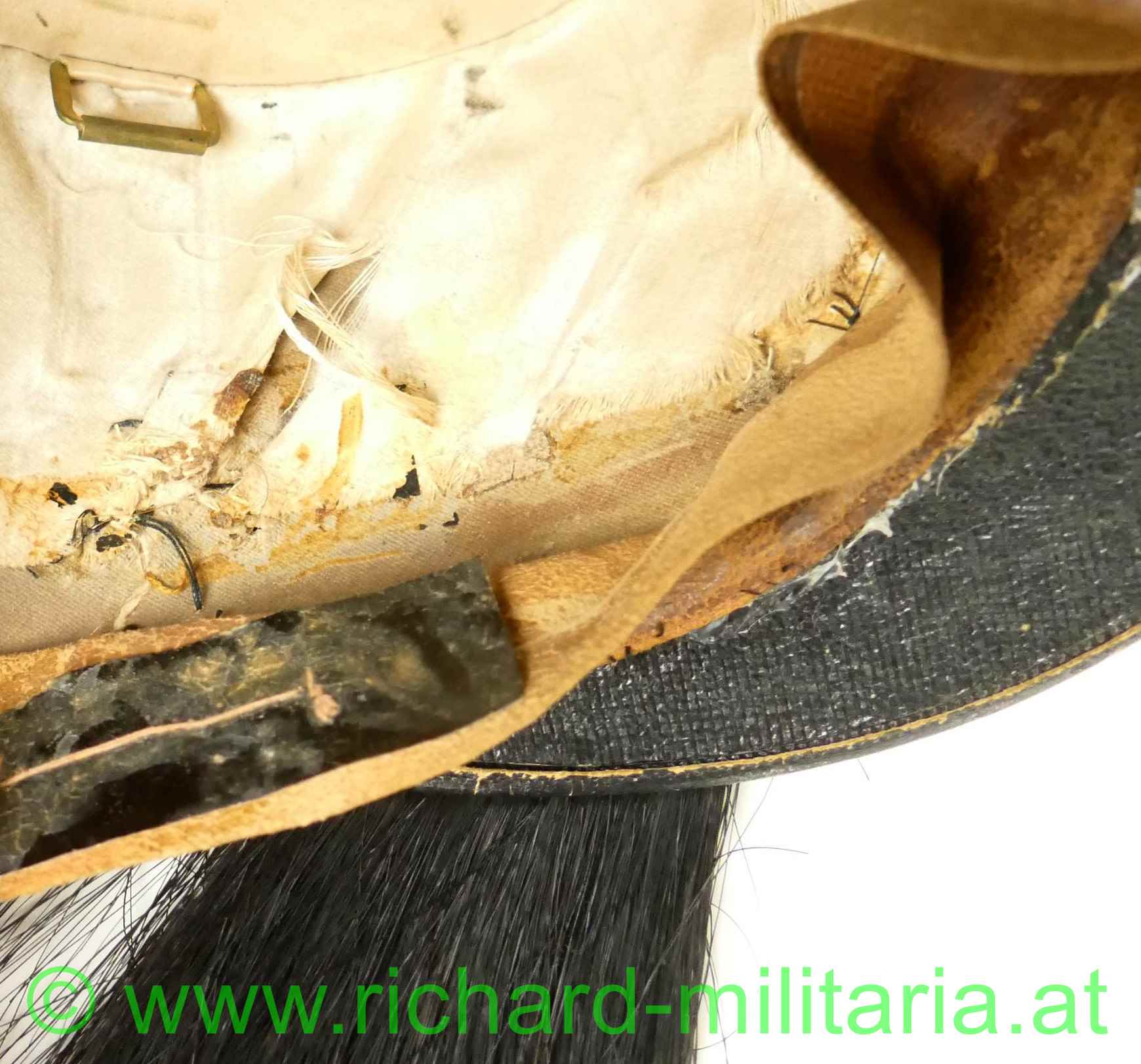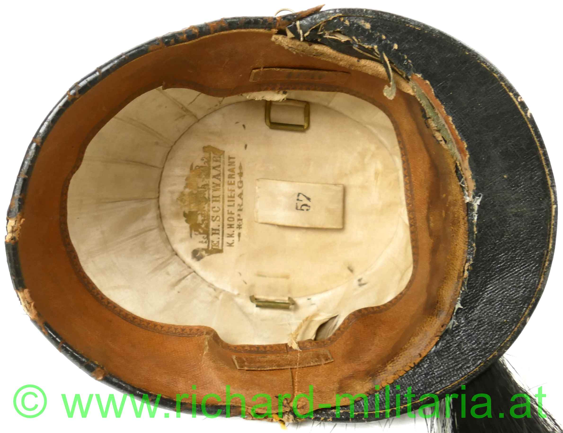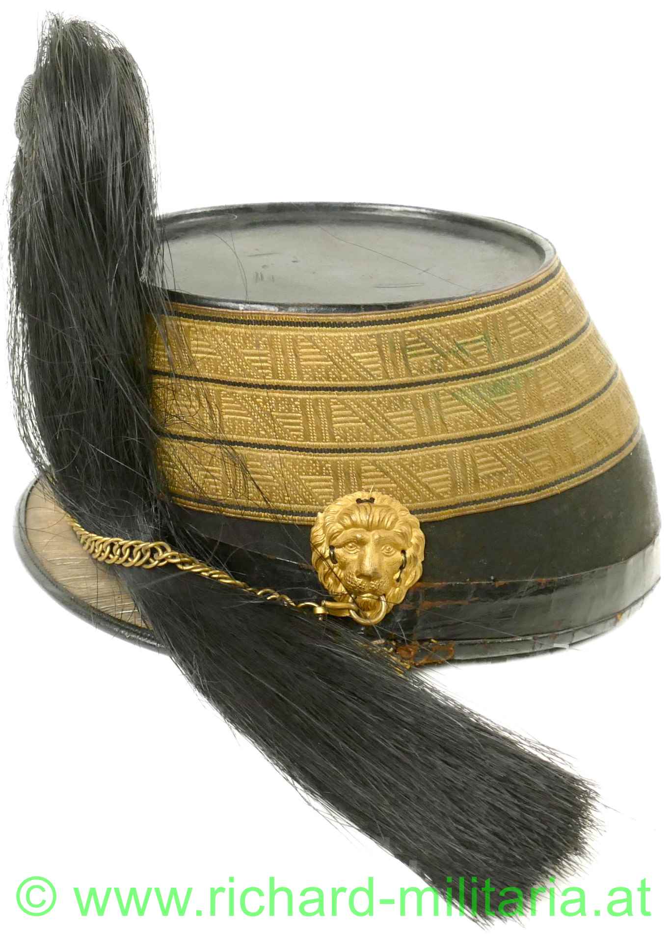 Tschako für Stabsoffiziere (Major, Oberstleutnant u. Oberst) der Artillerie in der k.u.k. Armee, mit schwarzem Filz überzogener Korpus, umlaufende Offiziersborte aus Goldgespinst für Stabsoffiziere, vergoldeter Doppeladler mit Regimentsnummer 2 und gestickter Rosette Kaiser Franz Josef mit Rosshaarbusch, links und rechts je ein vergoldeter Löwenkopf der im Maul die vergoldete Kette zum Doppeladler hält, Schirm mit Goldborte - Schirm hat sich teilweise vom Tschako gelöst, mittelbraunes Schweißleder, beiges Seidenfutter mit Hersteller: "E.H.Schwaab, Prag, k.u.k. Hoflieferant", Größenstempel: "57"; Kinnriemen fehlt; altersbedingte Beschädigungen;