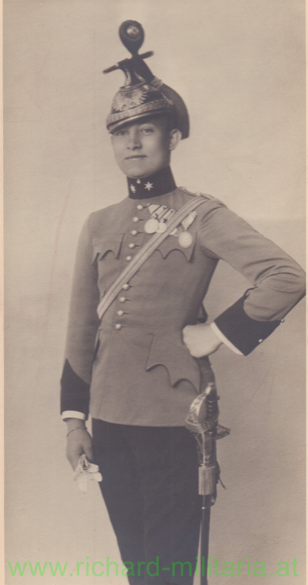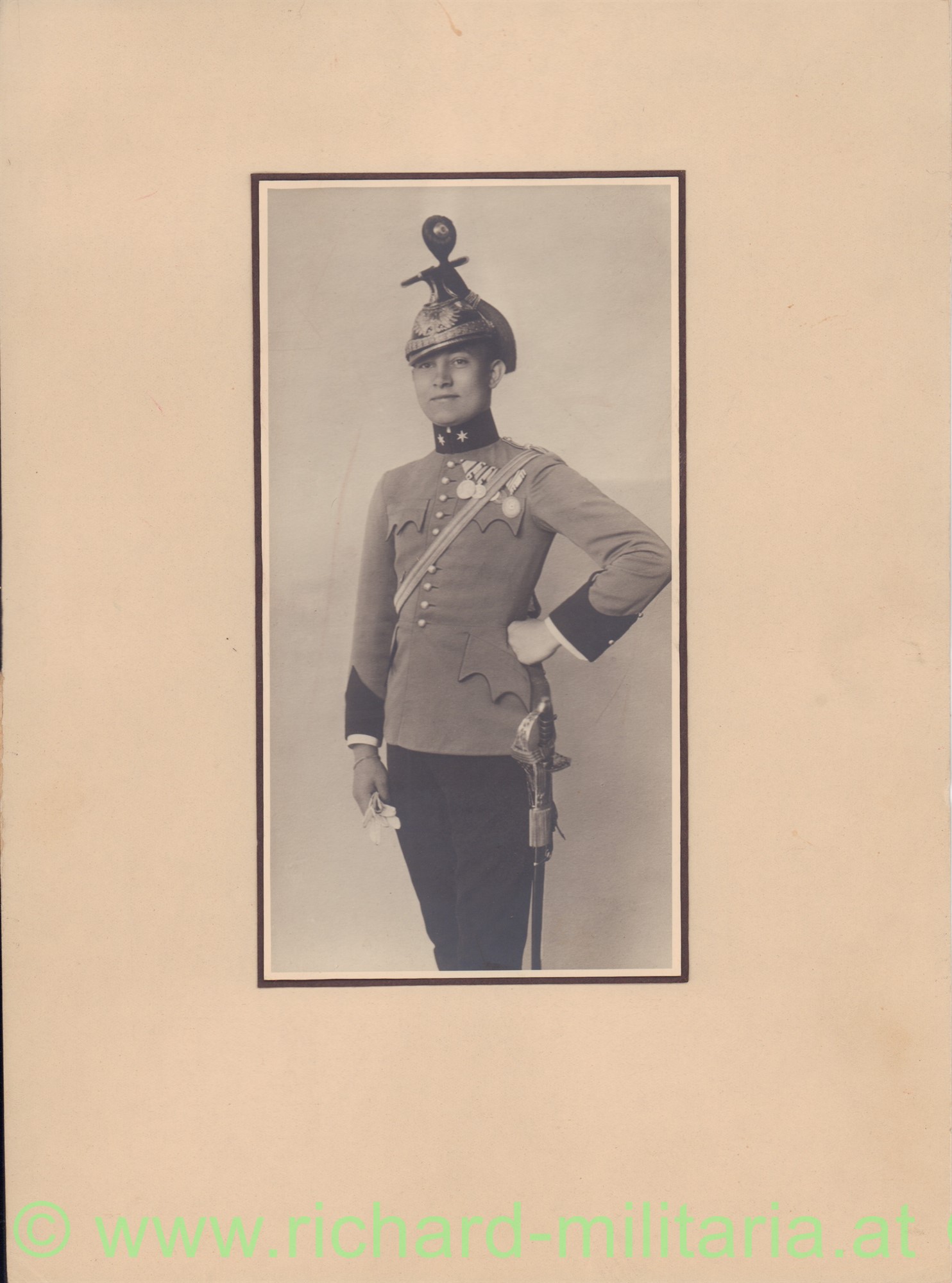 Portraitfoto eines Leutnants der k.u.k. Ulanen-Regimenter; die Regimentsnummer am Doppeladler nicht eindeutig erkennbar - eventuell 5; dekoriert mit 4 (!) Tapferkeitsmedaillen und der Ehrenmedaille vom Roten Kreuz mit KD; am Säbel ein Offiziersportepee Kaiser Karl; auf Kartonblatt aufgeklebt (Format des Kartonblattes 24 x 32,8 cm); sehr schönes Portraitfoto!