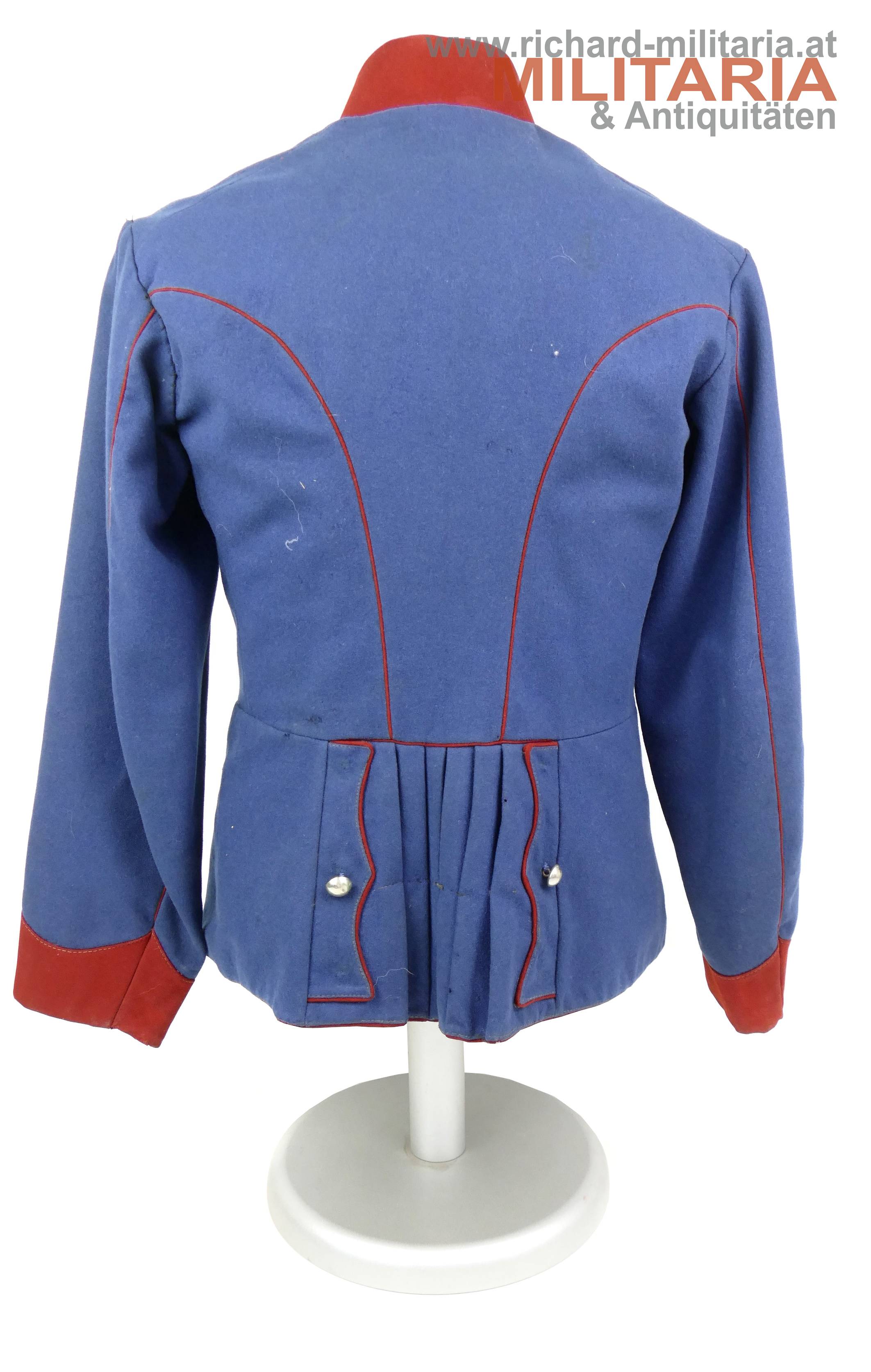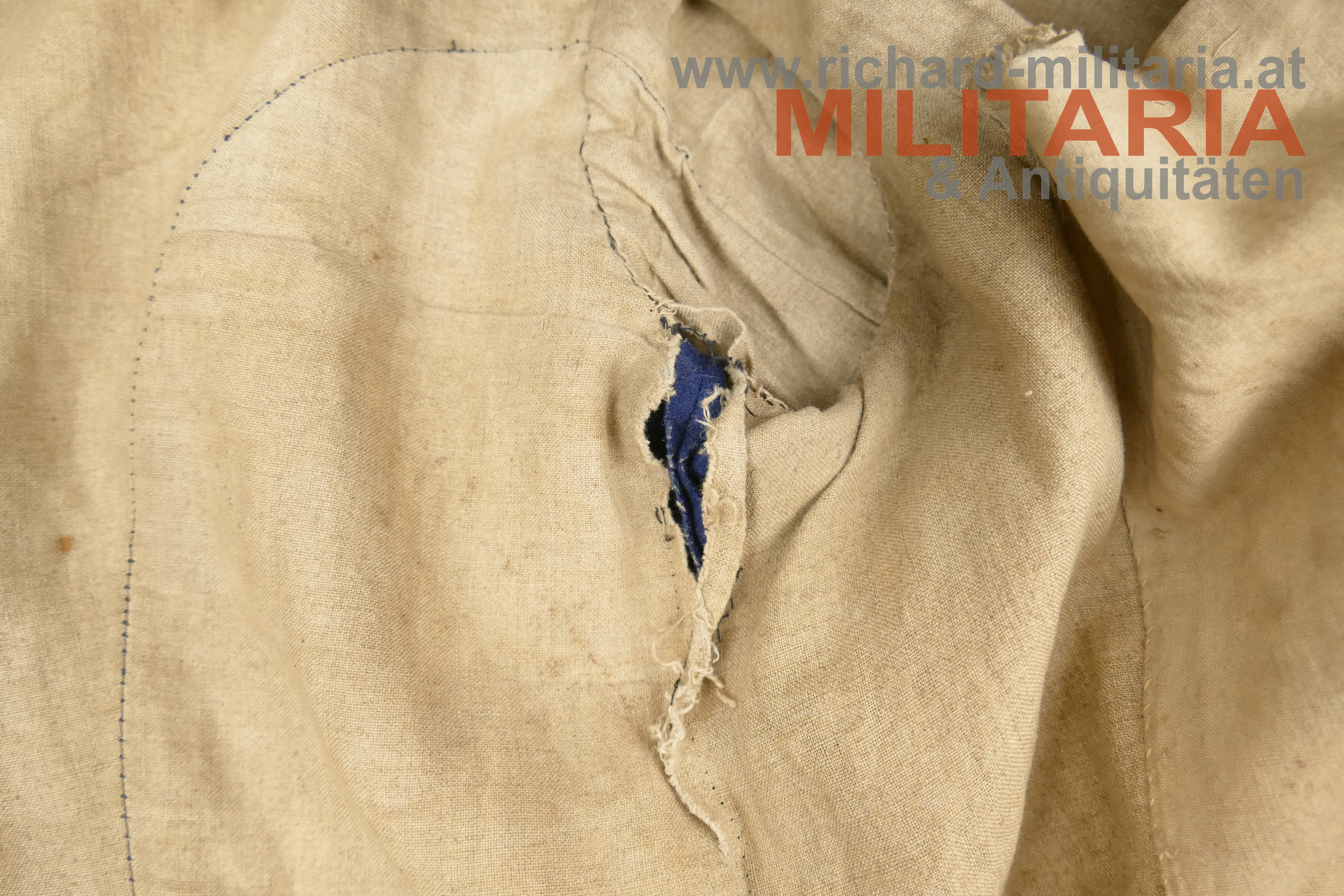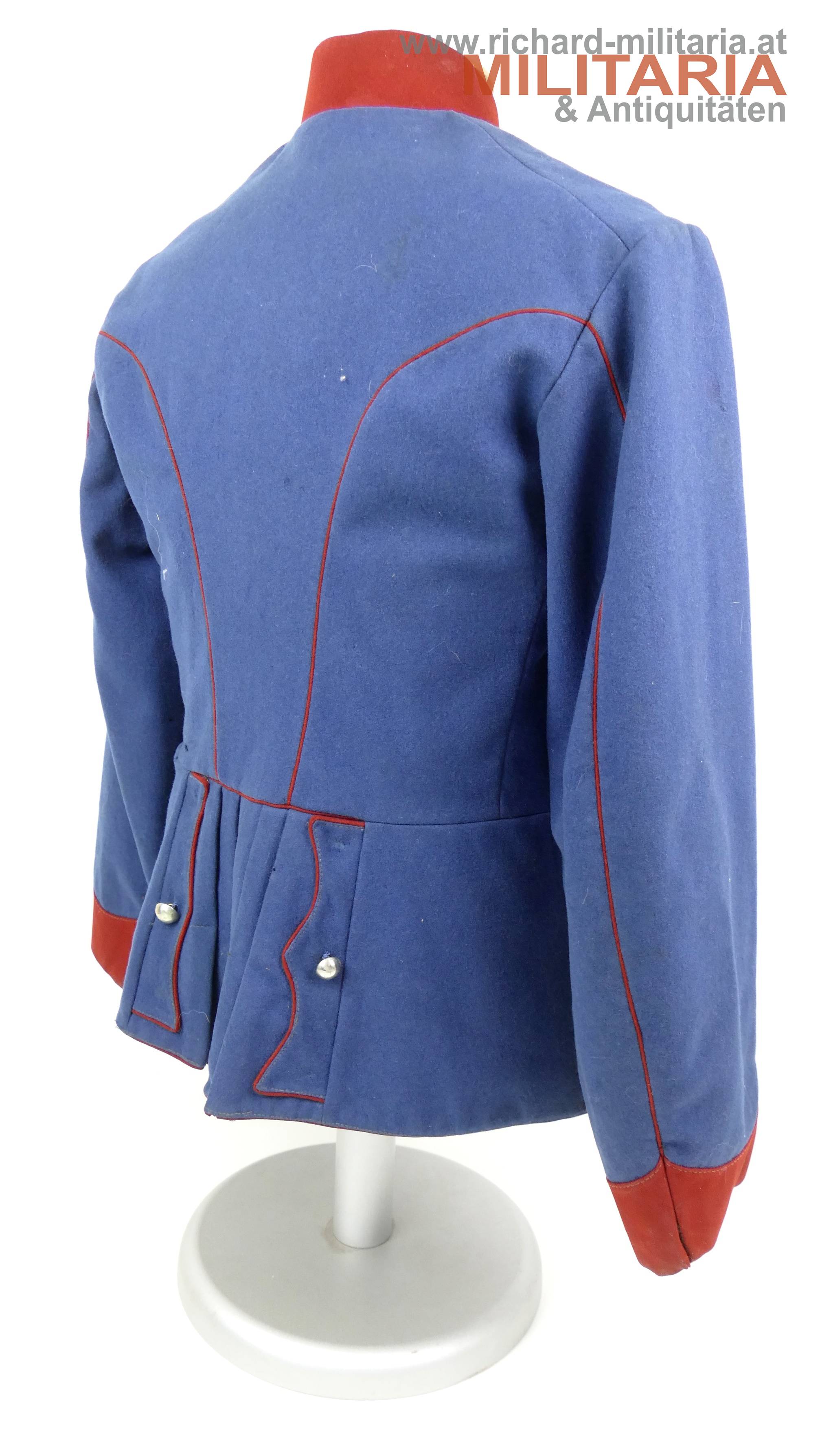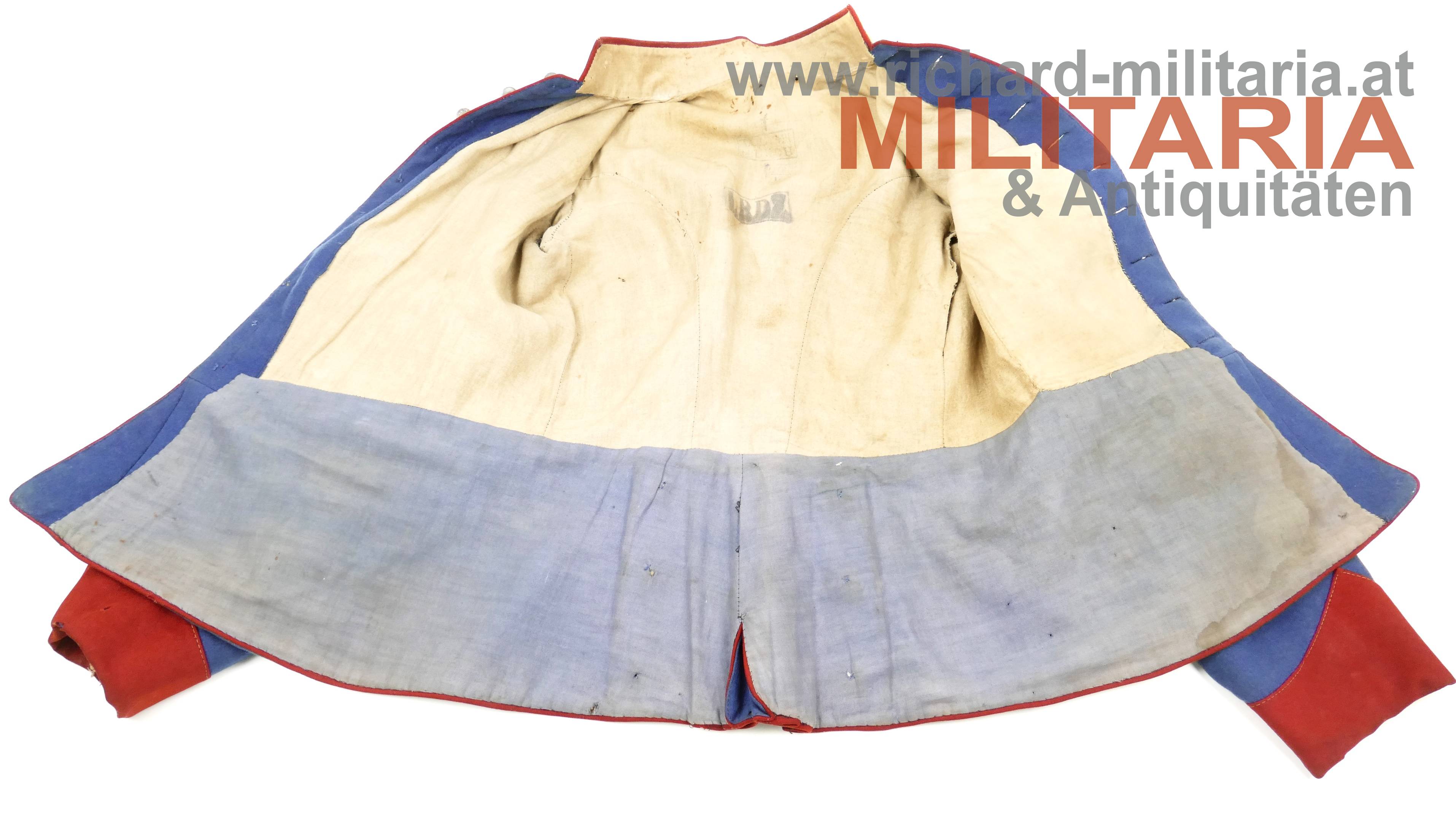 k.u.k. Ulanka für einen Korporal; grober lichtblauer Mannschaftswollstoff mit krapproten Vorstößen, Kragen und Ärmelaufschlägen; am roten Kragen je 2 Sterne aus Bein aufgenäht; innen im Kragen weißes Leinen eingenäht; einreihig zu 10 silbernen glatten Kompasseln - 1 Knopf fehlt; auf der linken Schulter fehlt die Achselschlinge (deutliche Sitzspuren und geöffnter Achselwulst); minimale Mottenlöcher; innen mit Futterleinen ausgelegt; darauf diverse Monturdepot- und Herstellerstempelungen und handschriftliche Namensvermerke im Futter; händisch eingenähte Brusttasche innen;