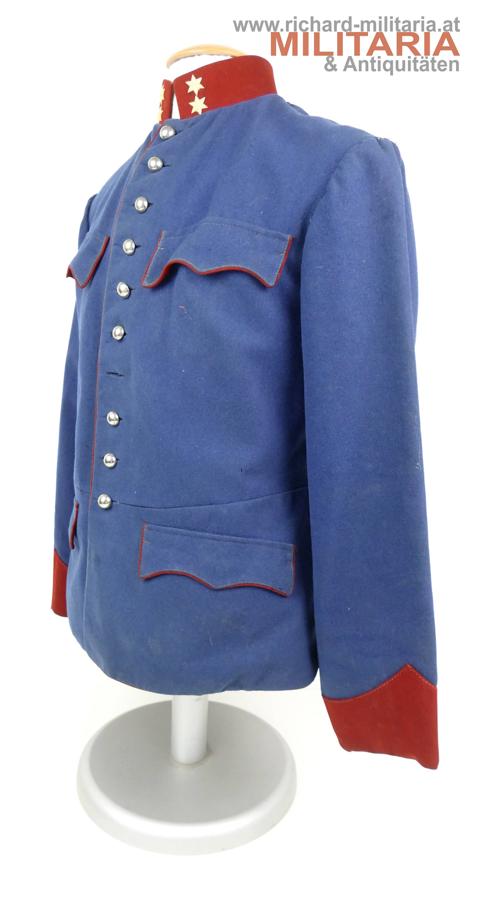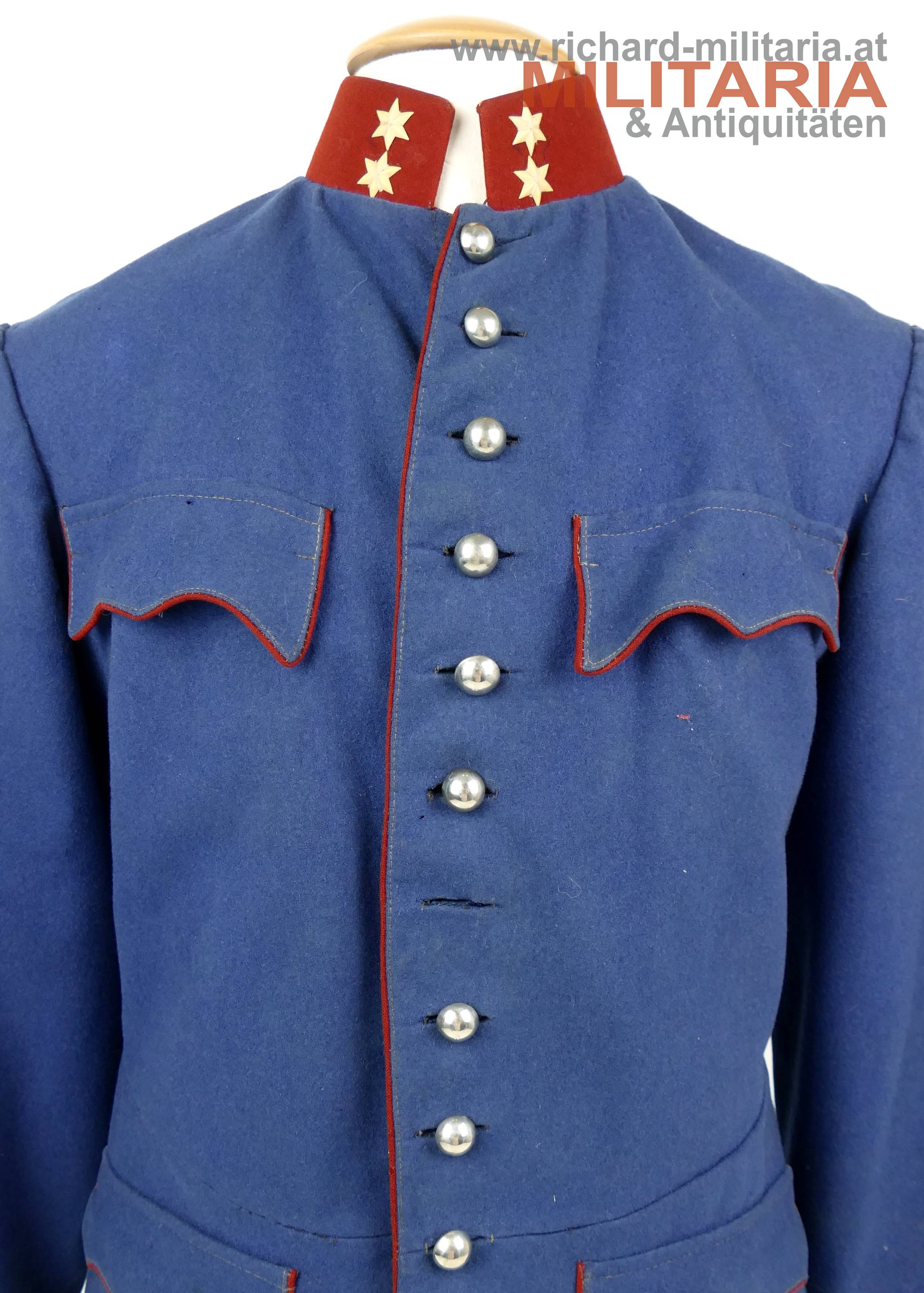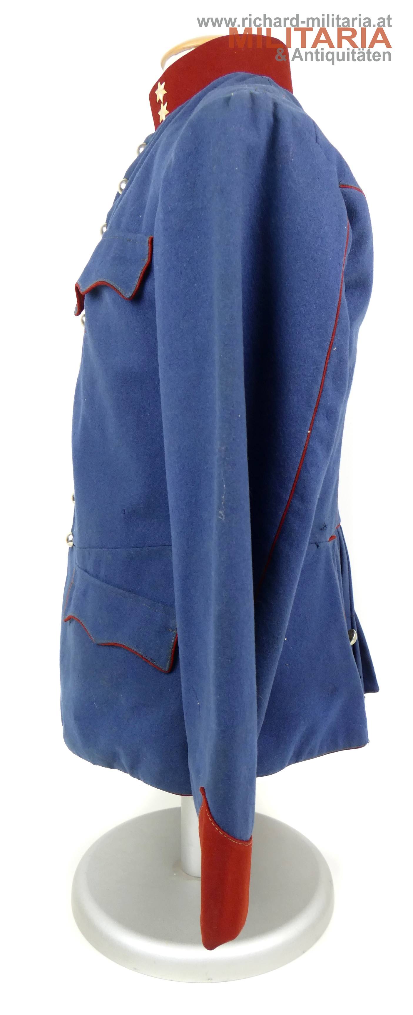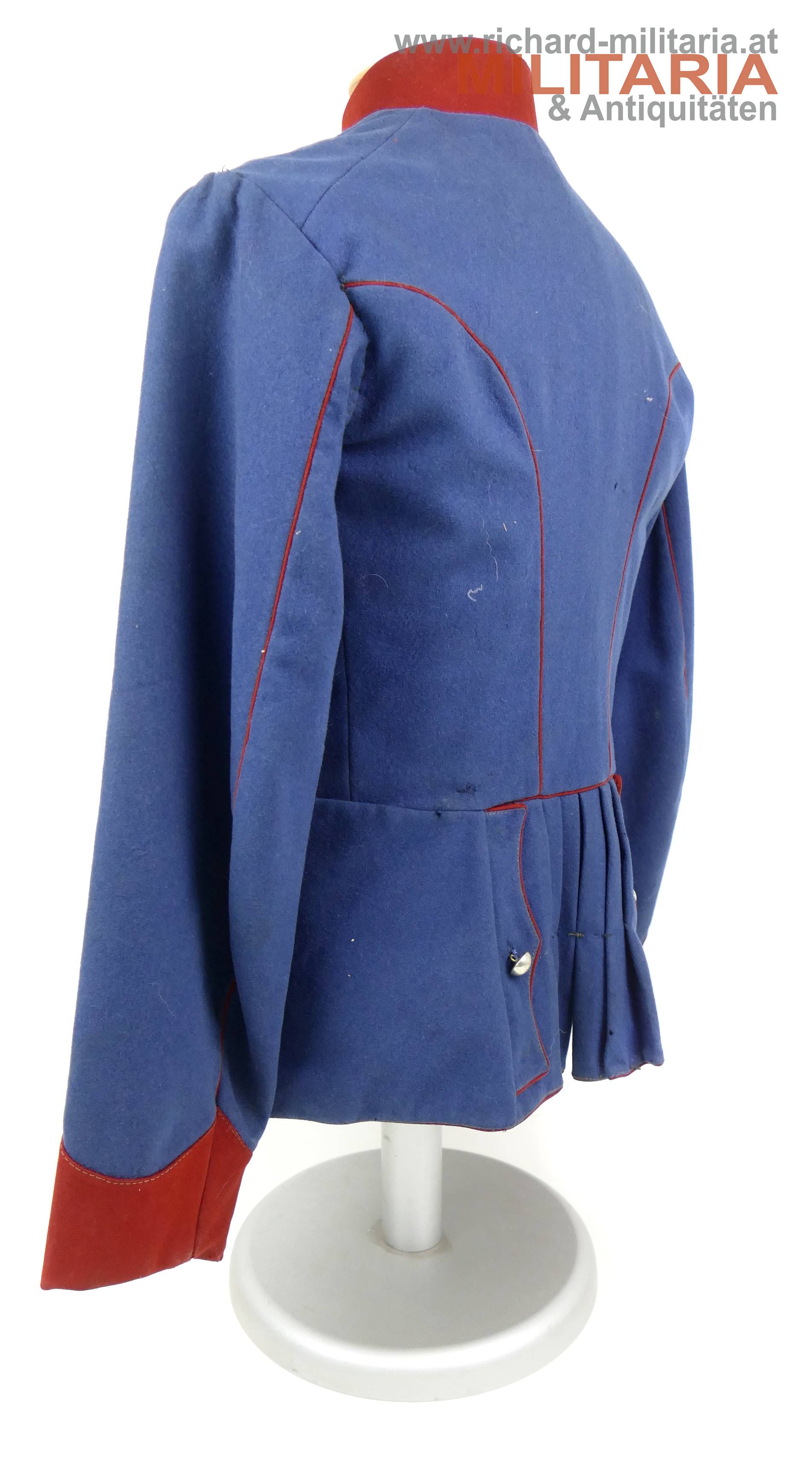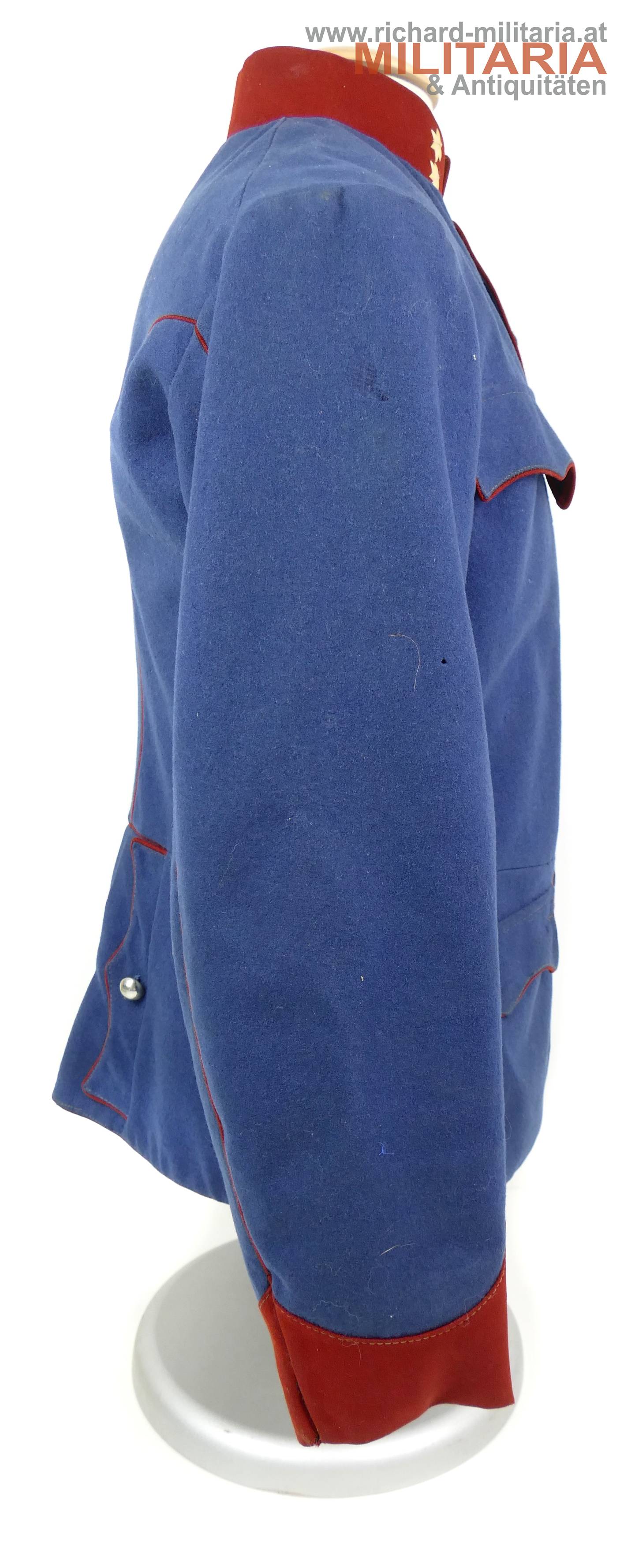 k.u.k. Ulanka für einen Korporal; grober lichtblauer Mannschaftswollstoff mit krapproten Vorstößen, Kragen und Ärmelaufschlägen; am roten Kragen je 2 Sterne aus Bein aufgenäht; innen im Kragen weißes Leinen eingenäht; einreihig zu 10 silbernen glatten Kompasseln - 1 Knopf fehlt; auf der linken Schulter fehlt die Achselschlinge (deutliche Sitzspuren und geöffnter Achselwulst); minimale Mottenlöcher; innen mit Futterleinen ausgelegt; darauf diverse Monturdepot- und Herstellerstempelungen und handschriftliche Namensvermerke im Futter; händisch eingenähte Brusttasche innen;