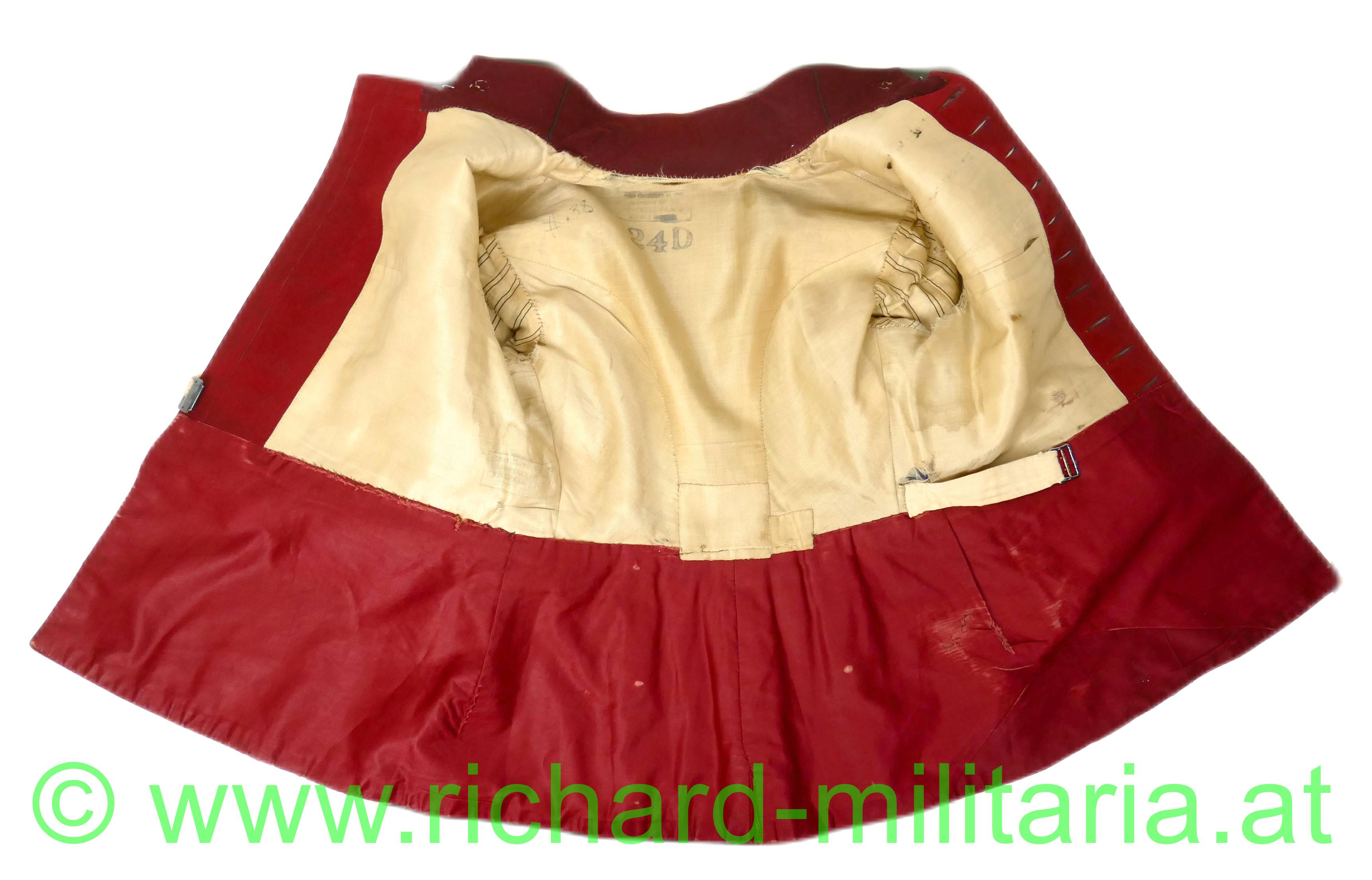 Ulanka für einen Leutnant der Ulanen, lichtblaues Tuch mit krapproten Kragen- und Ärmelaufschlägen, die 10 halbrunde Knöpfe (Kompasseln) sind versilbert, Stehkragen und geschweifte Ärmelaufschläge ebenfalls aus krapprotem Wolltuch in gleicher Qualität; 4 eingesetzte Taschen jeweils mit geschweiften Taschenpatten; Vorstöße und Rockkanten aus krapprotem Wolltuch; auf der linken Schulter eine aus Goldgespinst schwarz durchwirkt ausgeführte Achselschlinge; innen der Oberteil mit Futterleinwand und der Schossteil mit rotem Seidenstoff gefüttert; auf der Futterleinwand mehrere Stempelungen;