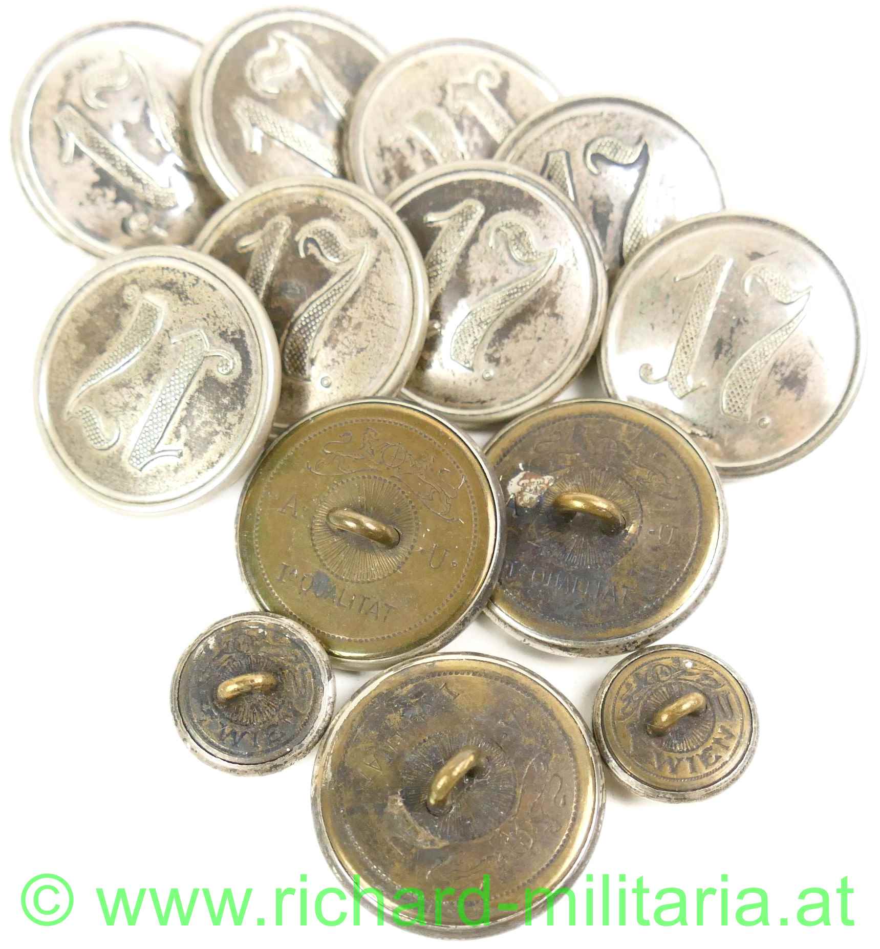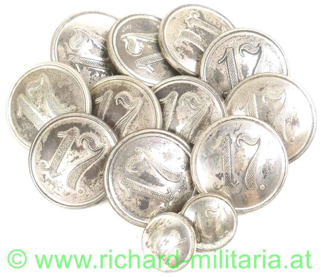 k.u.k. Uniformknöpfe - Landwehr-Infanterieregiment Nr. 17, Weißmetall mit erhaben geprägter Regimentsnummer, auf der Rückseite mit Hersteller und Öse - DM ca.: 24,5 cm davon 11 Stk. und 2 Stk. mit DM ca.: 14 mm,