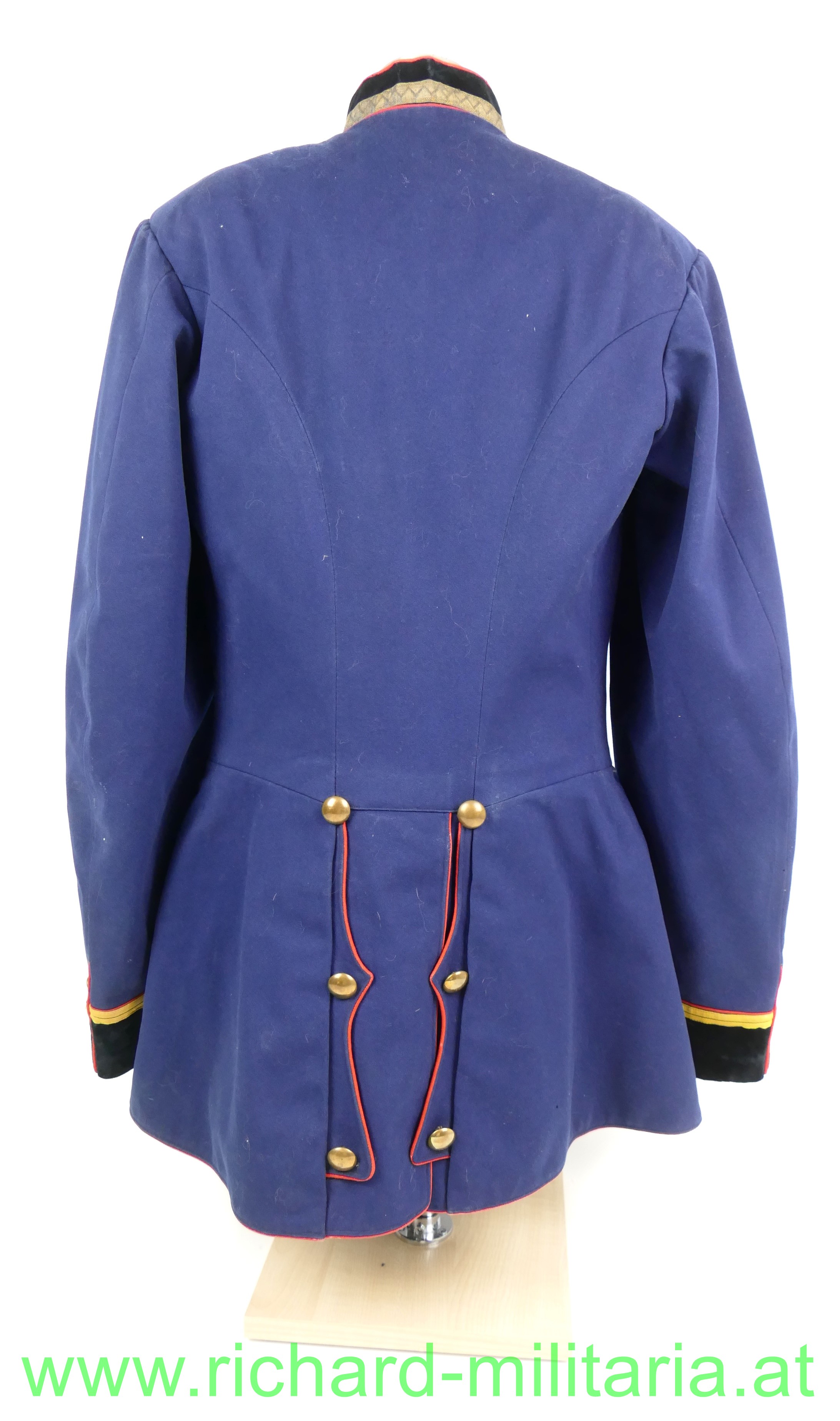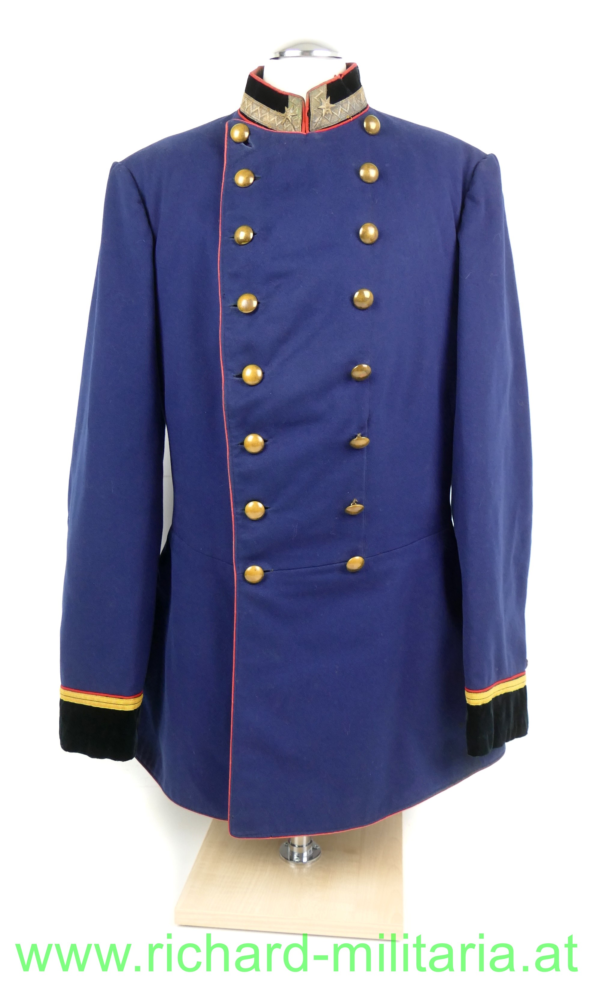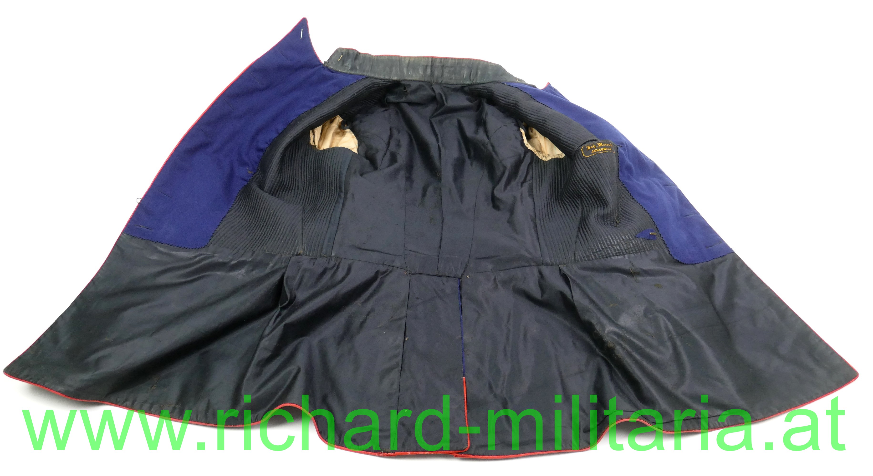 k.u.k. Uniformrock für einen einjährig freiwillig Fähnrich beim Medizin-ärztlichen Offizierskorps; dunkelblauer Waffenrock mit schwarzem Samtkragen und Ärmelaufschlägen und roten Vorstößen, zweireihig zu je 8 goldenen (gelben) Knöpfen, feines Wolltuch, am Kragen links und rechts über der kaisergelben Borte je 1 metallener Stern (Fähnrich) aufgenäht; der Innenteil mit schwarzer Seide ausgelegt, Schneider- oder Trägeretikett: "Johann Maresch, Innsbruck", leichte Tragespuren; alle Knöpfe und Effekten original vernäht!