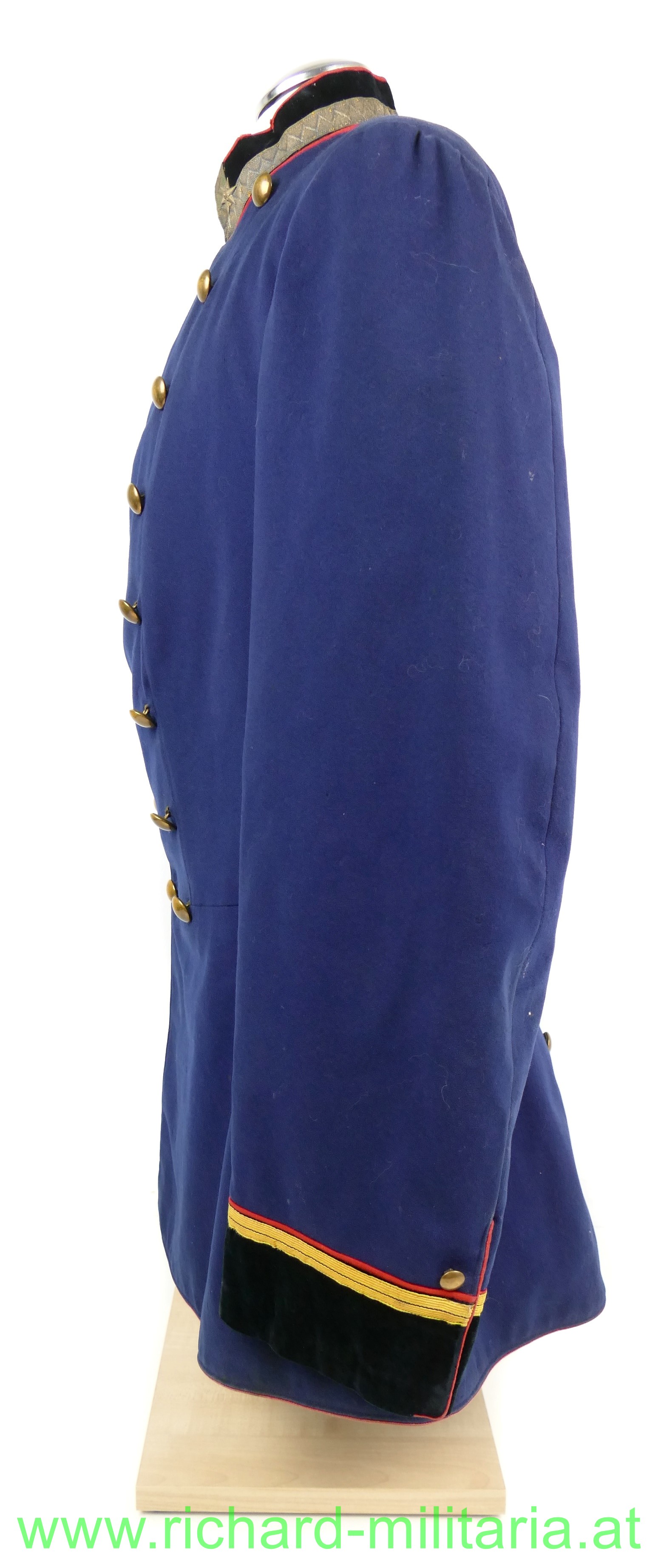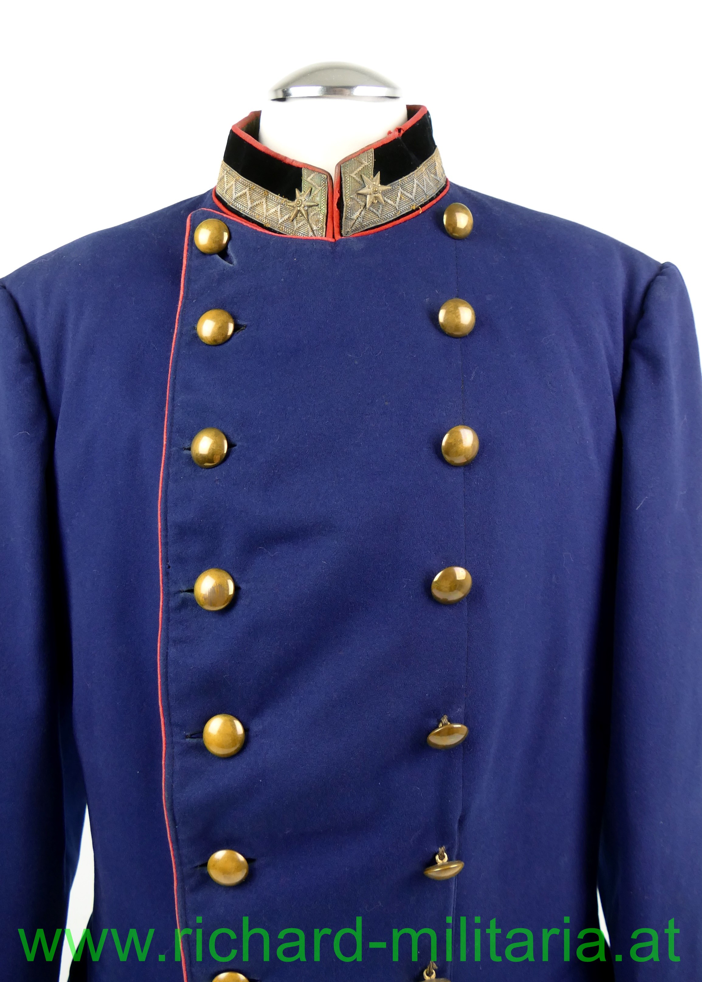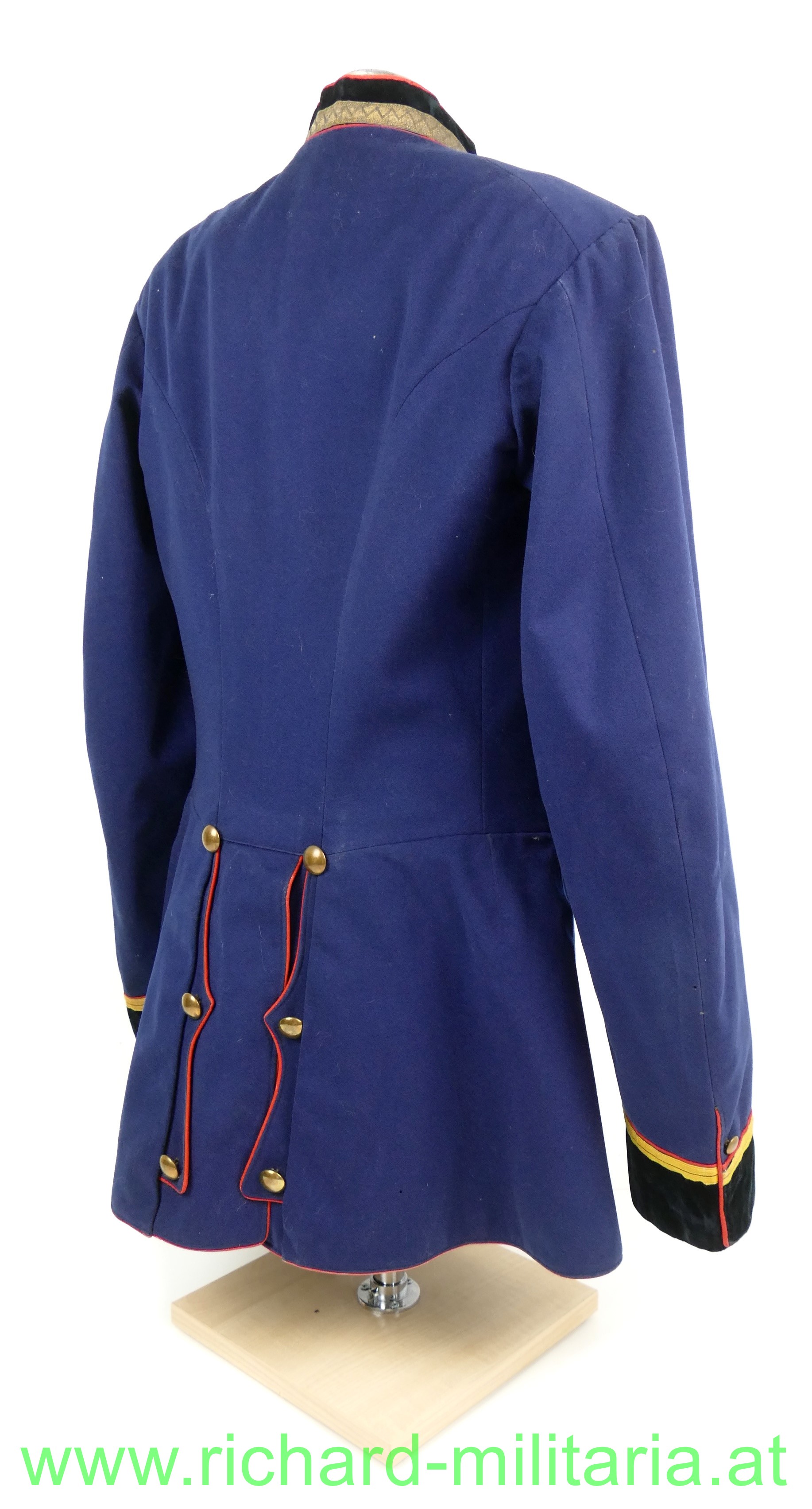 k.u.k. Uniformrock für einen einjährig freiwillig Fähnrich beim Medizin-ärztlichen Offizierskorps; dunkelblauer Waffenrock mit schwarzem Samtkragen und Ärmelaufschlägen und roten Vorstößen, zweireihig zu je 8 goldenen (gelben) Knöpfen, feines Wolltuch, am Kragen links und rechts über der kaisergelben Borte je 1 metallener Stern (Fähnrich) aufgenäht; der Innenteil mit schwarzer Seide ausgelegt, Schneider- oder Trägeretikett: "Johann Maresch, Innsbruck", leichte Tragespuren; alle Knöpfe und Effekten original vernäht!