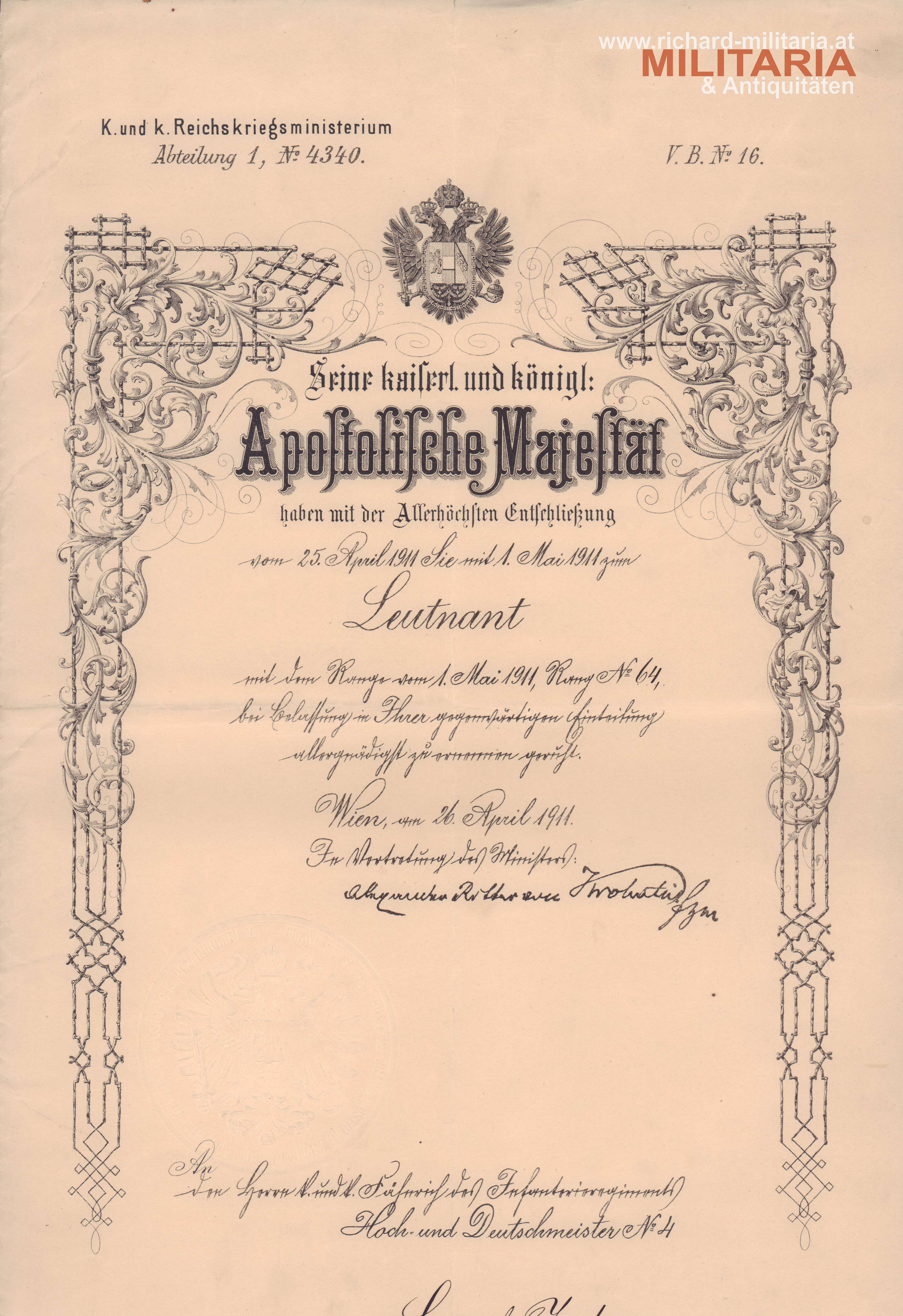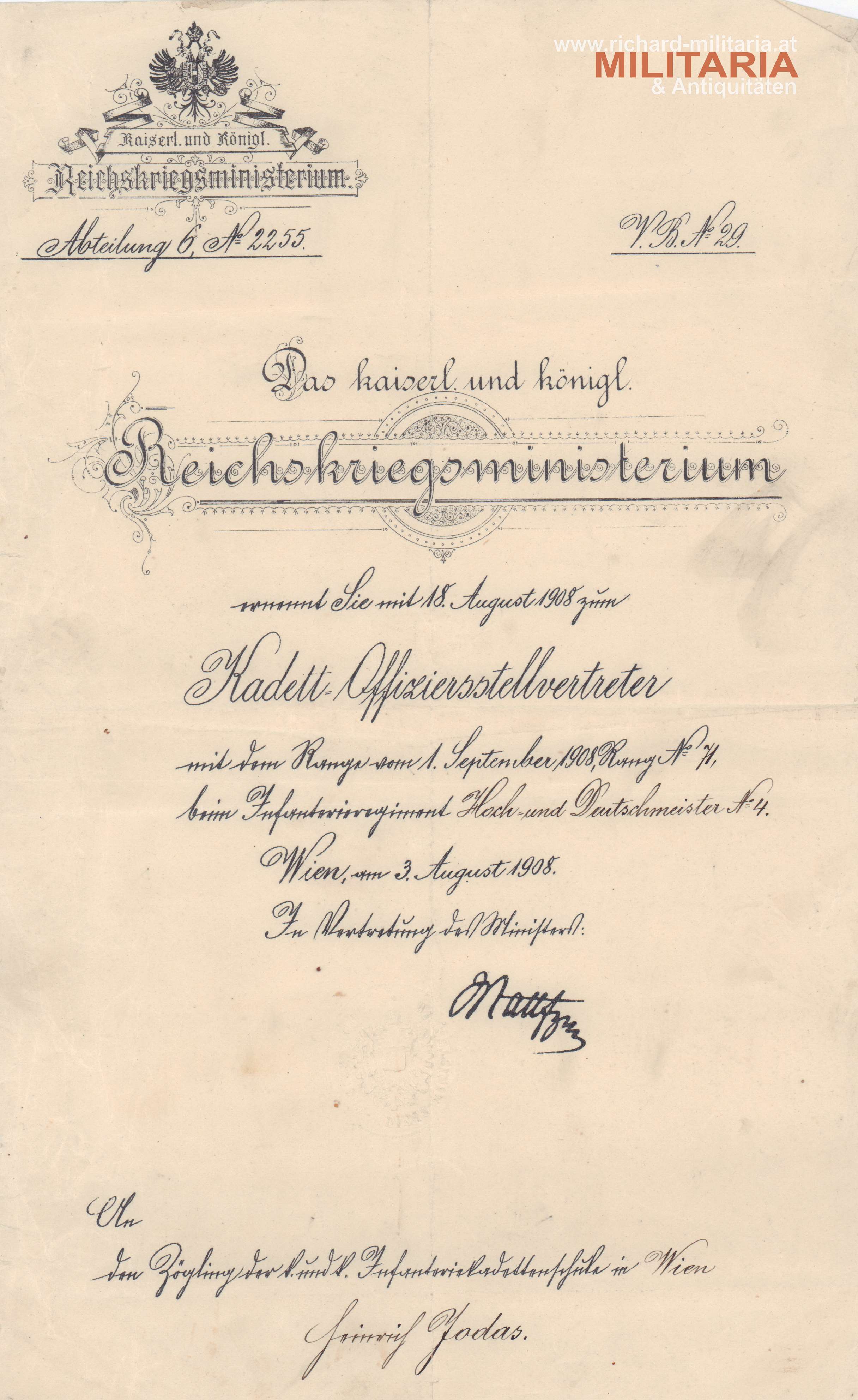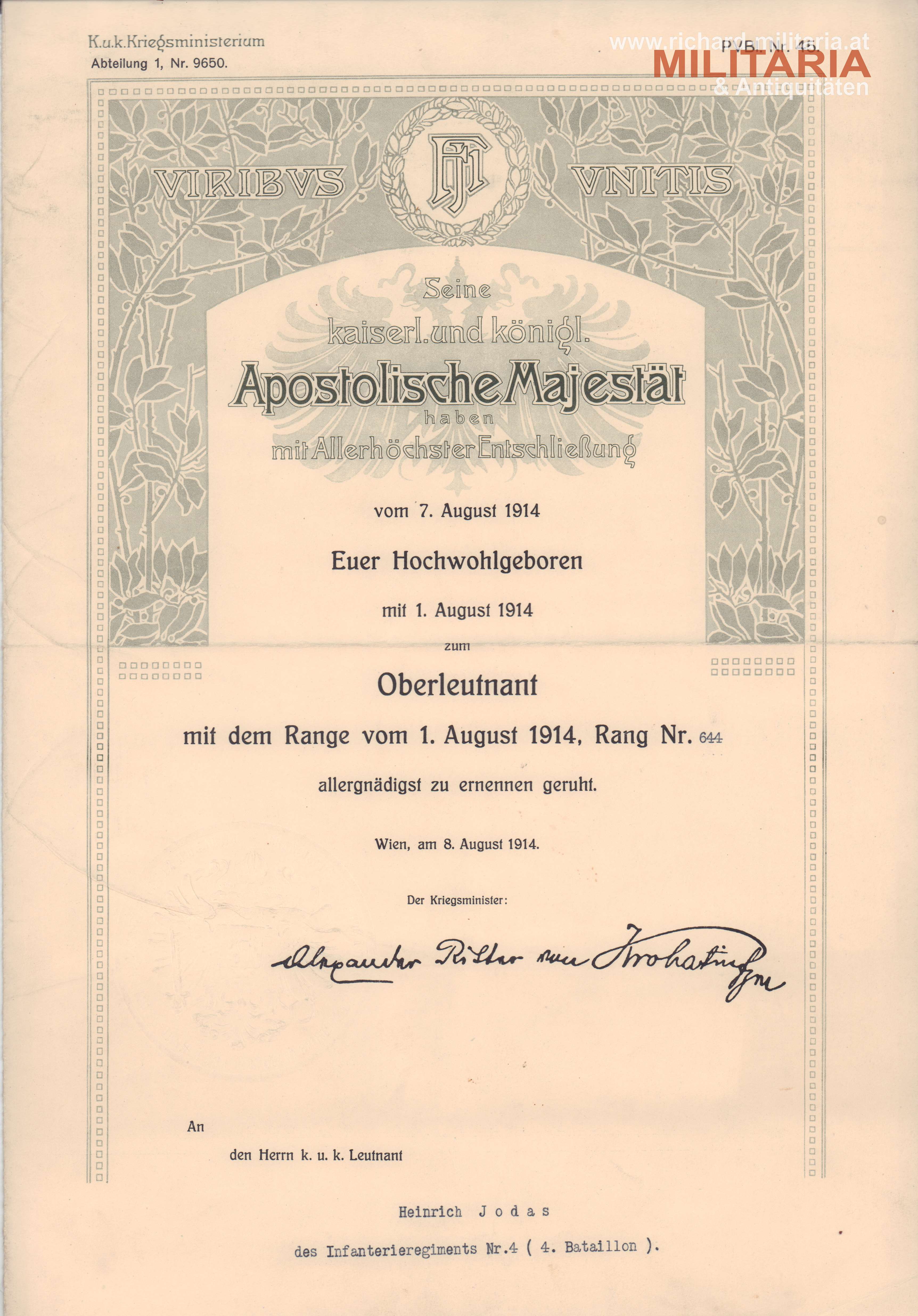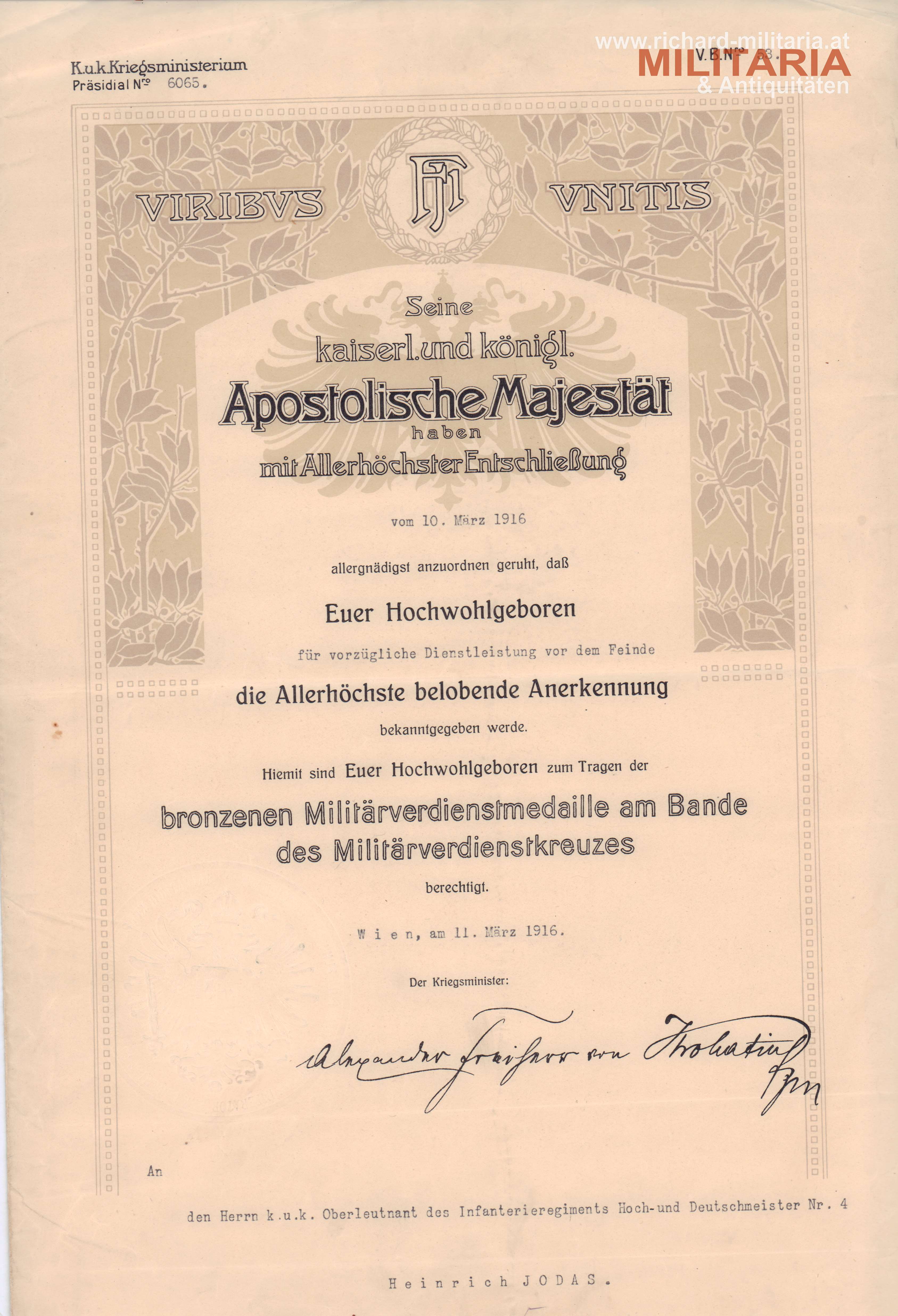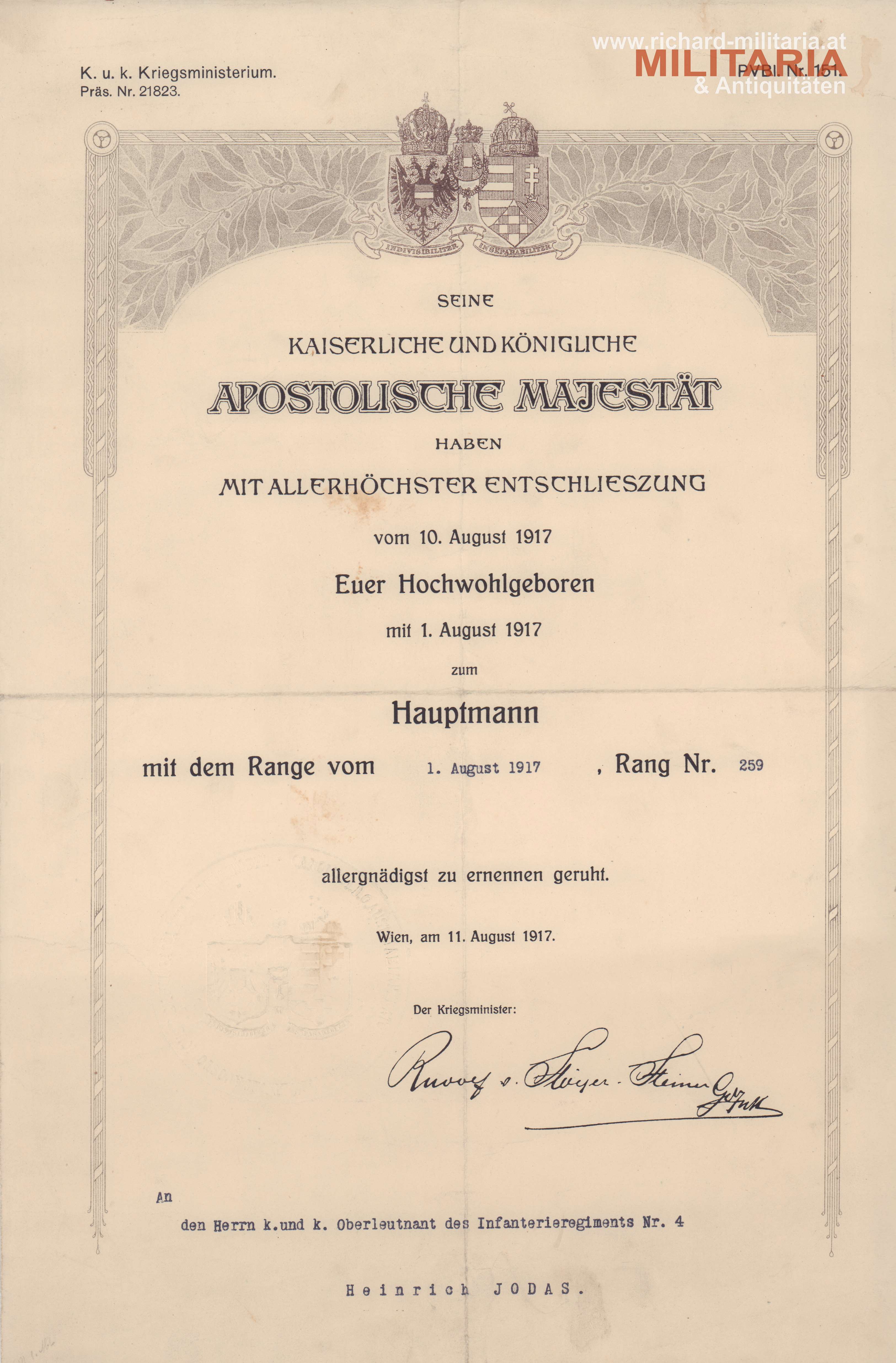 k.u.k. Urkundenkonvolut des Hauptmannes Heinrich Jodas vom niederösterreichischen Infanterie Regiment 4 (Hoch- und Deutschmeister); Ernennungsurkunde zum Kadett-Offiziersstellvertreter am 3. August 1908; Urkunde zur Ernennung zum Leutnant am 25. April 1911; Ernennung zum Oberleutnant am 1. August 1914, sowie die Ernennung zum Hauptmann am 1. August 1917; beiliegend auch die Urkunde zur bronzenen Militärverdienstmedaille am Bande des Militärverdienstkreuzes mit Schwertern am 11. März 1916;