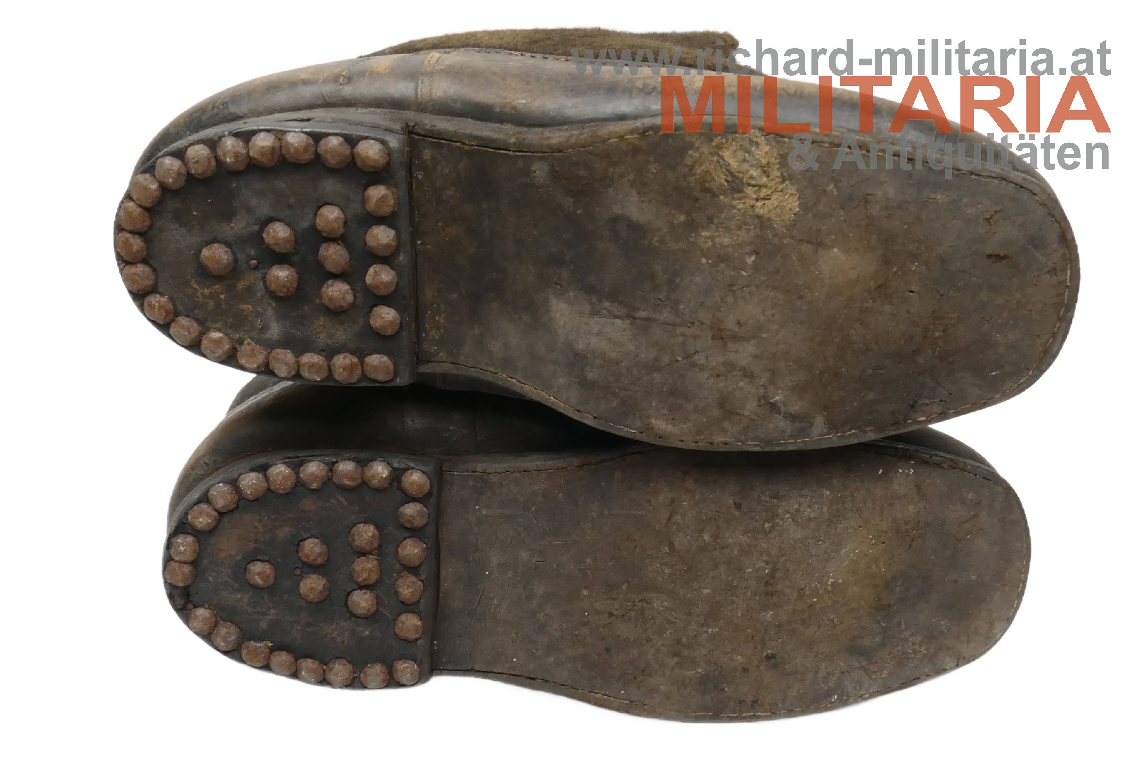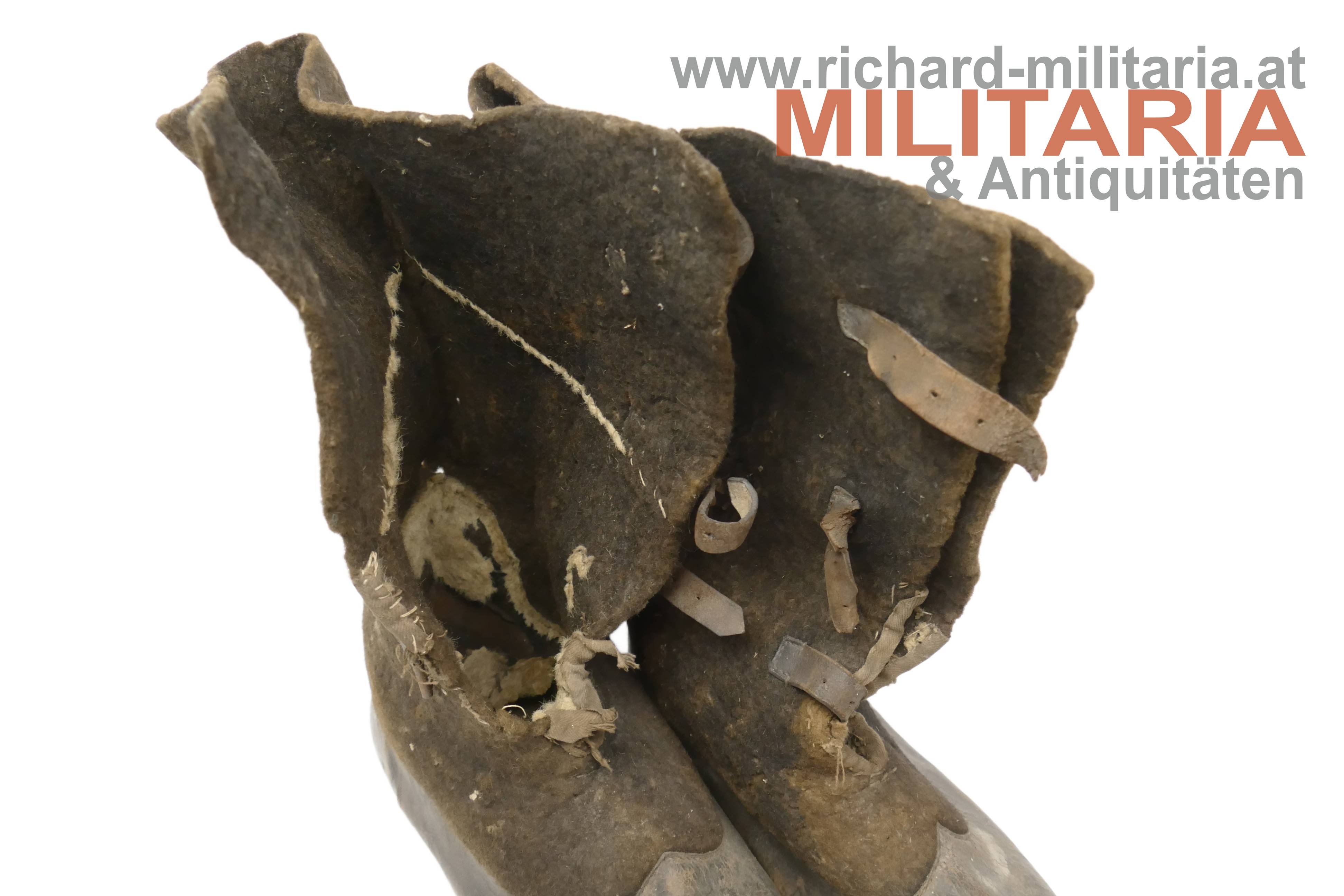 k.u.k. Winterüberziehstiefel - sogenannte Wachstiefel; am Absatz benagelte Ledersohle und Schuhrand, dieser vorne und hinten hochgezogen; Stiefelhöhe aus naturfarbigem Wollfilz mit je 3 Lederlaschen zum Verschließen; Übergröße - ca. 55 (!); ungereinigter Fundzustand