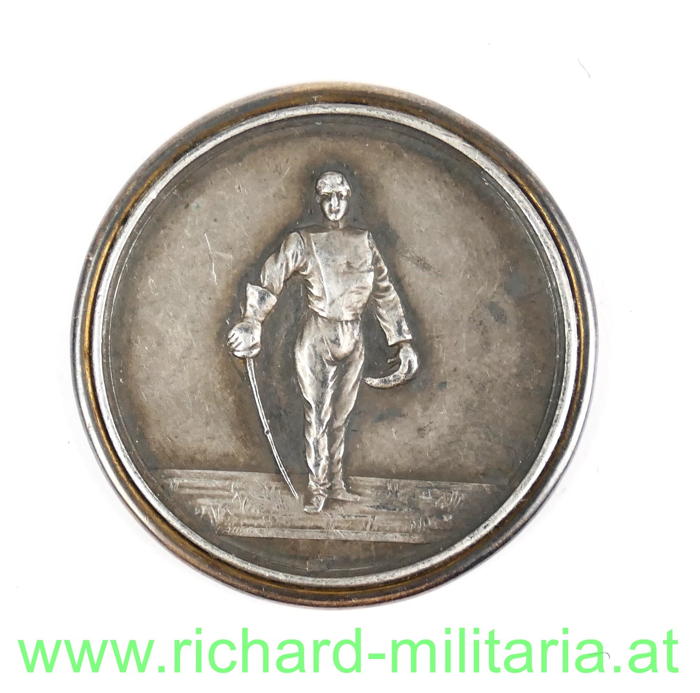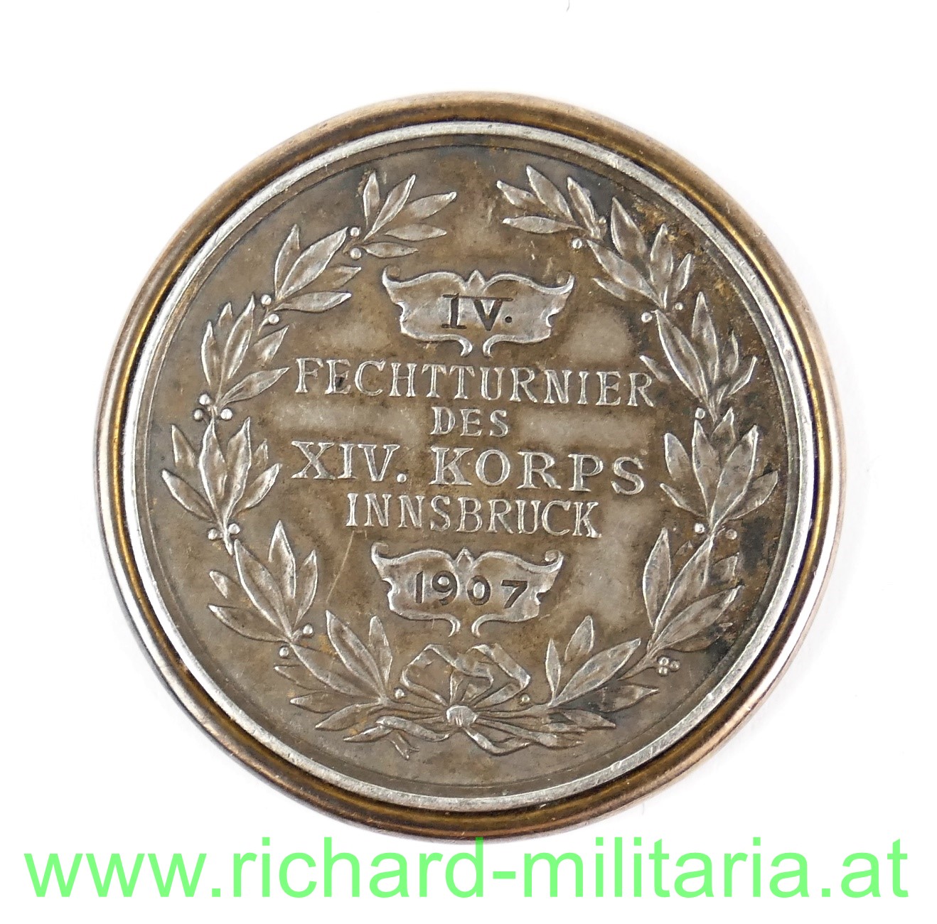 Silberne Medaille für den IV. Platz beim Fechtturnier des k.u.k. XIV. Korps in Innsbruck 1907; Silbermedaille undeutlich punziert; Stempelschneider Lauer; Durchmesser 33,5 mm