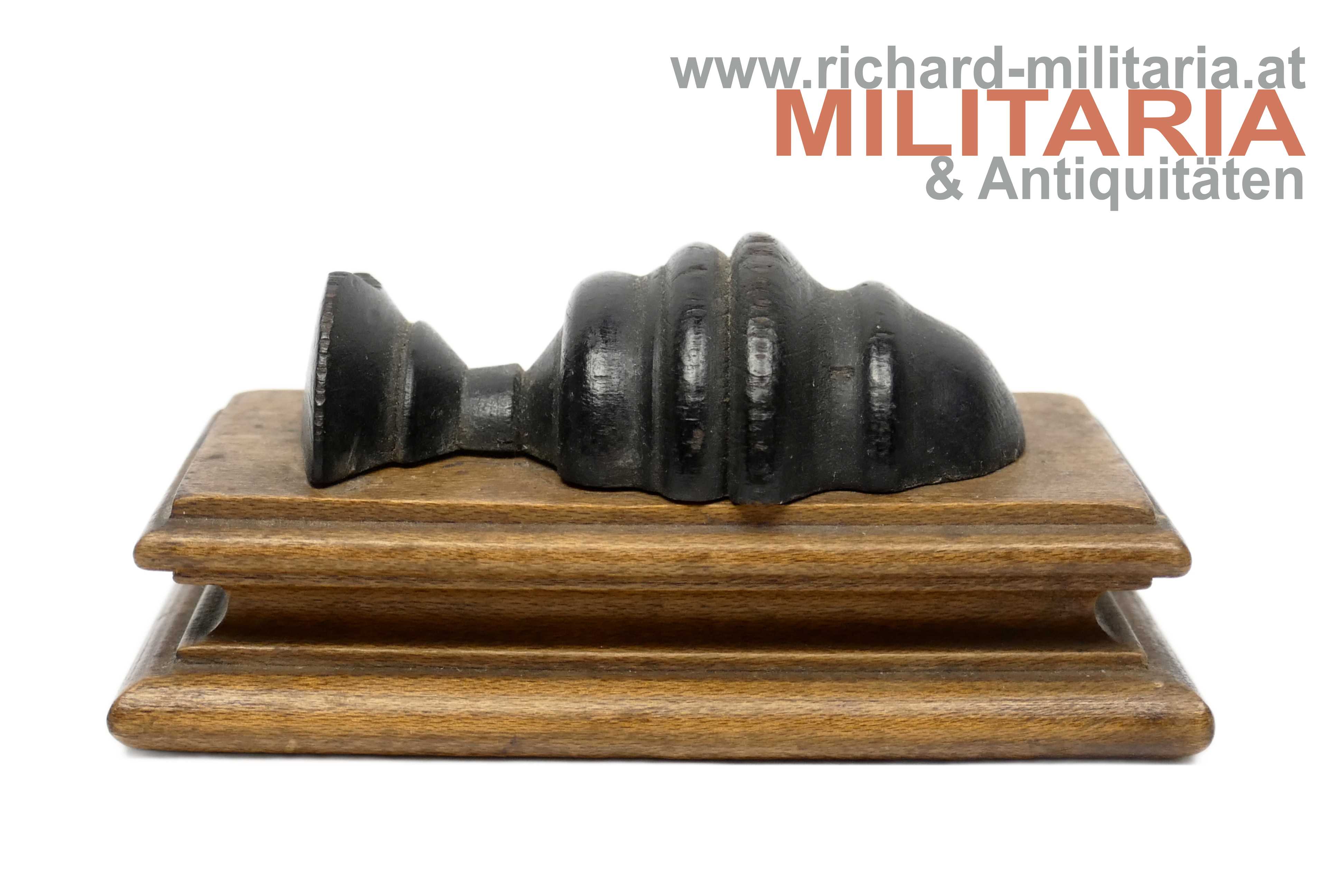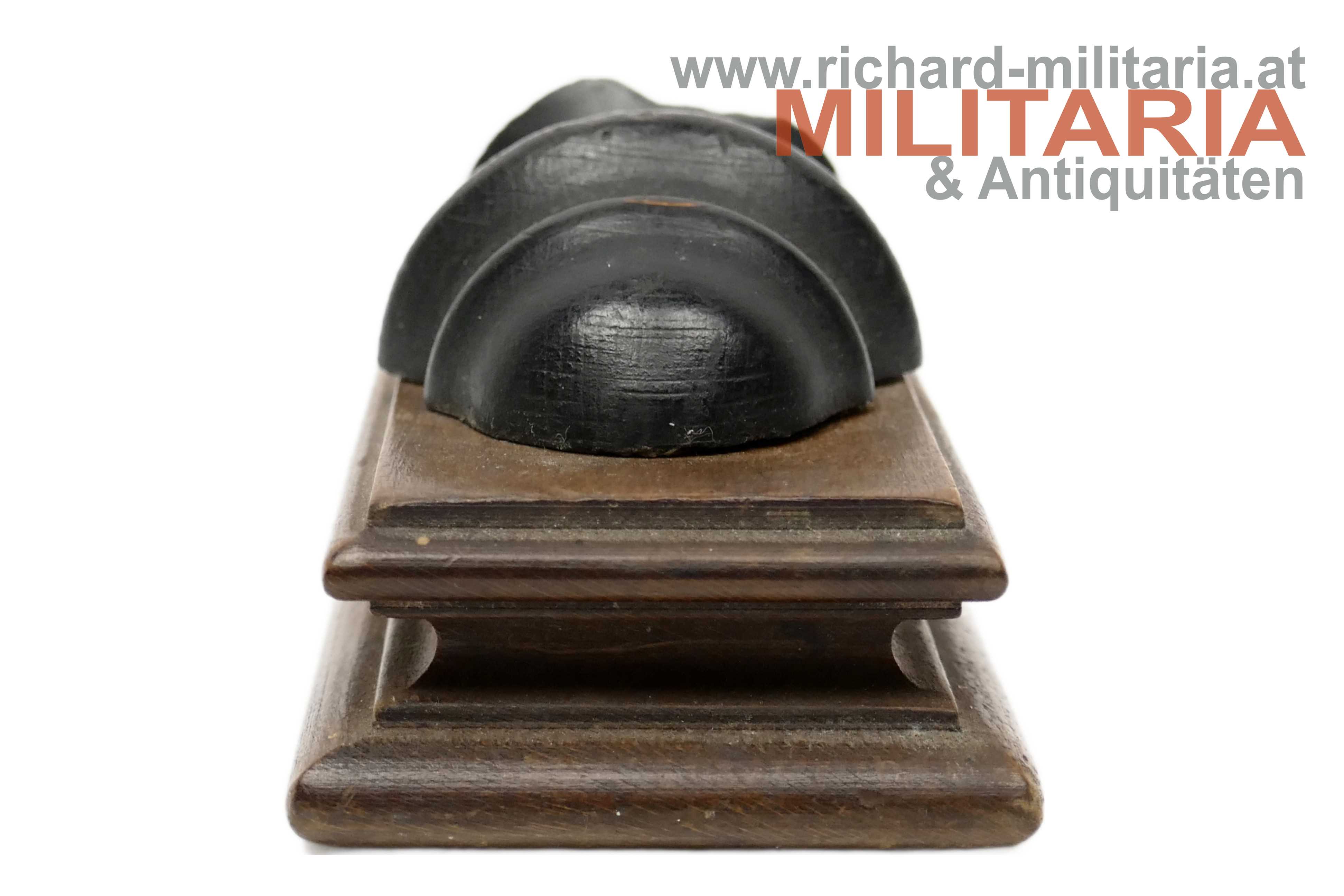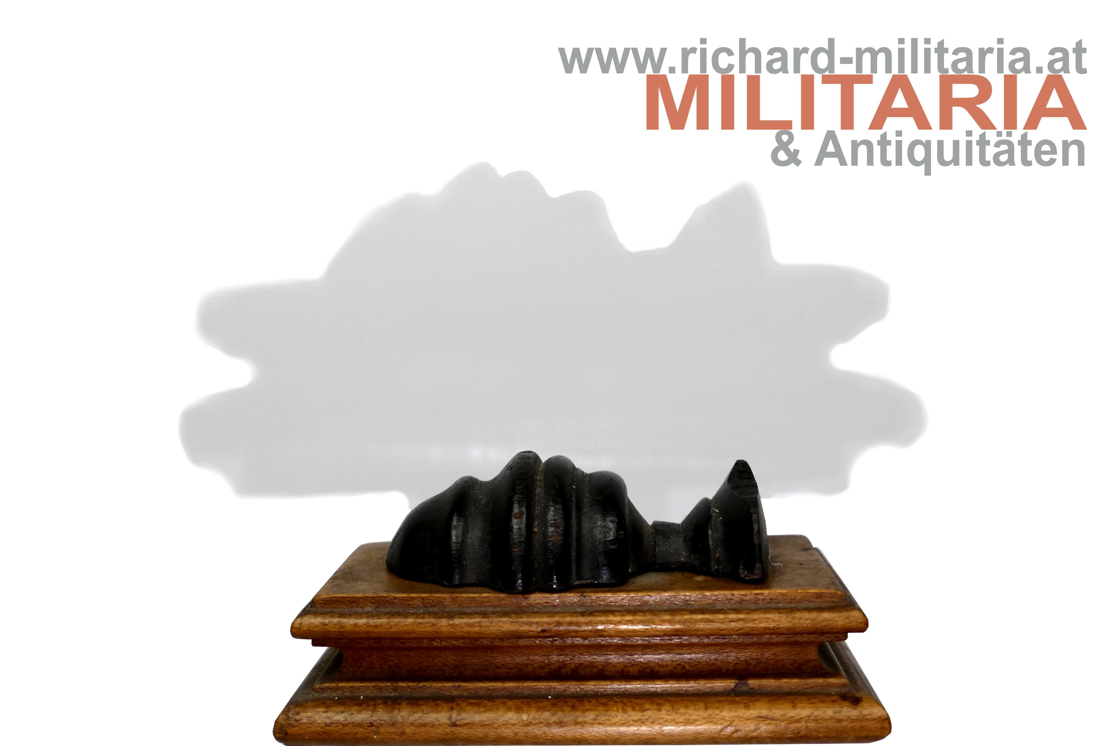 Kaiser Franz Josef - Schattenbild; abstraktes Holzrelief aus dunkel gebeiztem Holz auf einem Holzsockel; bei seitlicher Ansicht erscheint ein Schattenbild von Kaiser Franz Josef (!); auf der Rückseite Prägestempel "FRZ. Josef I"; kleine Scharte im Sockel des Schattenbildes (keine Beeinträchtigung).