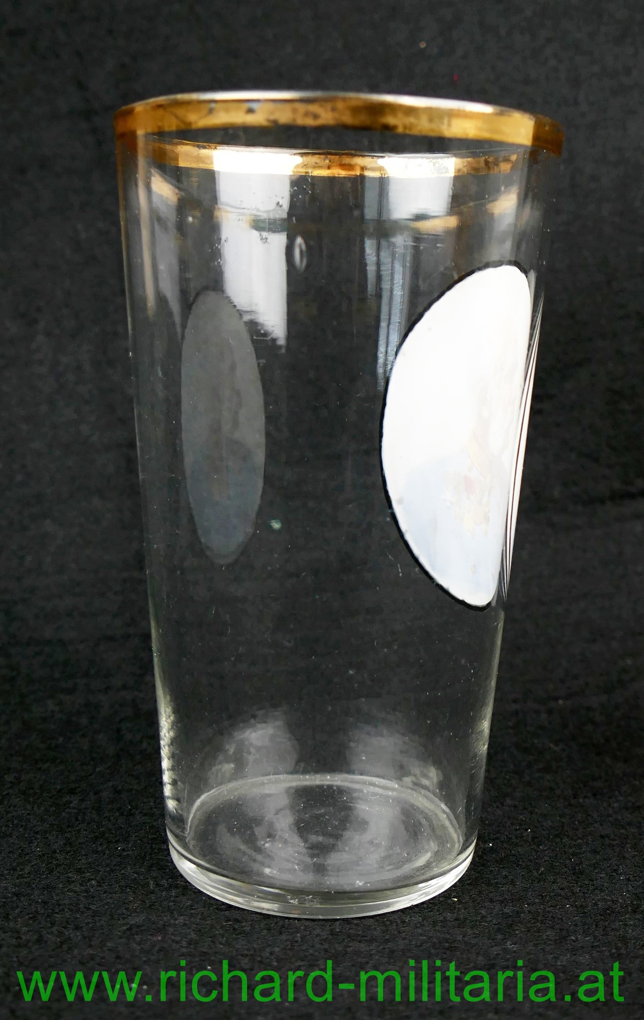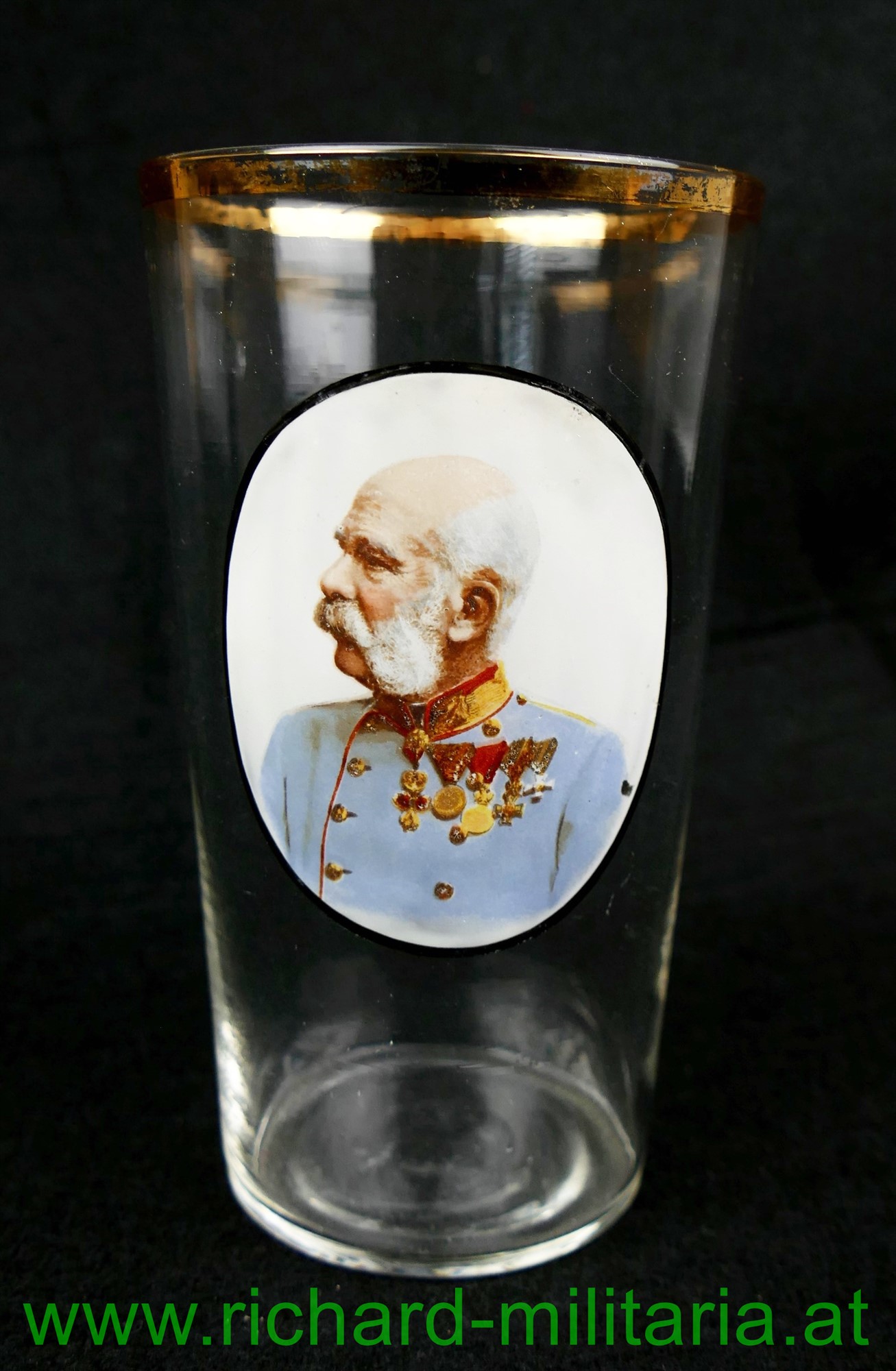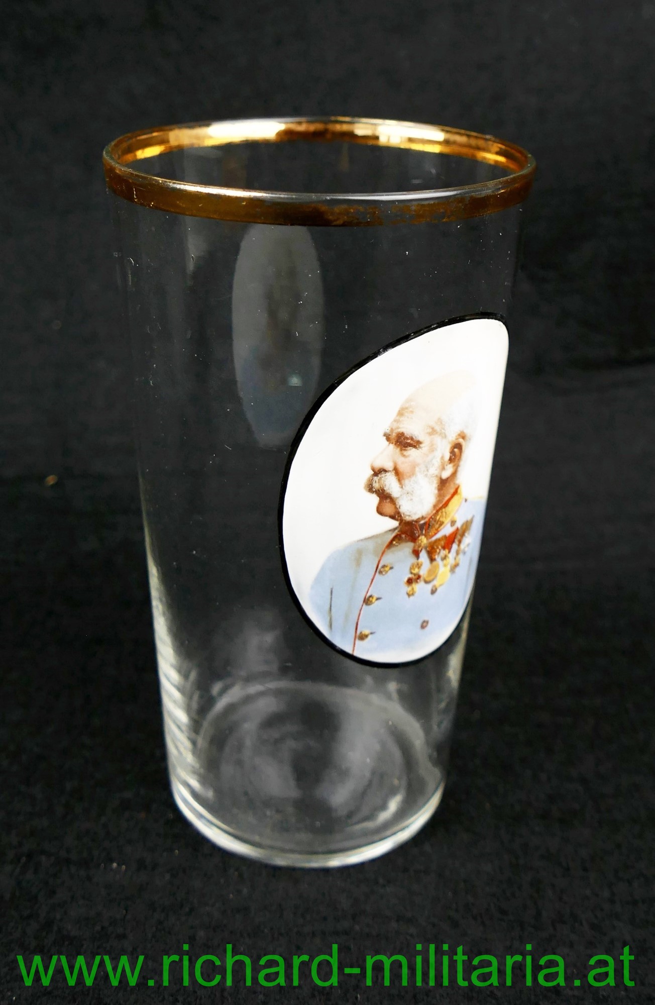 Trinkglas mit farbiger Darstellung von Kaiser Franz Josef, dünnes Glas mit Goldrand; Höhe 12,5 cm.